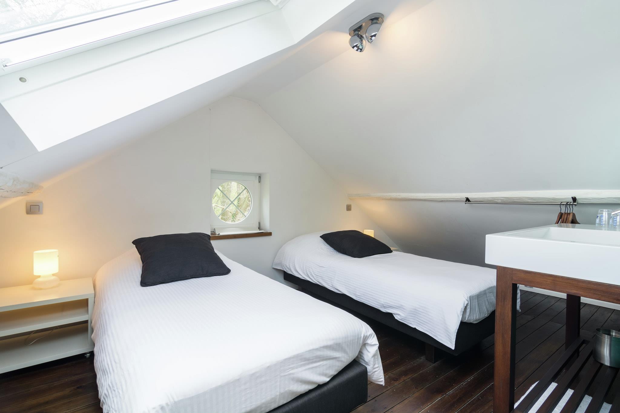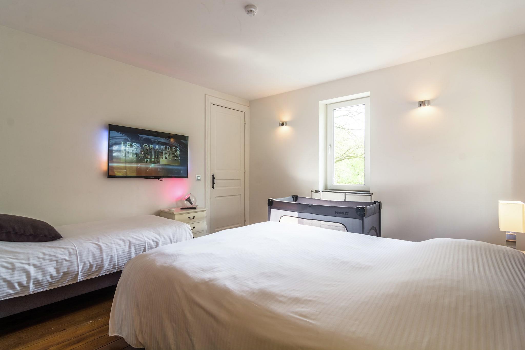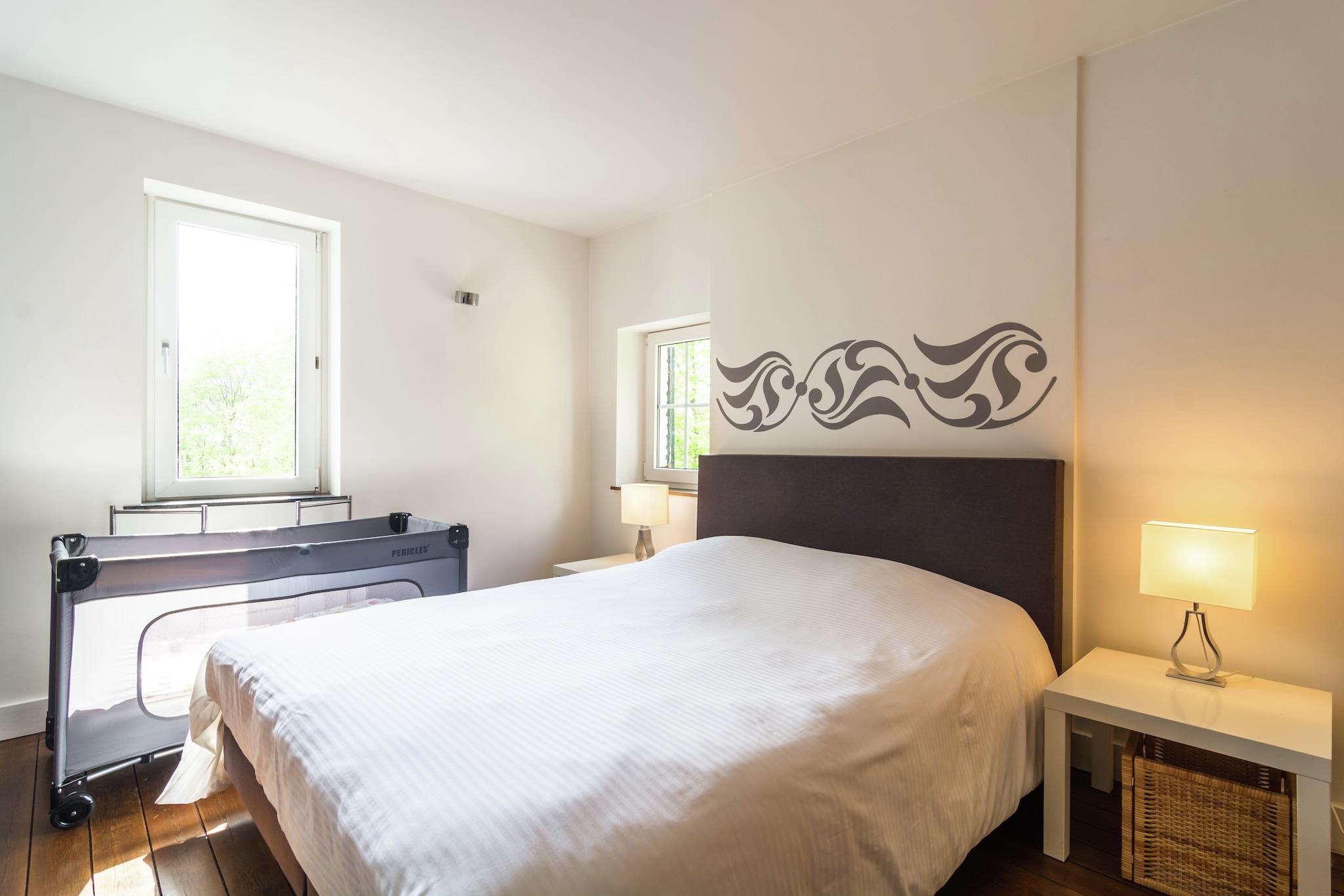 Dette smukke feriehus ligger i Dalhem, 8 km fra Aubel by, på grænsen mellem Flandern og Holland. Huset ligger på en lille bakke med træer og græsarealer og er et ideelt tilbagetog for en ferie med hele familien. Huset er meget smagfuldt indrettet og nogle af væggene er dækket af friske, muntre farver. Efter en dag i udendørs luften vil du søge afslapning i saunaen eller nyde den knitrende pejs i den hyggelige stue. Det er meget behageligt at sidde på den overdækkede terrasse om sommeren, hvor du også kan grille. kan nyde sig på trampolinen i den charmerende have eller i legepladsen. Dette sommerhus er rettet mod familier. Du er i det kuperede Aubel-område, kendt for sine frugter og specialiteter, cider! Ravel-ruten for cyklister er 7 km væk, og der er vandsportsmuligheder i en afstand af 22 km ved Gileppe-søen. Andre attraktioner er de gamle mines Blégny (8 km), klosteret i Val Dieu (6 km), den middelalderlige landsby Limbourg 6 km) og byen Liège.