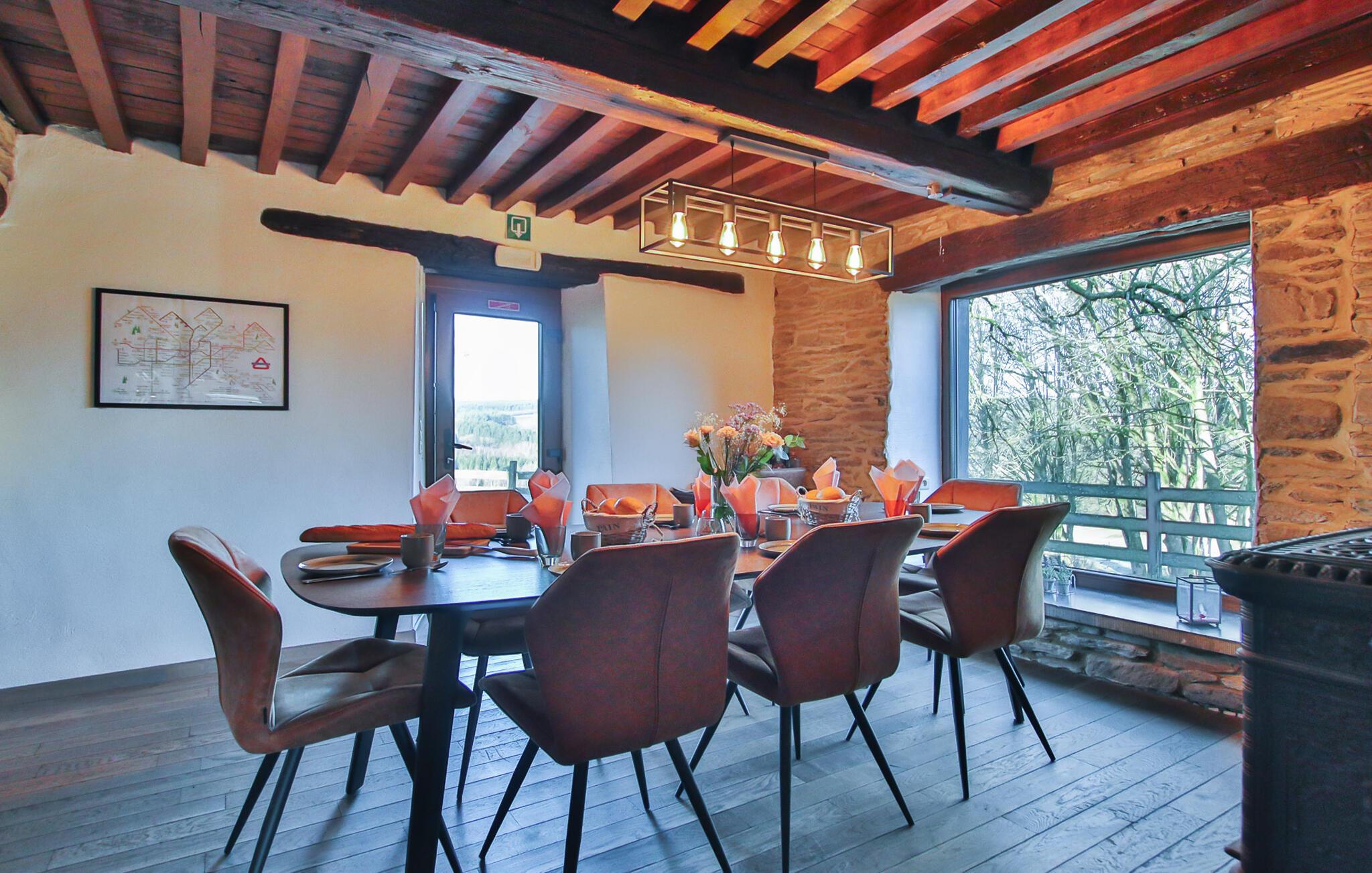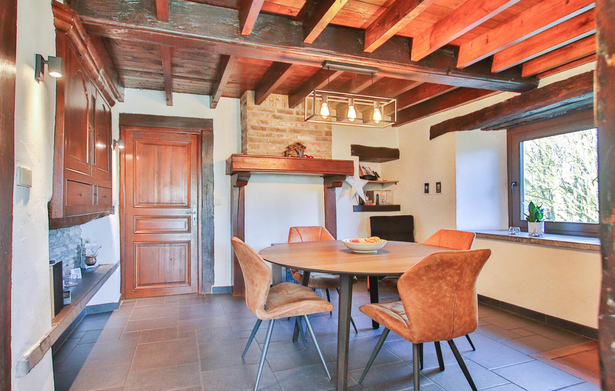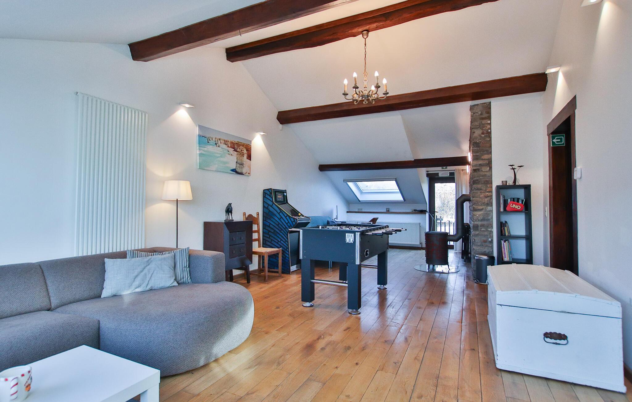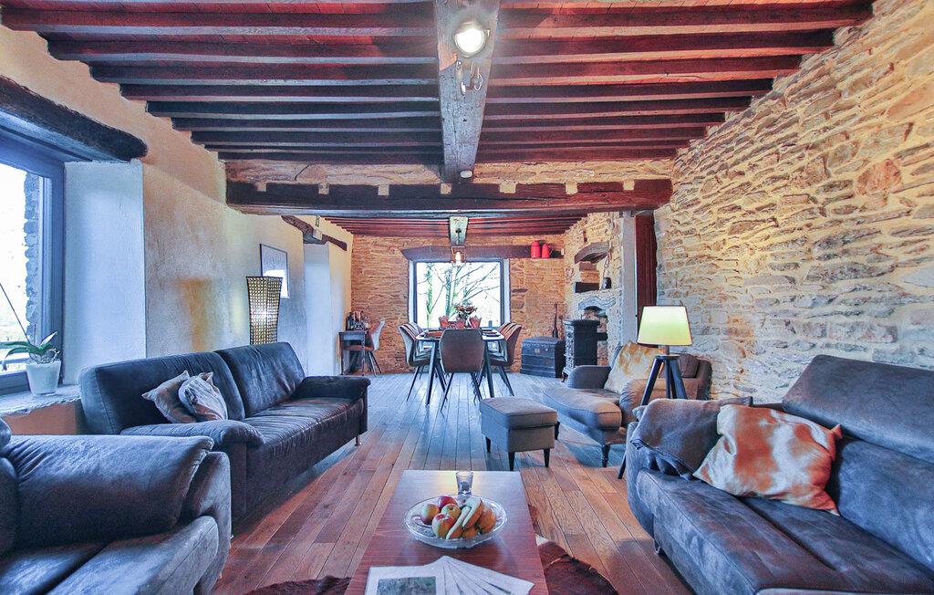 Tilbring jeres ferie i dette smagfuldt renoverede feriehus og oplev en perfekt blanding af tradition og komfort. Træd ind i den rummelige opholdsstue med synlige træbjælker og massive naturstensvægge, der giver huset sin karakteristiske karakter. Gør det behageligt på en af ??de hyggelige sofaer og nyd varmen fra den åbne pejs. slå jer ned ved det lange spisebord med udsigt over det grønne og tilbring hyggelige aftener sammen eller udfordr jeres medrejsende til et spil bordfodbold eller bobslæde. Ovenpå venter en hyggelig stue med ovenlysvinduer og komfortable siddepladser på jer.