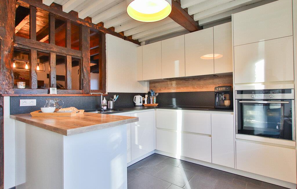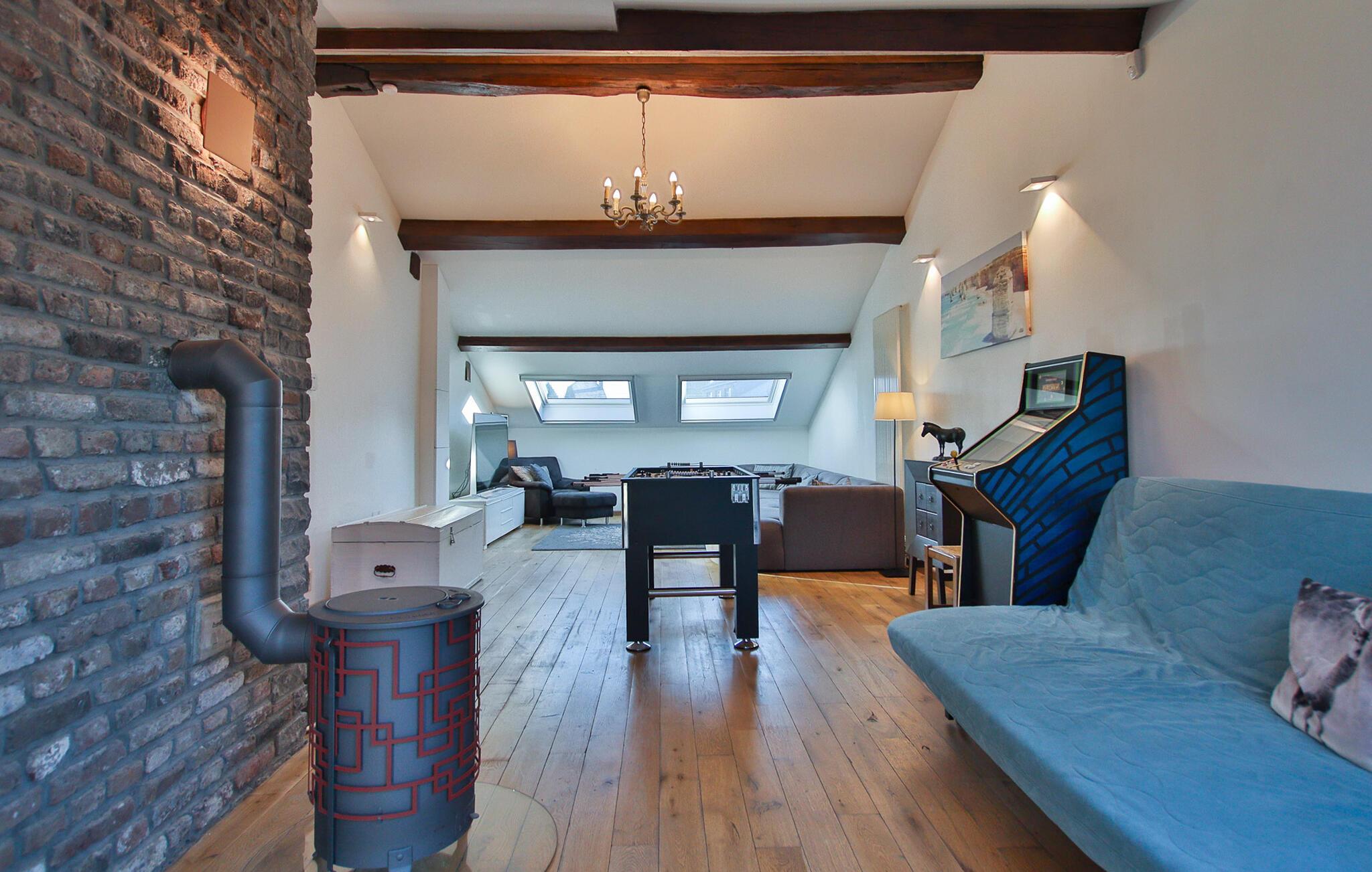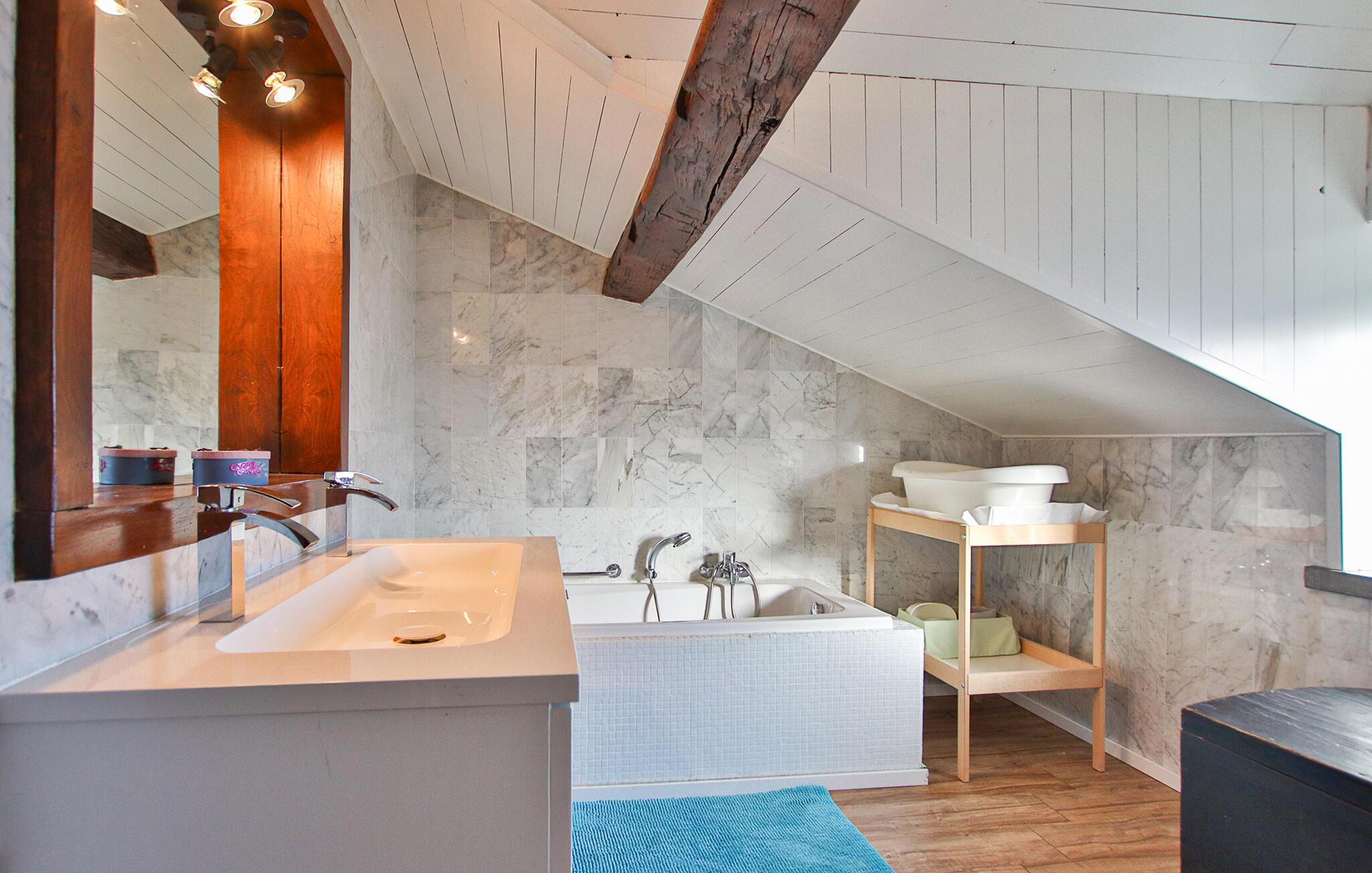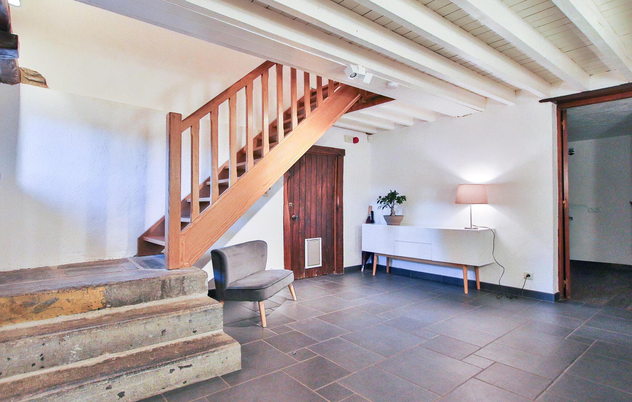 Tilbring jeres ferie i dette smagfuldt renoverede feriehus og oplev en perfekt blanding af tradition og komfort. Træd ind i den rummelige opholdsstue med synlige træbjælker og massive naturstensvægge, der giver huset sin karakteristiske karakter. Gør det behageligt på en af ??de hyggelige sofaer og nyd varmen fra den åbne pejs. slå jer ned ved det lange spisebord med udsigt over det grønne og tilbring hyggelige aftener sammen eller udfordr jeres medrejsende til et spil bordfodbold eller bobslæde. Ovenpå venter en hyggelig stue med ovenlysvinduer og komfortable siddepladser på jer.