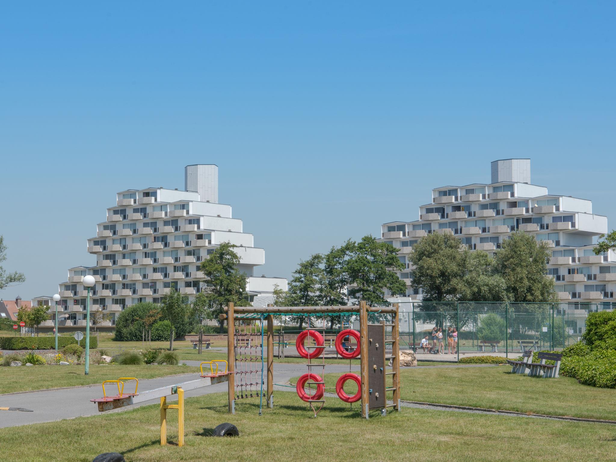 Vosseslag 3 km from De Haan aan Zee: Child friendly holiday development "Iris", 8 storeys, surrounded by fields. On the outskirts, 3 km from the centre of De Haan, 1 km from the sea, 1 km from the beach. For shared use: property 10 ha (fenced). Tennis, basketball, boccia, volleyball court, barbecue, children's playground. In the complex: lift, storage room for bicycles. Parking at the house. Supermarket 3 km, restaurant 500 m, bakery 400 m, tram "de Haan Vosseslag" 1 km, bus stop "Halte De Haan Violierenlaan" 650 m, railway station "Oostende" 10 km, sandy beach "De Haan" 1 km, nudist beach 2 km. Golf course (18 hole) 2 km. Nearby attractions: Brugge 17 km, Plopsaland 50 km, Gent 65 km, Sea Life Marine Park 13 km.