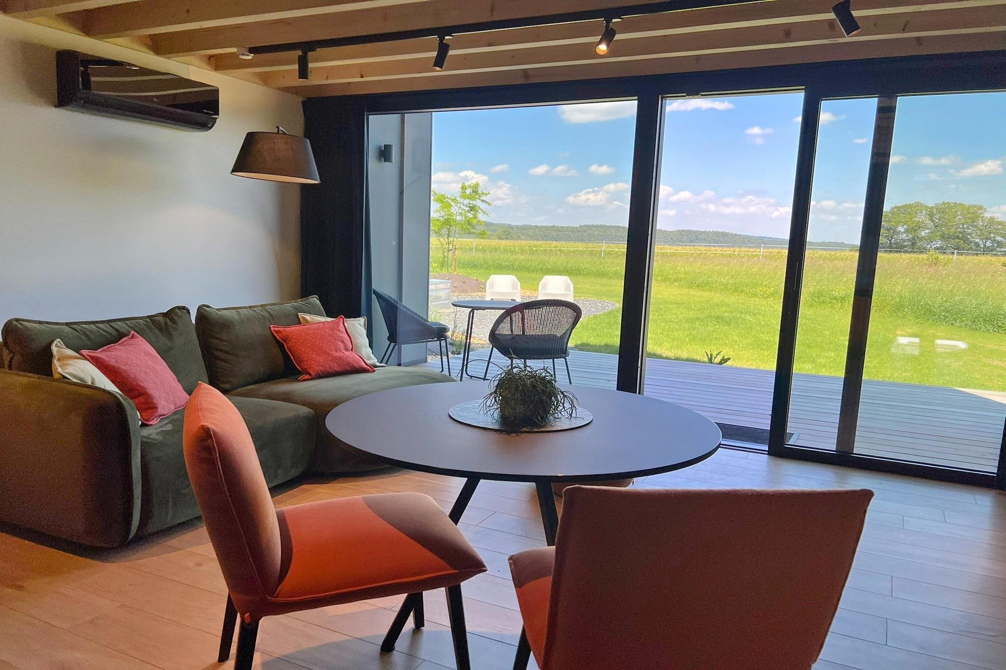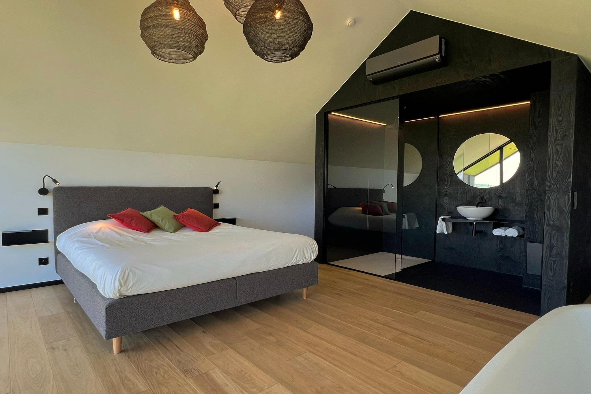 Flugt til en hyggelig og moderne lodge, perfekt til en romantisk ferie for to. Stueetagen byder på et fuldt udstyret tekøkken med en kombineret mikroovn, køleskab, kogeplader og en Nespresso-maskine samt en komfortabel stue med tv og WiFi. Et separat toilet tilføjer ekstra bekvemmelighed. Ovenpå kan du nyde et luksuriøst badeværelse med bruser og håndvask samt et soveværelse med en rummelig XL-dobbeltboks. Slap af i duo-badet, mens du nyder panoramaudsigten over den fantastiske Ourthe-dal. Den semi-overdækkede terrasse med havemøbler giver en betagende udsigt. Udenfor kan du slappe af i dit private afslapningsområde med et træfyret spabad, bålplads til hyggelige aftener og liggestole. Den fredelige have, som deles med tre andre hytter, omfatter en fælles swimmingpool. Beliggende kun få skridt fra maleriske Durbuy, er denne lodge en ideel base for gåture, cykling eller blot at nyde naturens ro.