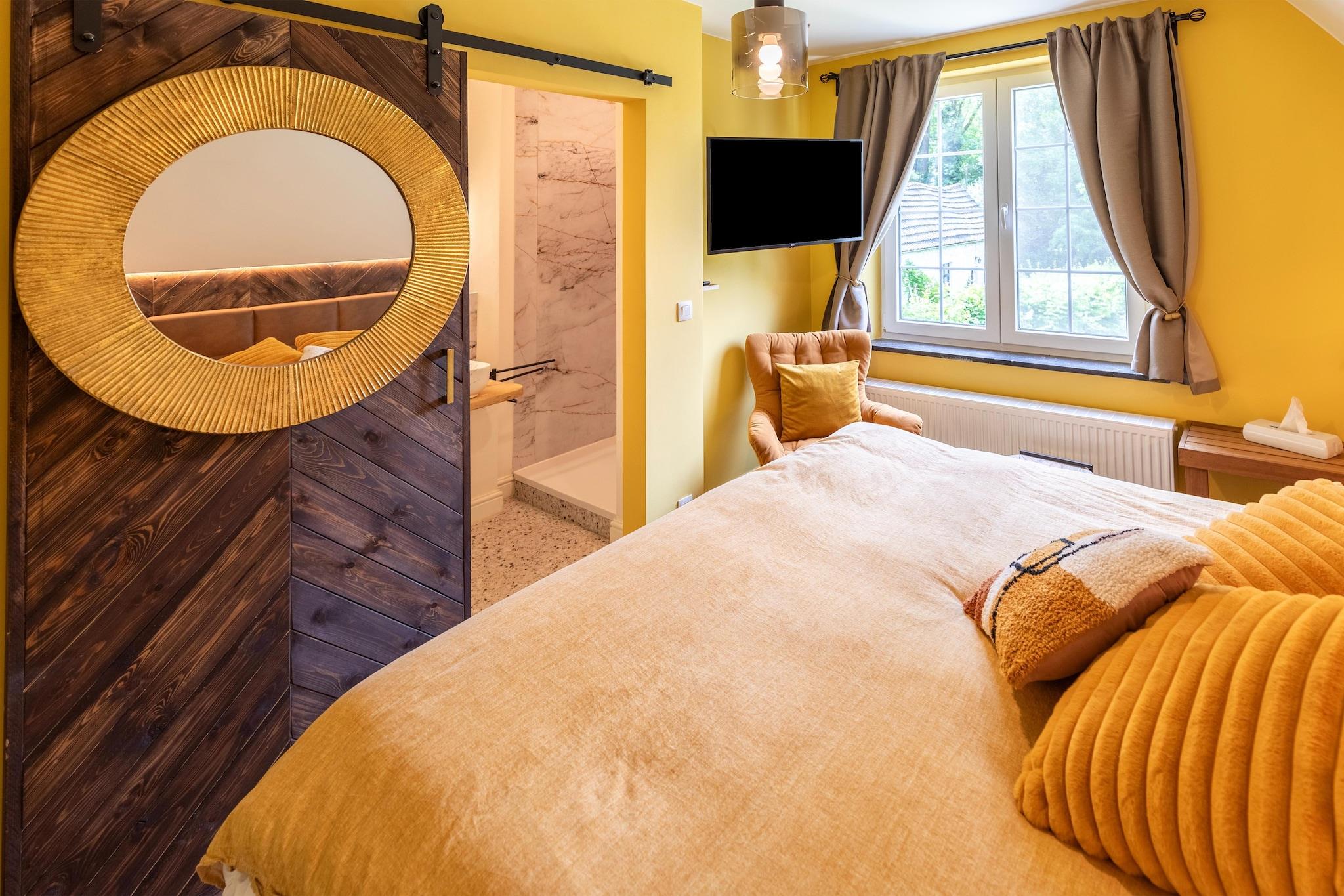 Velkommen til Manoir de Goyet, en fantastisk landejendom beliggende mellem skov og dal i Faulx-les-Tombes, nær Namur i den maleriske Samson-dal. Denne fortryllende 6-værelses herregård er den perfekte tilflugtssted for familier og grupper, der søger komfort, charme og luksus i hjertet af naturen. Hvert soveværelse har eget badeværelse, tv og Wi-Fi, hvilket sikrer komplet komfort og privatliv. Slap af i den private udendørs swimmingpool eller nyd det tilsluttede spabad. Indendørs kan du nyde hyggelige stunder ved baren, et spil billard, dart eller PlayStation, eller bare slappe af med en bog i den fredfyldte stue. Udendørs kan du samles omkring den autentiske finske grillhytte (Kota) til uforglemmelige måltider. Det store felt er ideelt til fodbold eller basketball, og 4 e-mountainbikes er tilgængelige til eventyrlige ture. Børn og dyreelskere vil elske de venlige geder, Sandy og Wendy. Det fuldt udstyrede køkken med kogeø, spisekammer, ekstra hvidevarer og en kold kælder byder på alt det nødvendige til gruppemåltider og festligheder. Den store, solbeskinnede veranda med et langt spisebord byder på en betagende udsigt over dalen. Kæledyrsvenlig, fredelig og fuld af muligheder, Manoir de Goyet er dit ultimative tilflugtssted på landet i de belgiske Ardennerne.