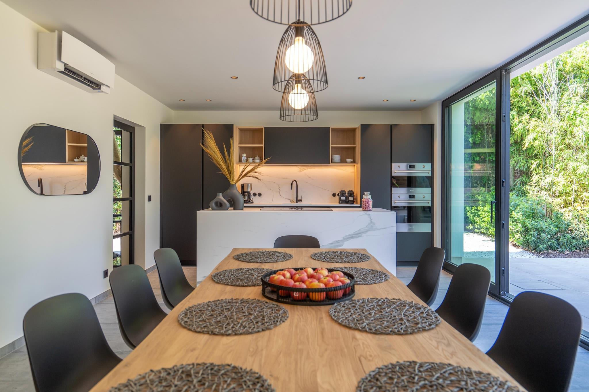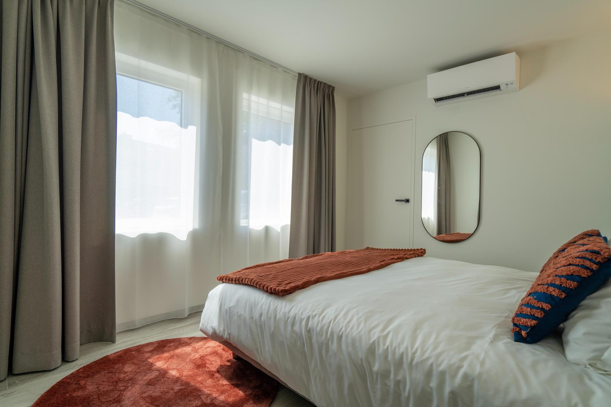 Velkommen til denne eksklusive og totalrenoverede villa for op til 10 gæster, hvor komfort, plads og privatliv er i centrum. Ejendommen har seks stilfulde soveværelser, hver med dobbeltseng, aircondition og eget badeværelse med bruser, håndvask og toilet – ideelt for familier eller vennegrupper, der ønsker at bo sammen uden at gå på kompromis med komforten. Det ene soveværelse ligger i stueetagen og er takket være brede døråbninger og trinfri adgang også velegnet til gæster med nedsat mobilitet. Stueetagen danner husets hjerte med en rummelig og lys opholdsstue, der flyder problemfrit over i det fuldt udstyrede åbne køkken. Her finder du alt, hvad du behøver for at lave mad og nyde lange måltider sammen. Stuen med stort spisebord, komfortabelt siddeområde, tv og trådløst musikanlæg skaber en varm og indbydende atmosfære. Der er også et separat opholdsrum med bar, ekstra køleskab, fryser og opvaskemaskine – perfekt til afslappede aftener med familie eller venner. Udenfor kan du nyde en smuk have med en stor overdækket terrasse, der er direkte forbundet med køkken og opholdsstue. Tag en forfriskende dukkert i den opvarmede private pool (åben fra påske til slutningen af oktober) eller slap helt af i tøndesaunaen. Foran ejendommen finder du rummelig parkering med ladestander til elbiler. Villaen ligger i kort afstand fra Kortrijks centrum, hvor du finder charmerende restauranter, butikker og kulturelle attraktioner. Den er også et ideelt udgangspunkt for cykel- og vandreentusiaster takket være de mange ruter langs floden Leie og gennem det grønne landskab i Vestflandern.