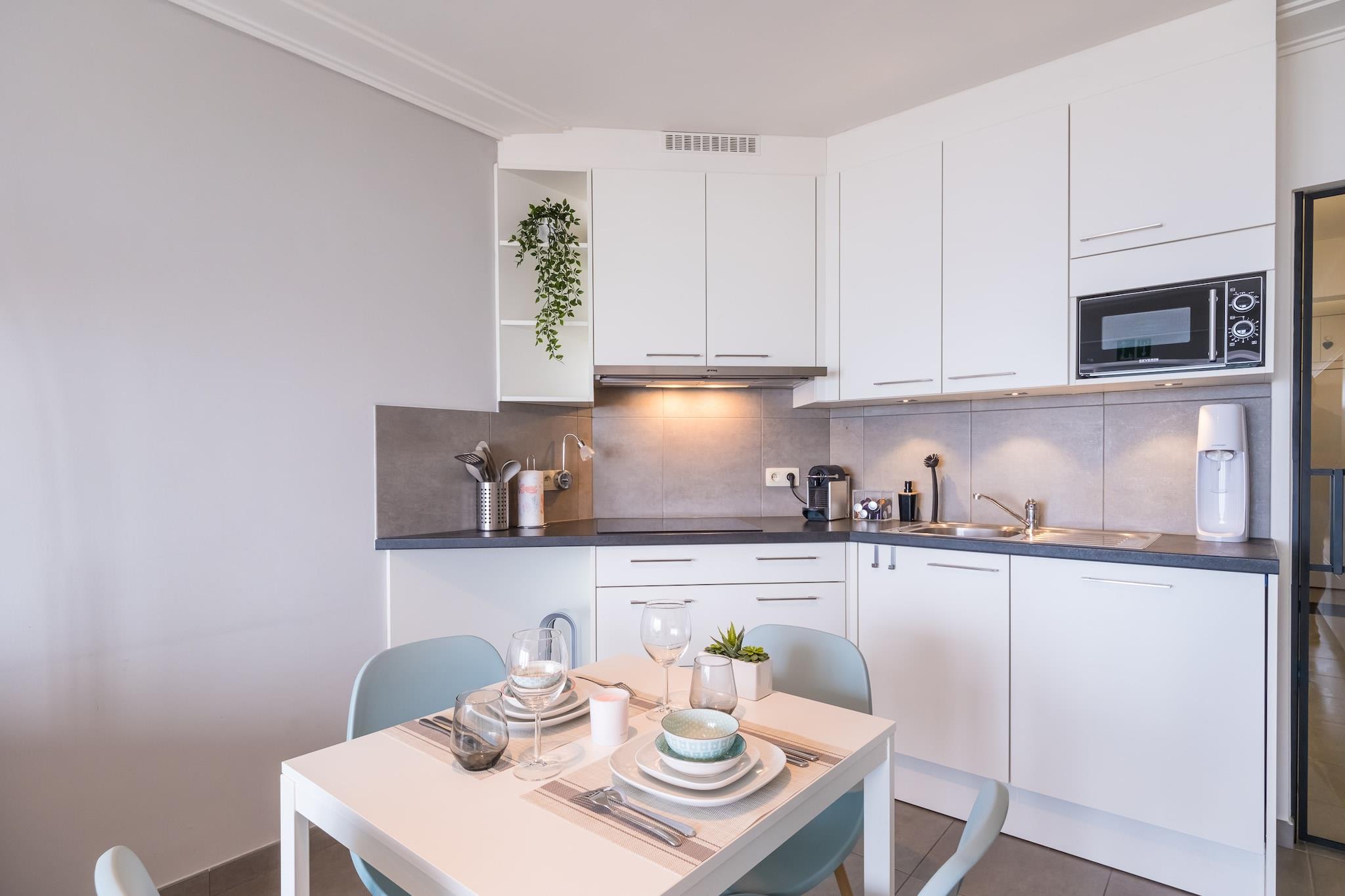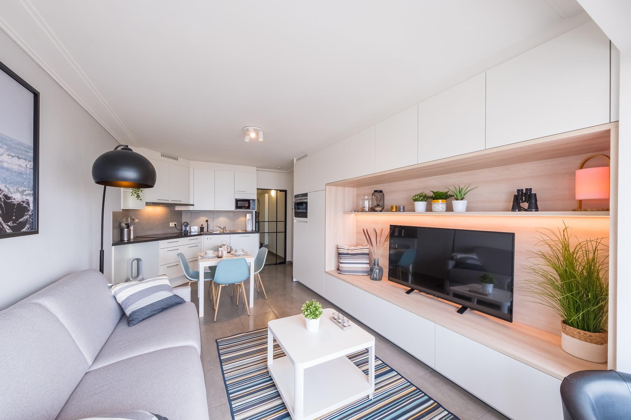 Studio beliggende på 3. sal og udstyret med en sovesofa (2 sovepladser) og en køjeseng (2 sovepladser). Der er også en hyggelig stue, som har væg-til-væg vinduer i fuld bredde, der åbner ud til den solvendte terrasse, som byder på en vidunderlig havudsigt. Der er et moderne køkken og et badeværelse med bruser og toilet. Denne fuldt renoverede studio ligger ved strandpromenaden og tæt på et sporvognsstoppested. Wifi: ja - parkering: ikke inkluderet - lagner: medbring selv - håndklæder: medbring selv.