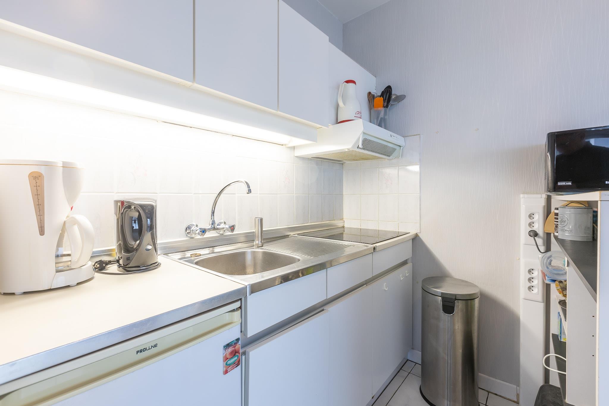 Stueetage: (Køkken(elkedel, brødrister, kaffemaskine, mikrobølgeovn, køleskab(+ fryser)), Stue/soveværelse(dobbeltsovesofa(160 x 200 cm), Fjernsyn, spisebord, sofahjørne, radio, balkon), soveniche(køjeseng(dynebetræk, 90 x 190 cm)), badeværelse(badekar, føntørrer), toilet(guest toilet), terrasse, elevator, strygebræt)