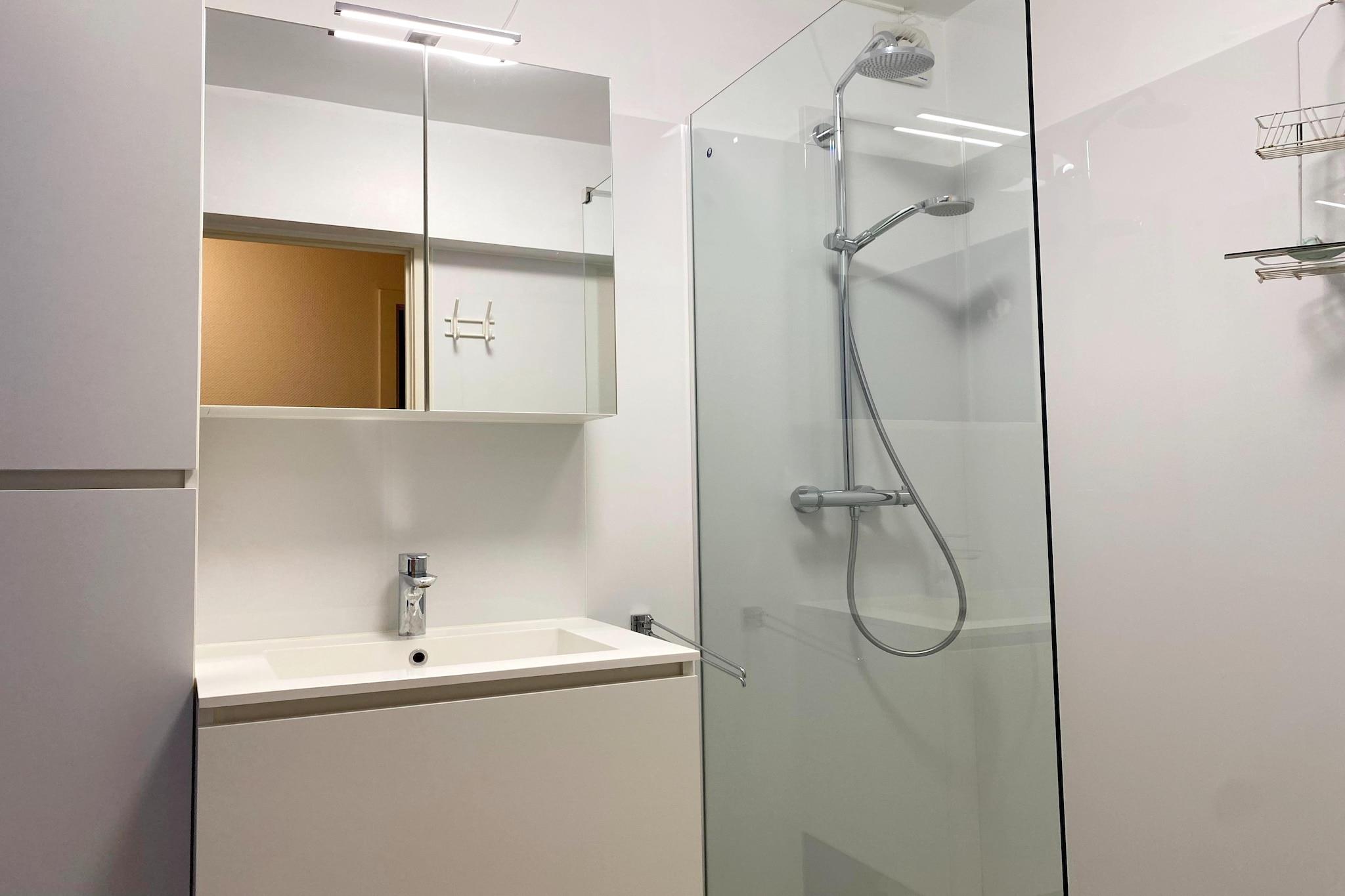 På 1. etage: (åbent køkken(kogeplade(elektrisk), emhætte, kaffemaskine, ovn, mikrobølgeovn, opvaskemaskine , køleskab(+ fryser)), stue / spisestue(Fjernsyn(digital), spisebord, sofahjørne, DVD-afspiller, radio, balkon), soveværelse(dobbeltseng(dobbelt dynebetræk, 160 x 200 cm), balkon), soveværelse(3-etage-køjeseng(dynebetræk), håndvask, balkon), badeværelse(bruser(Walk-in-bruser), håndvask), toilet(toilet), pulterkammer) cykelopbevaring(deles med andre gæster), elevator