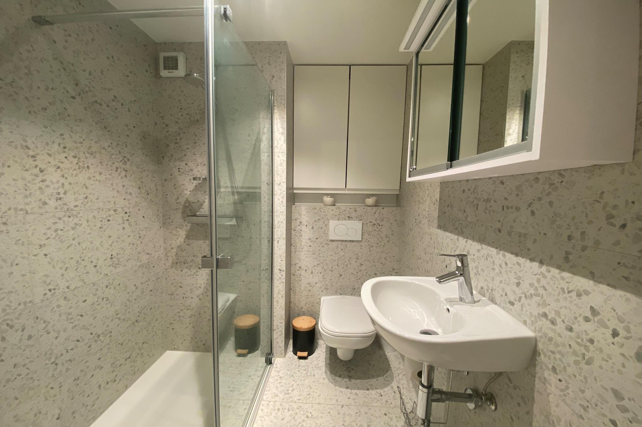 På 4. etage: (Køkken(kogeplade(elektrisk), kaffemaskine, combi-mikroovn, køleskab), stue / spisestue(dobbeltsovesofa(dobbelt dynebetræk, 140 x 200 cm), Fjernsyn, spisebord, sofahjørne), soveværelse(dobbeltseng(dobbelt dynebetræk, 140 x 200 cm)), badeværelse(bruser, håndvask, toilet)) terrasse, havemøbler, elevator