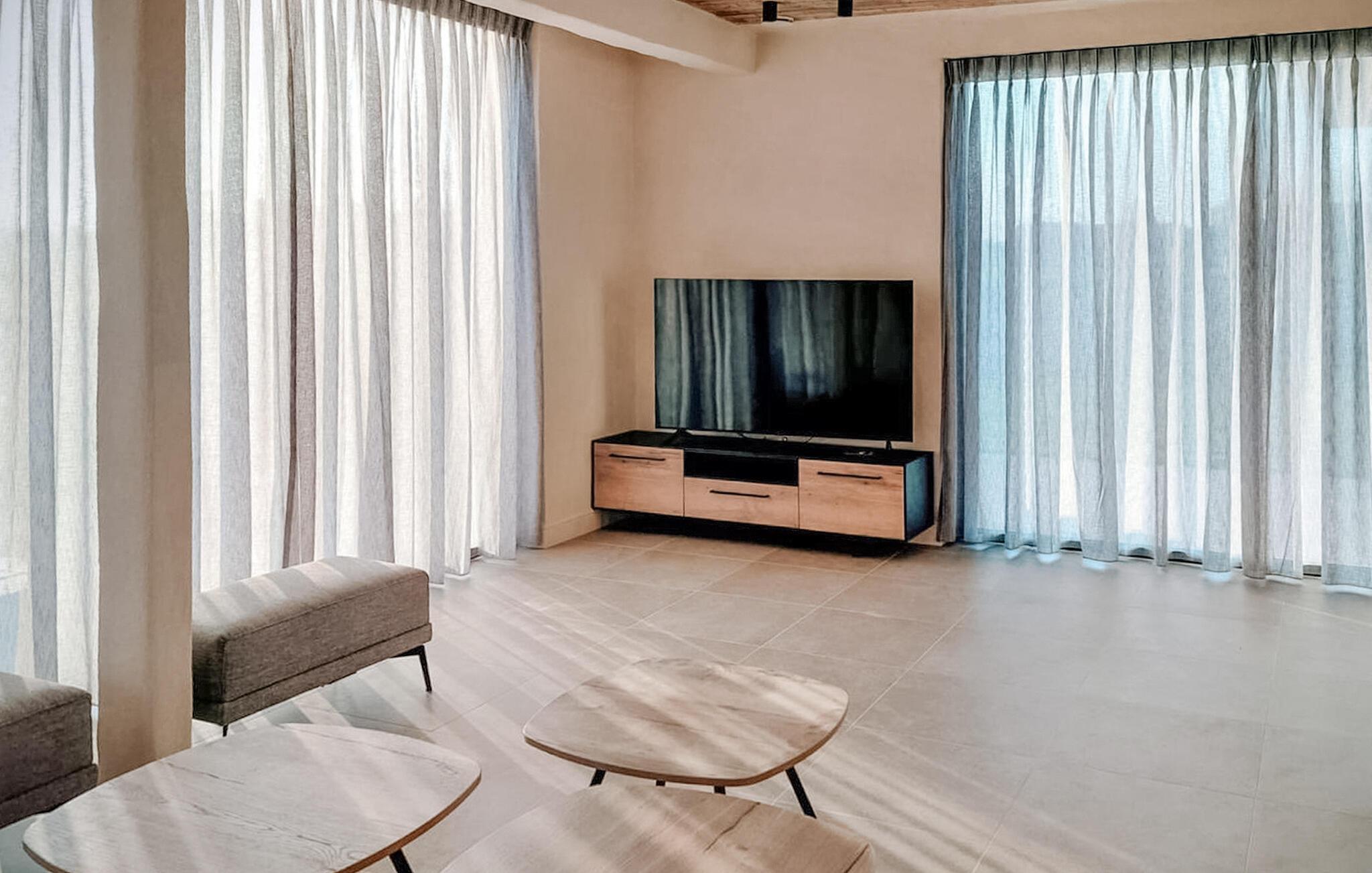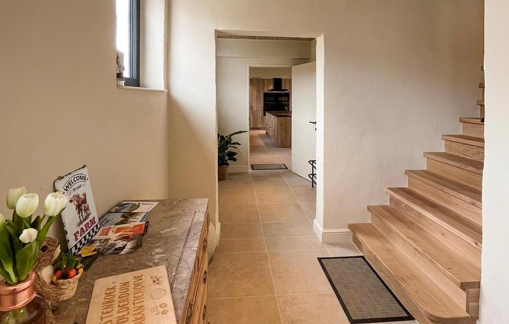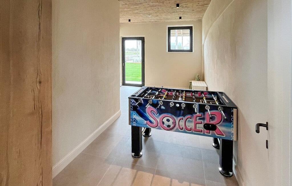 Træd ind i det store hus og nyd det åbne design. Slap af i de komfortable sofaer i den store opholdsstue og nyd det omkringliggende landskab gennem gulv-til-loft-vinduerne. Tilbered måltider i det moderne køkkens rummelige køkkenø og benyt jer af det lange spisebord, perfekt til fælles aftener med venner og familie. Slap af i opholdsstuen eller brug de ekstra rum til underholdning, måske med et spil bordfodbold.