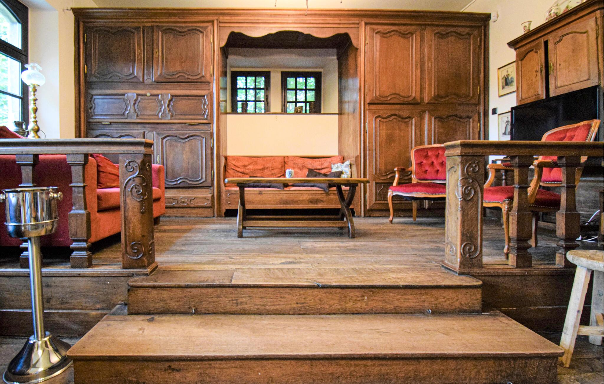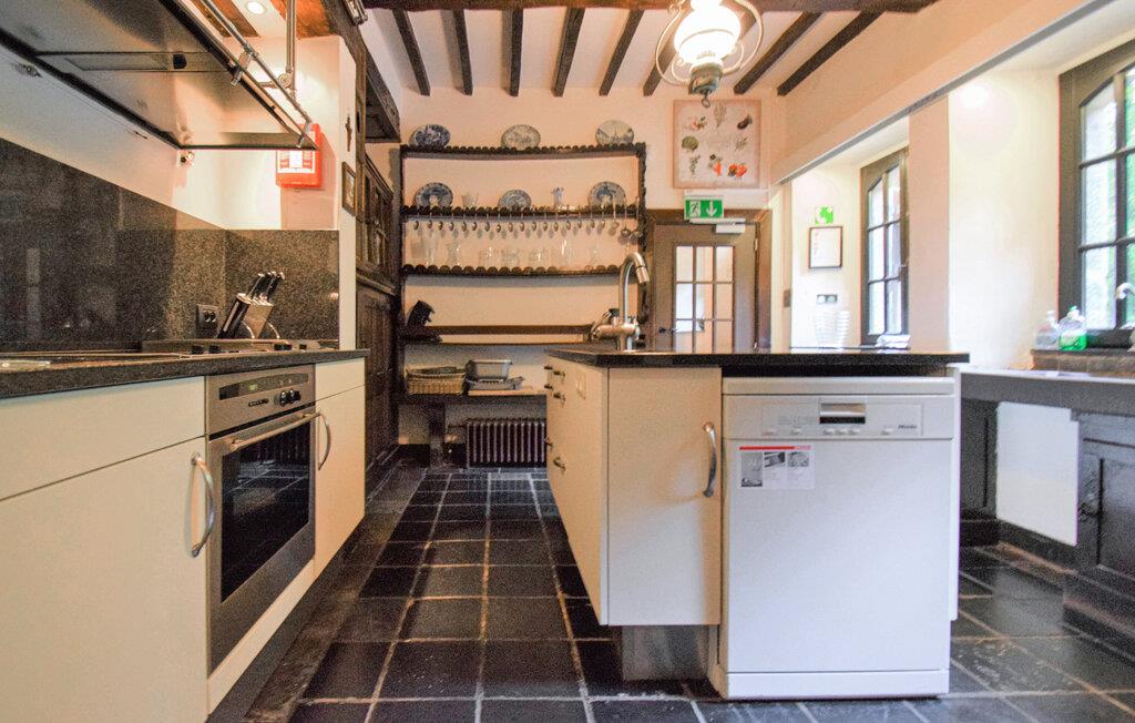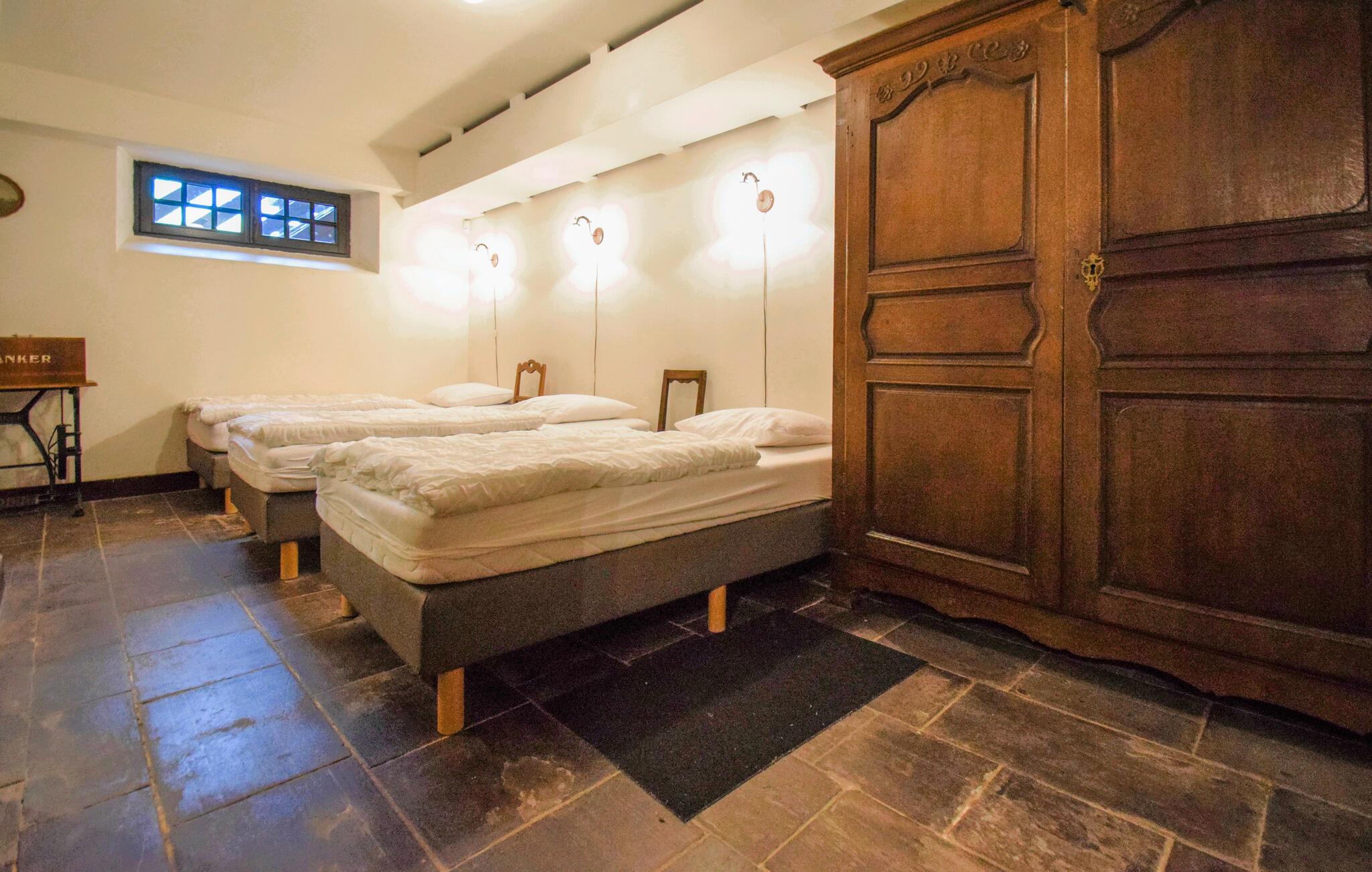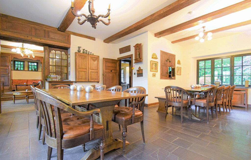 Nyd hyggelige stunder i dette imponerende feriehus, hvis historiske bindingsværksfacade og generøse planløsning gør det ideelt til store grupper. Slap af i den store opholdsstue med pejs, lænestole og rustikke træbjælker og nyd hyggelige aftener sammen. Hold en middag i den rummelige spisestue med flere store borde og tilbered nemt måltider til alle i det veludstyrede køkken. Slap af til et spil bordfodbold eller slap af i saunaen efter en aktiv dag.