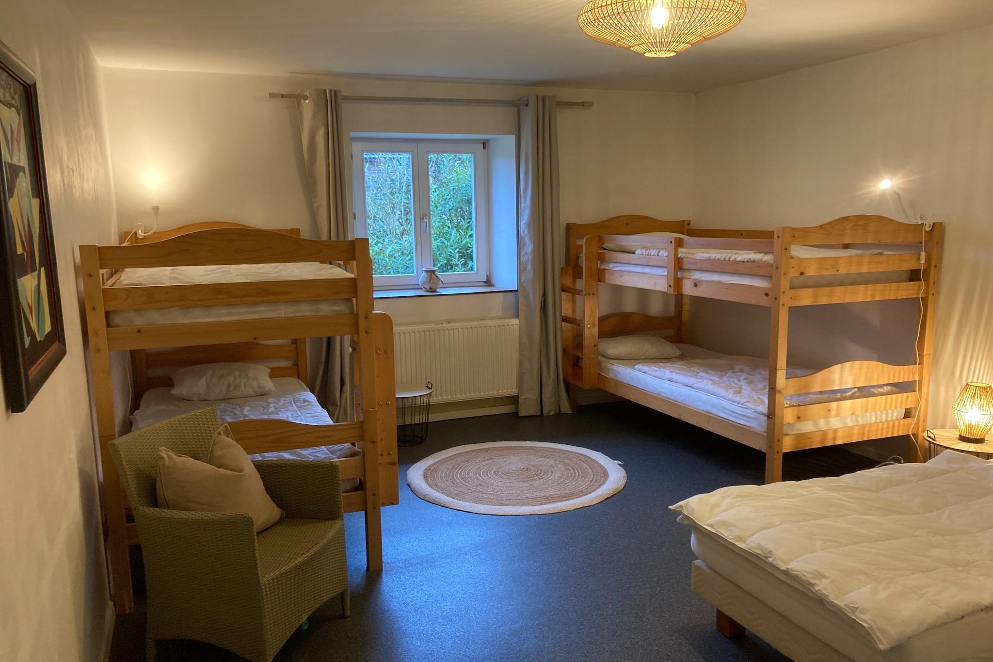 Stueetage: (åbent køkken(komfur(Komfur med fire kogeplader, glaskeramisk), 2x kaffemaskine(kaffetragt, kaffepude), ovn, mikrobølgeovn, opvaskemaskine , køle-fryseskab), stue / spisestue(Fjernsyn(kabel, Internationale TV-kanaler), kakkelovn(træ), DVD-afspiller, stereoanlæg, barnestol), toilet(håndvask), vaskerum (tørretumbler, vaskemaskine), legeværelse(bordfodbold)) På 1. etage: (soveværelse(3x enkeltseng), soveværelse(3x enkeltseng), soveværelse(enkeltseng, 2x køjeseng), soveværelse(dobbeltseng, barneseng), badeværelse(Bubble bath, massagebruser, 2x håndvask, toilet)) På 2. etage: (loungerum(sauna), bruser) Sidebygning: (bordfodbold, biljard) varme(central), baggård, terrasse(overdækket), have(indhegnet), havemøbler, grill, parkering