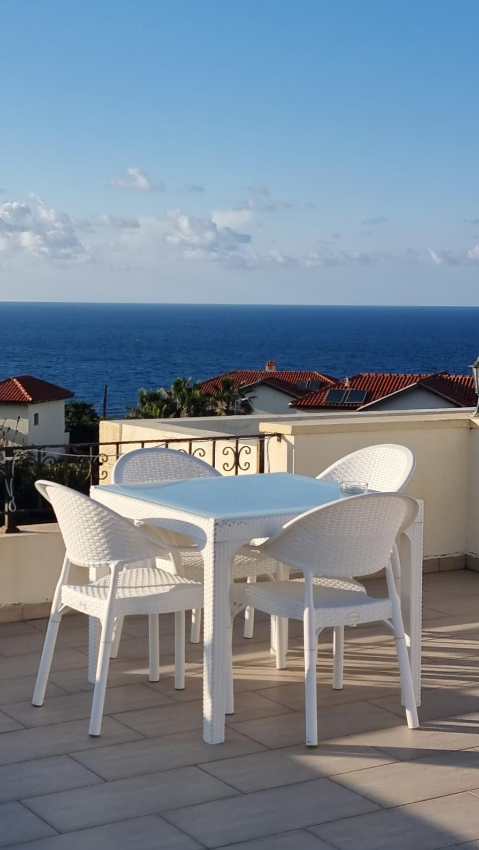 The villa is located directly by the sea and has a large garden terrace and a roof terrace from which you have a wonderful view of the turquoise blue Mediterranean Sea. The villa has two floors. On the ground floor is the sun-drenched living room with an open-plan kitchen, a guest WC and a utility room, and on the upper floor are the two bedrooms with double beds and the main bathroom with shower. The villa is also equipped with everything you need for your daily needs. The complex has a large communal pool.