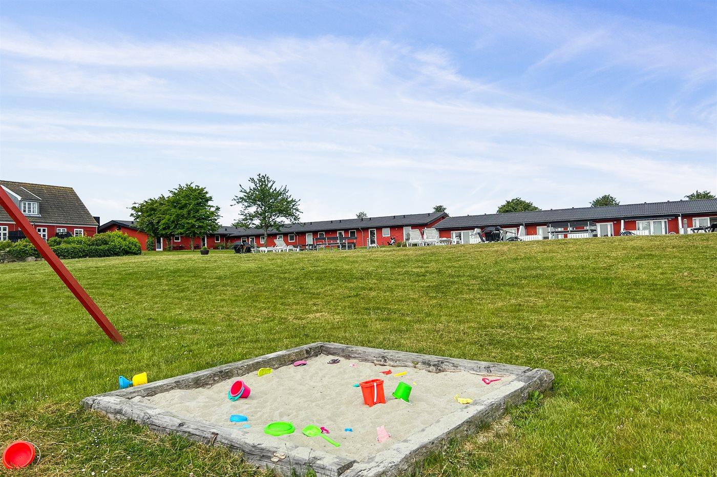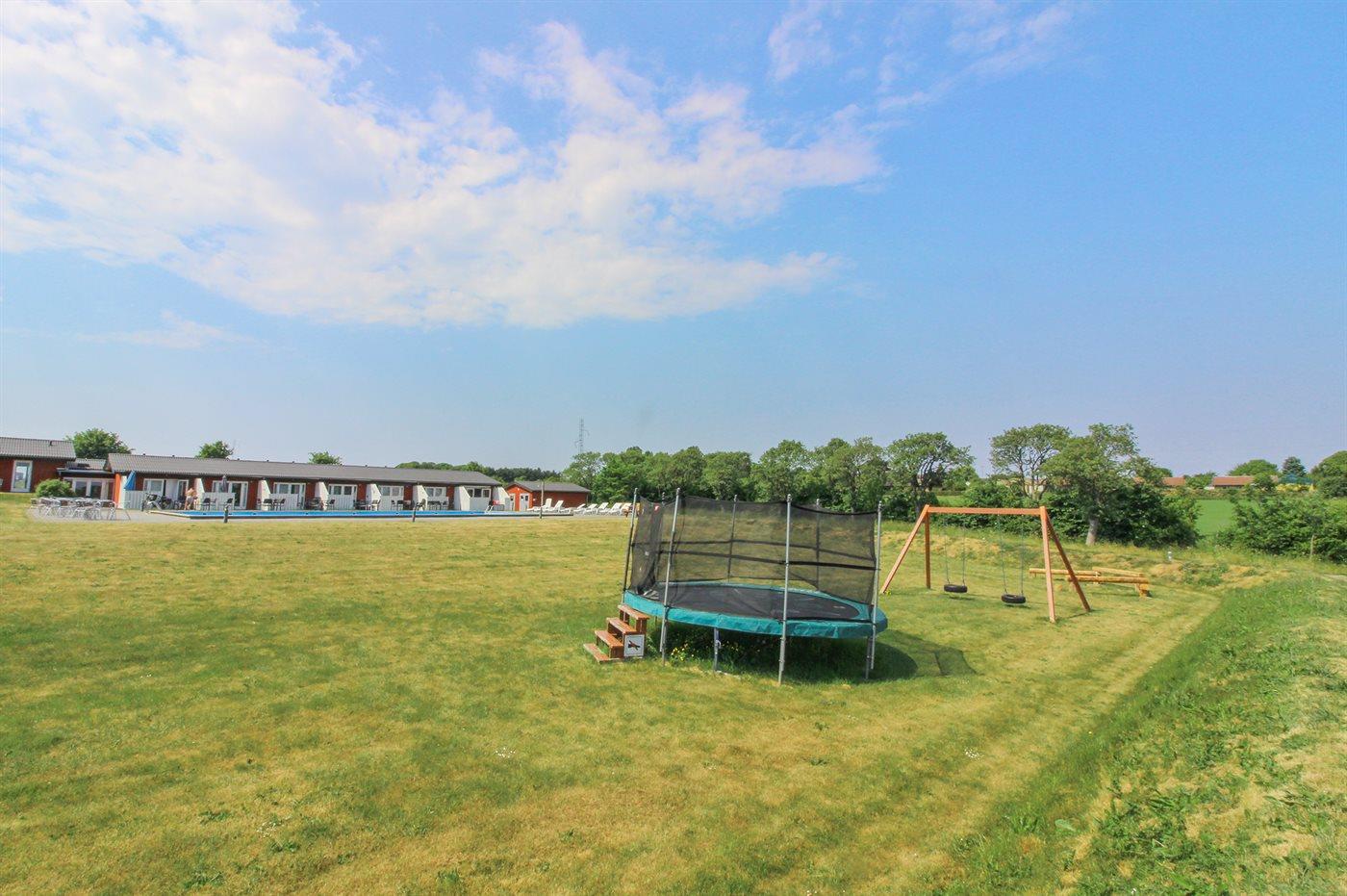 Foran ferielejligheden er der en lille fliseterrasse, så man kan følge livet i fællespoolen, der nok kan friste til en badetur. Poolen er opvarmet fra den 15.6 - 15.9. Til fælles afbenyttelse er der i Dams på Bakken petanquebane, trampolin, fodboldmål og et lille bålsted.