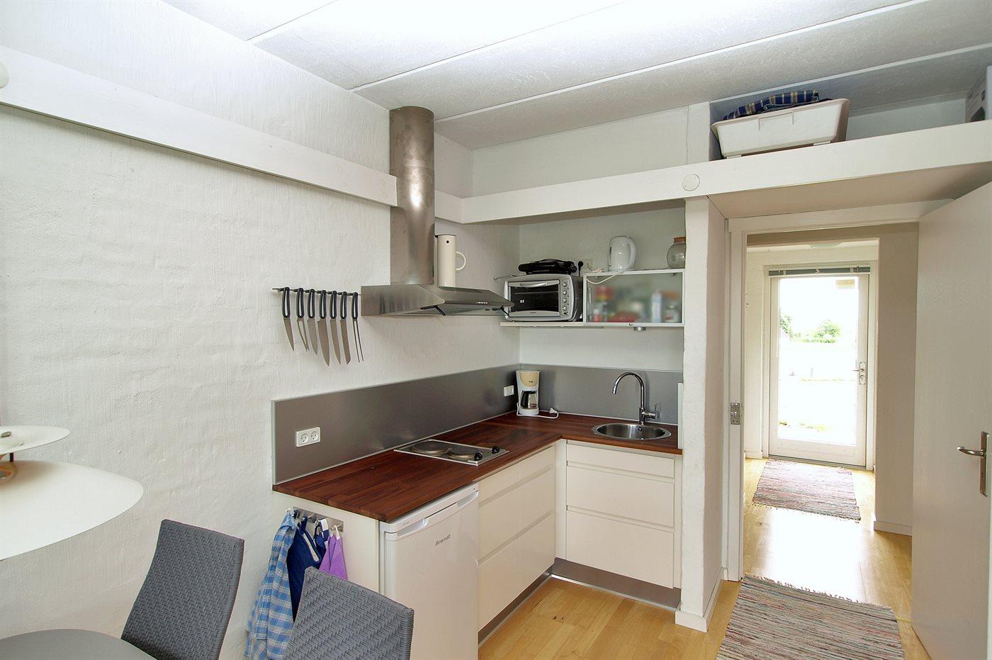 Køkkenet er udstyret med 1 køleskab. Der er 2 elkogeplader, mikrobølgeovn. Desuden findes der en Airfryer.
