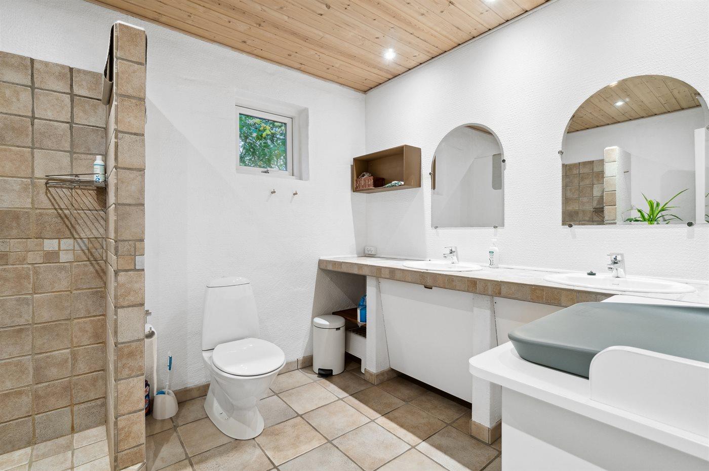 Der er 2 badeværelser med bruseniche og 2 toiletter. Der er gulvvarme på 1 badeværelse.