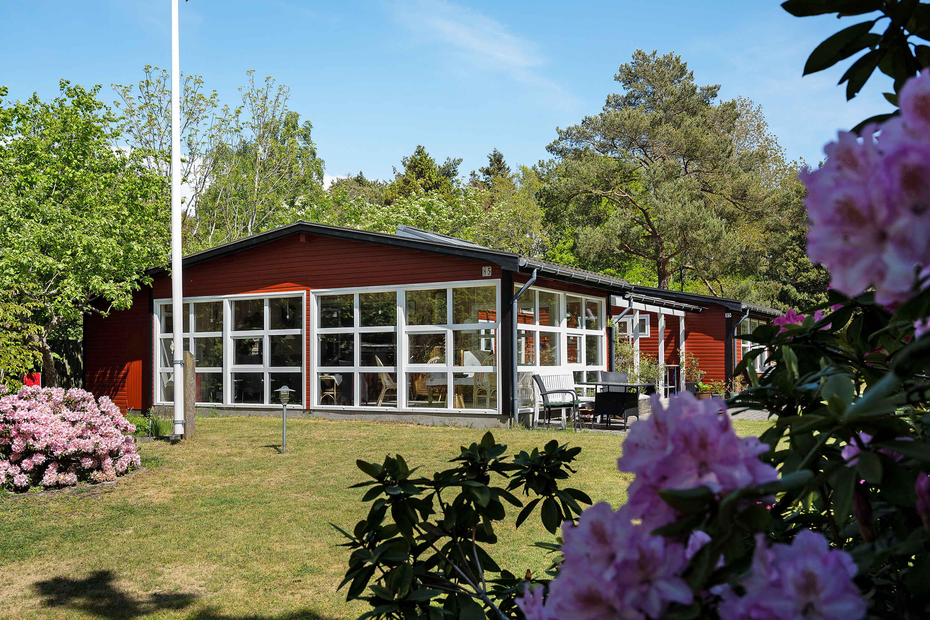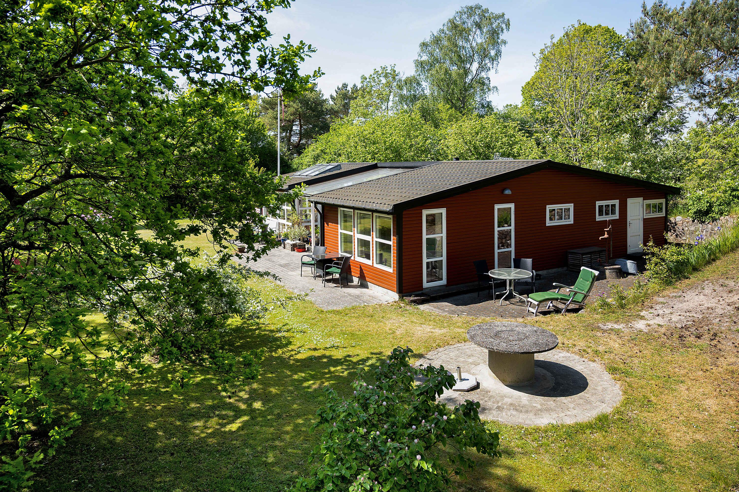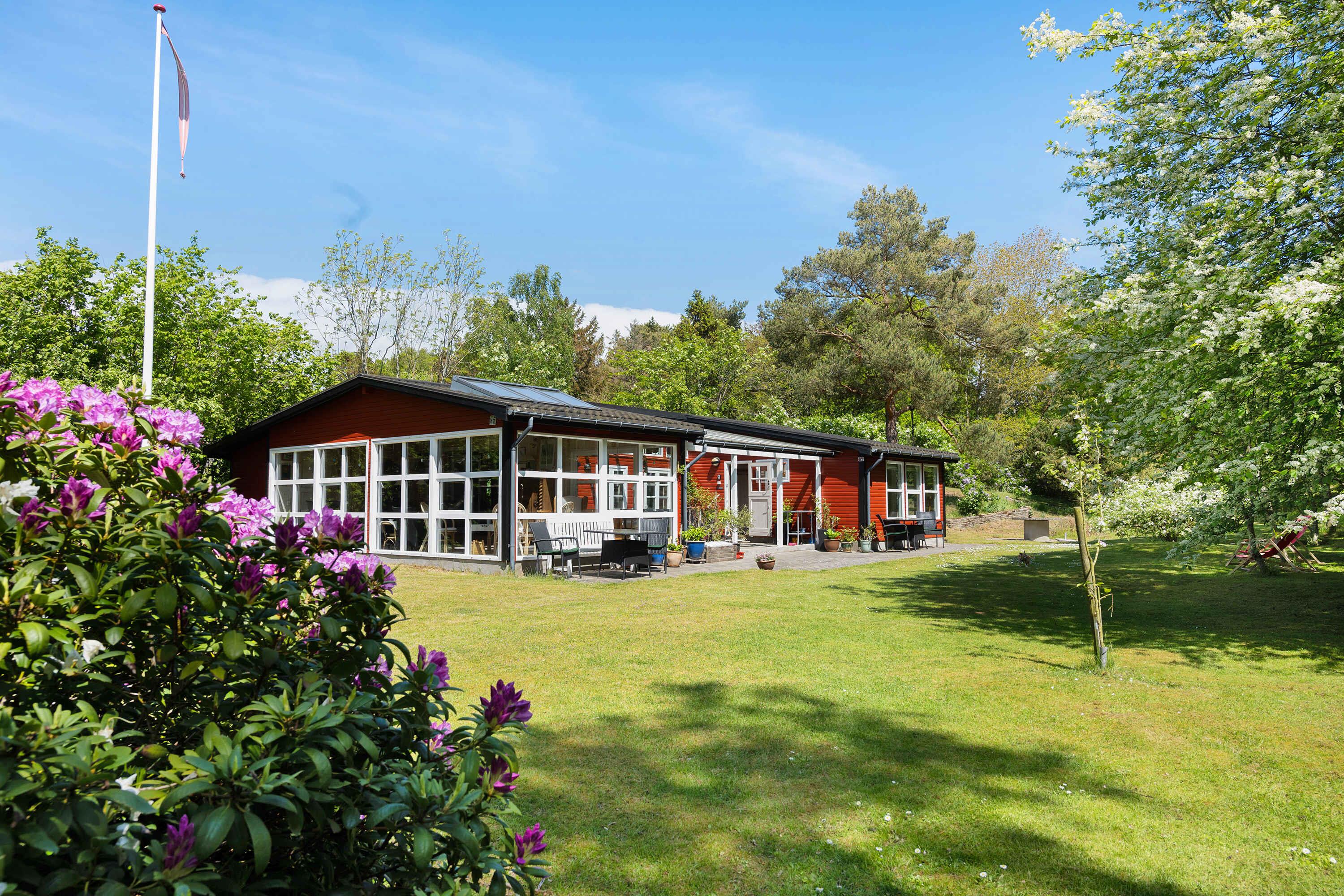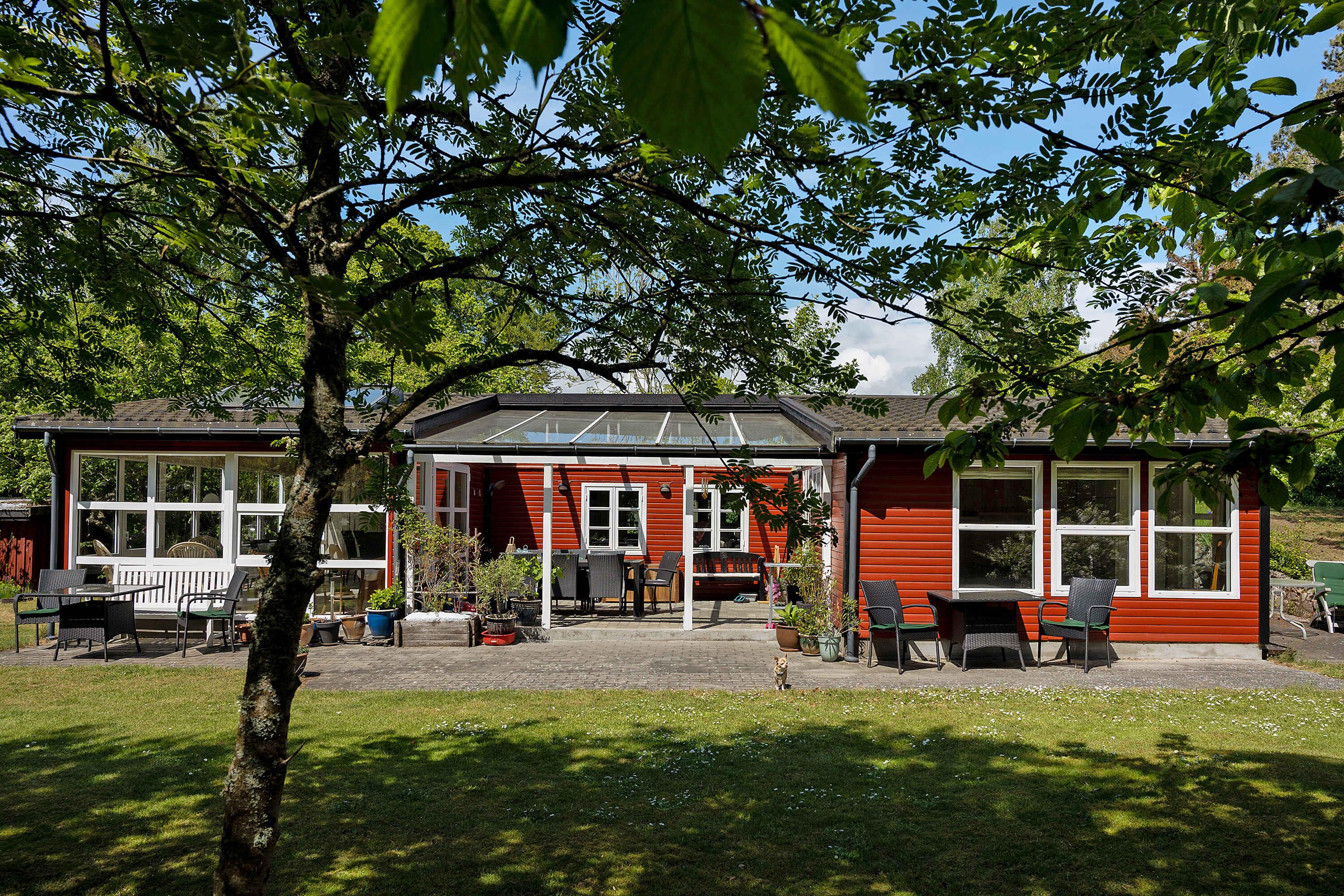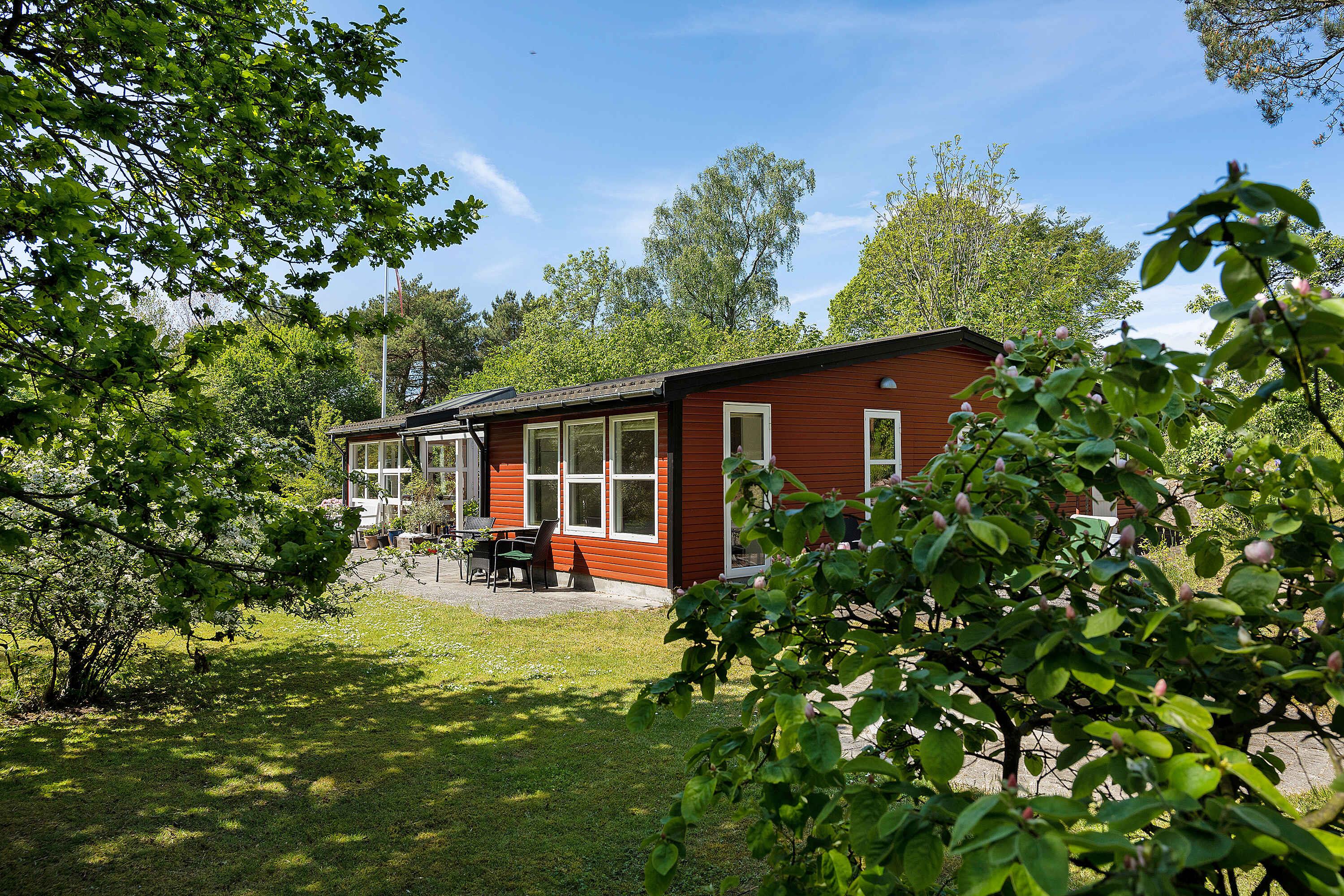 Charmerende rødmalet sommerhus nær Boderne Strand med store terrasser og privat grund.