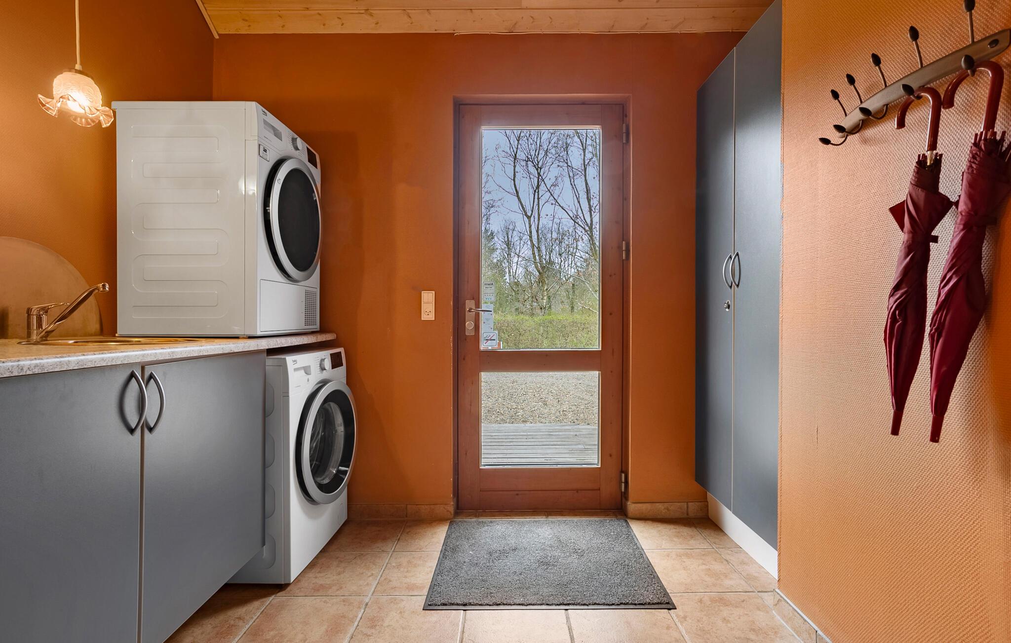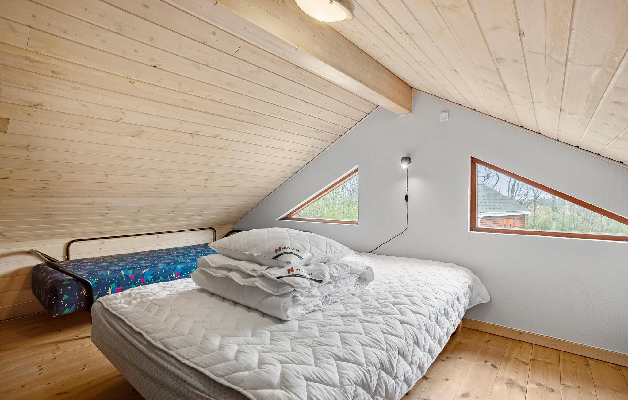 Tilbring jeres næste ferie i dette førsteklasses sommerhus, som kombinerer fred, ro og komfort i naturskønne omgivelser. De rummelige fællesarealer har en behagelig atmosfære, når I skal slappe af sammen. Tilbered nemt lækre måltider i det fine, åbne køkken. Den tilstødende spiseplads ved den varme brændeovn er en god ramme om de fælles måltider. Skulle vejret vise sig fra sin kølige side, er der hyggeligt i stuens bløde møbler, så find brætspillene frem og sæt jer med en god kop te. Derudover har huset sin egen sauna og spabad, hvilket er herligt efter en lang dag på farten.