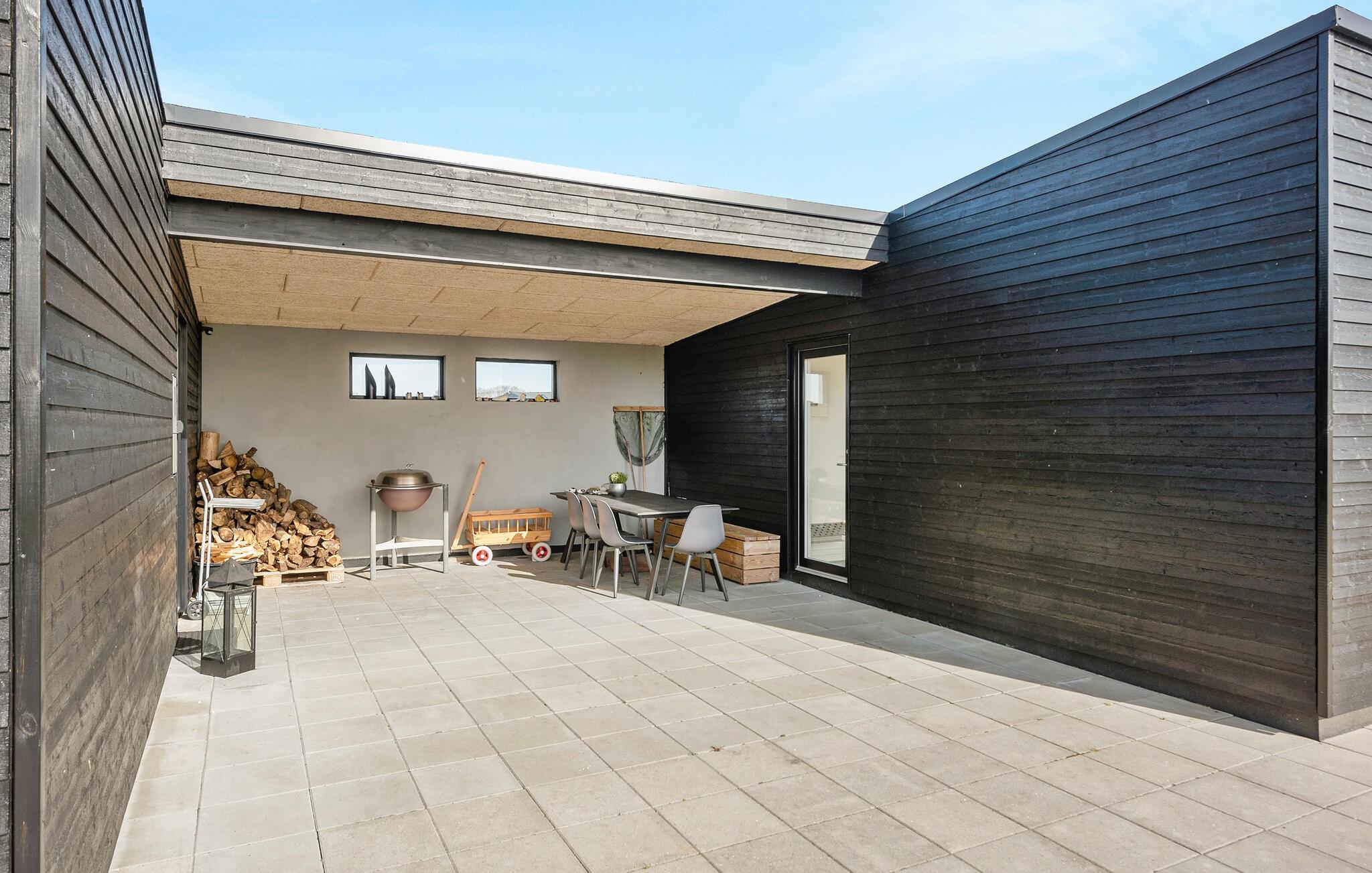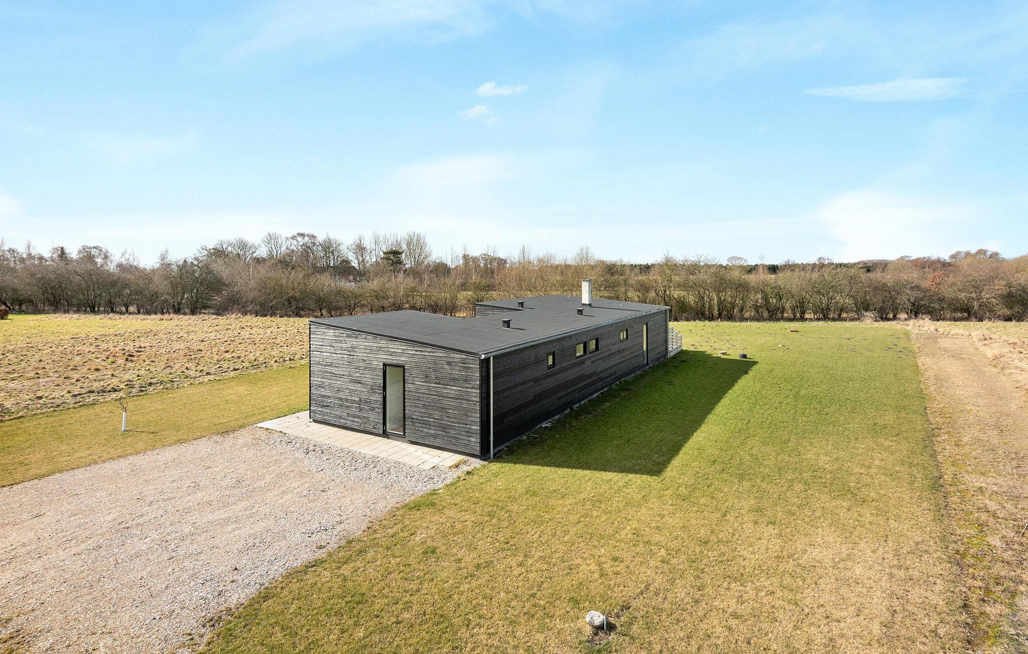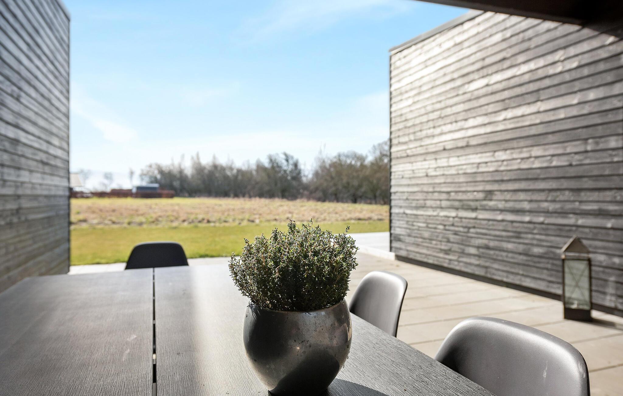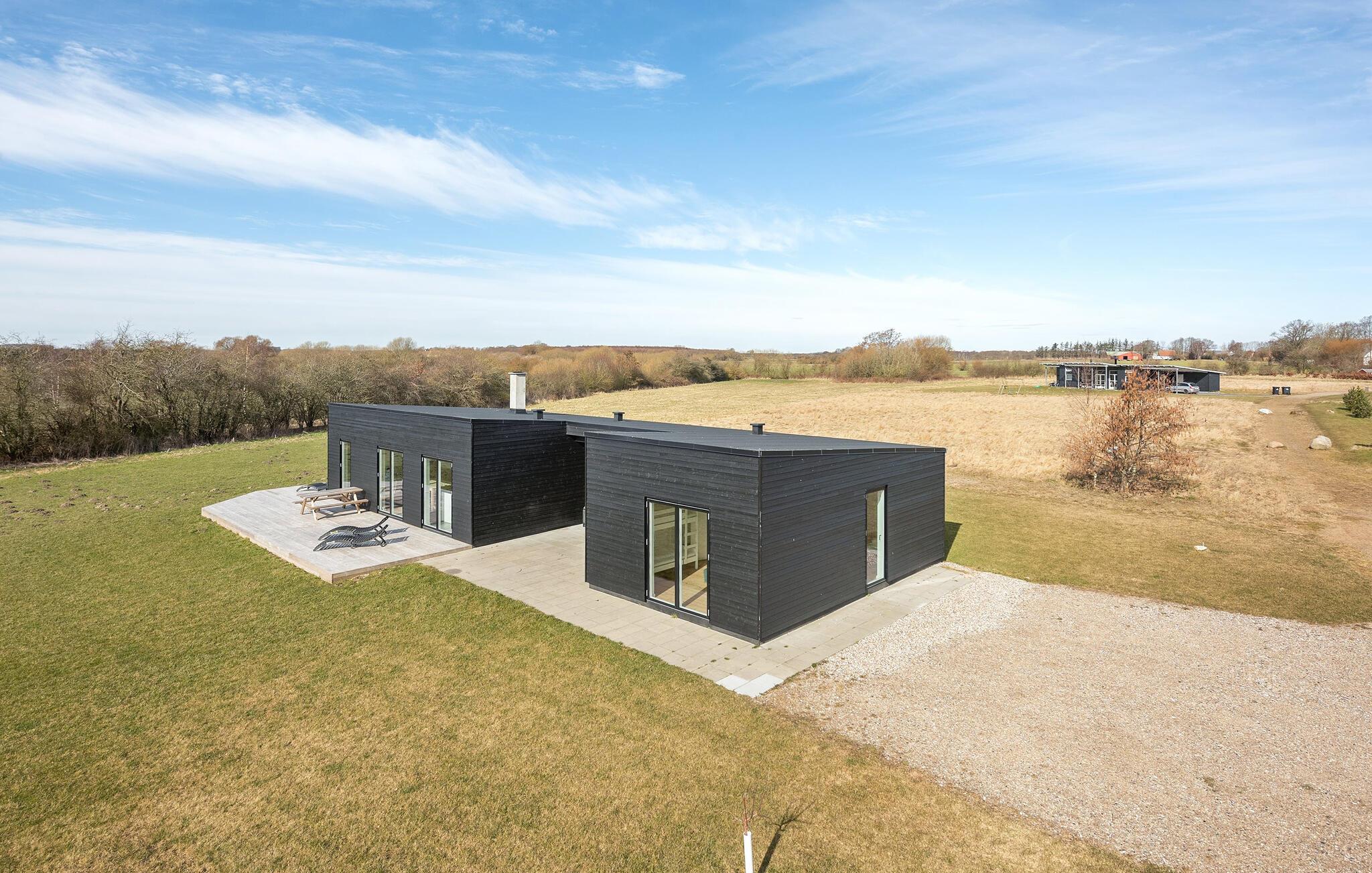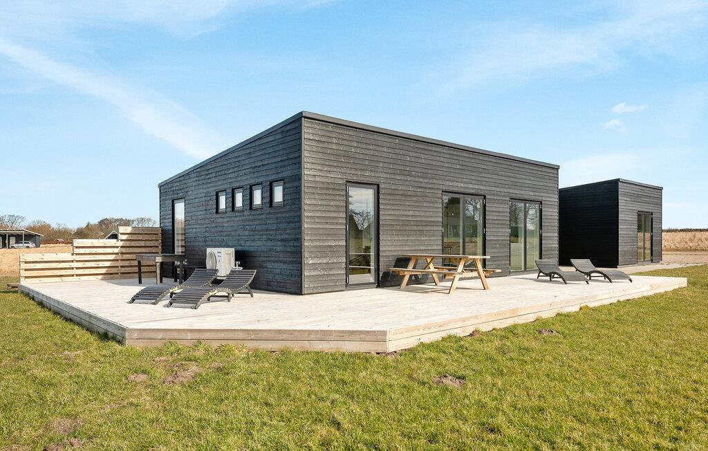 Moderne træhus på Årø med terrasse, brændeovn og nærhed til strand og natur.