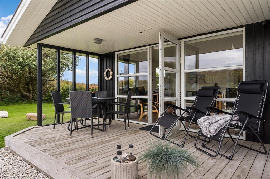 En af sommerhusets helt store fordele er den delvist overdækkede og lukkede træterrasse, som gør huset særligt attraktivt som sommerhus med hund tilladt og for familier med mindre børn. Her kan I nyde solen og udelivet i rolige og trygge rammer.