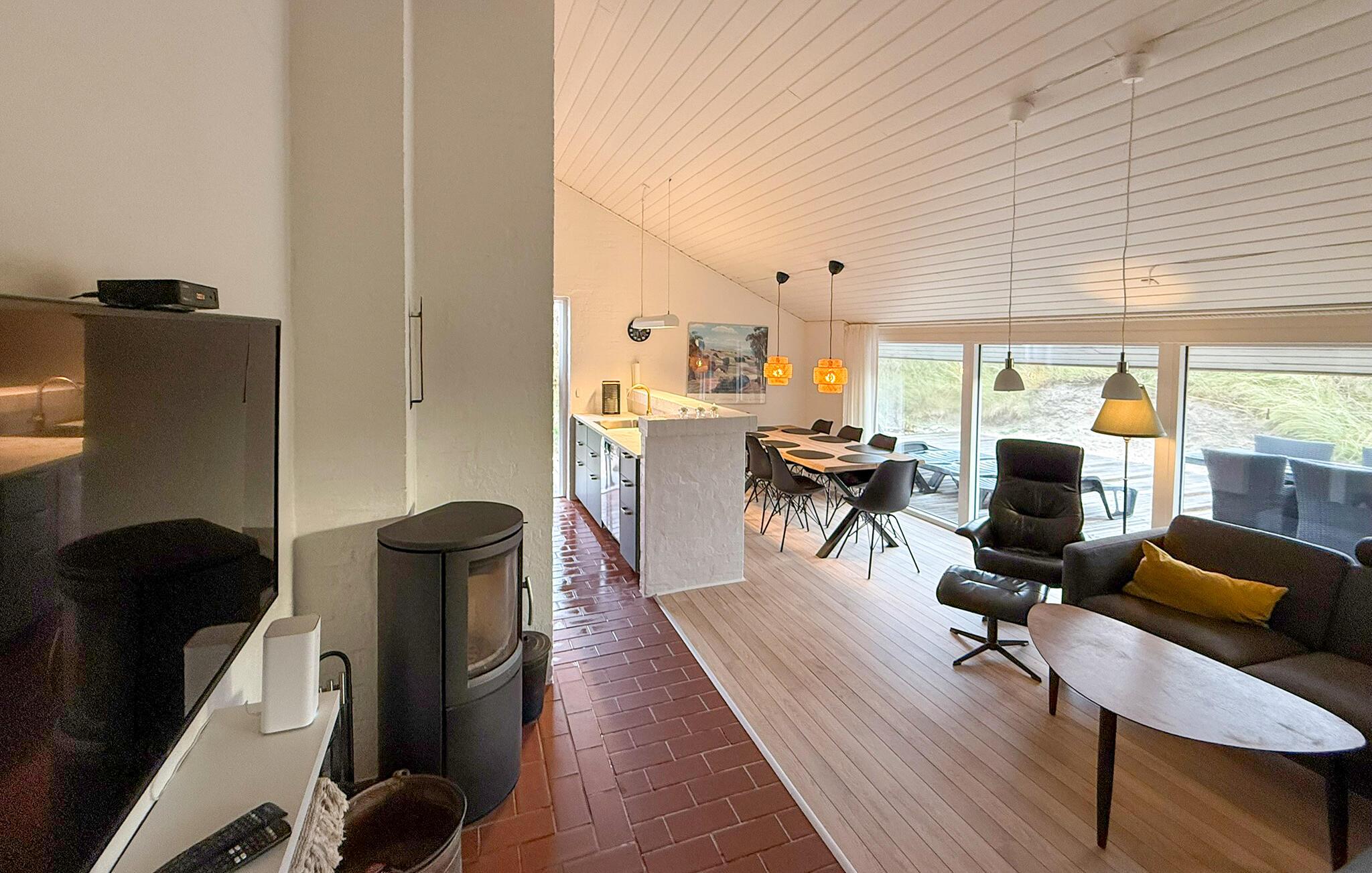Havet, himlen og fuglene. I er landet midt i Vestjylland, og får her det fulde udbytte af områdets ikoniske natur. Slå dørene op til det hyggelige murstenshus, hvor den lyse opholdsstue er moderne og komfortabelt indrettet og har store vinduer, der lukker lyset ind. Brændeovn bidrager med hyggelig varme på kølige dage. Læn jer tilbage i sofaen eller nyd måltiderne sammen i spisestuen med direkte udsigt over klitterne. Det åbne køkken er fuldt udstyret og har alt, hvad I skal bruge til feriens madlavningsprojekter. Et særligt højdepunkt er poolrummet, hvor der også er strandstole og adgang til terrassen. Efter en svømmetur kan I slappe af i saunaen.