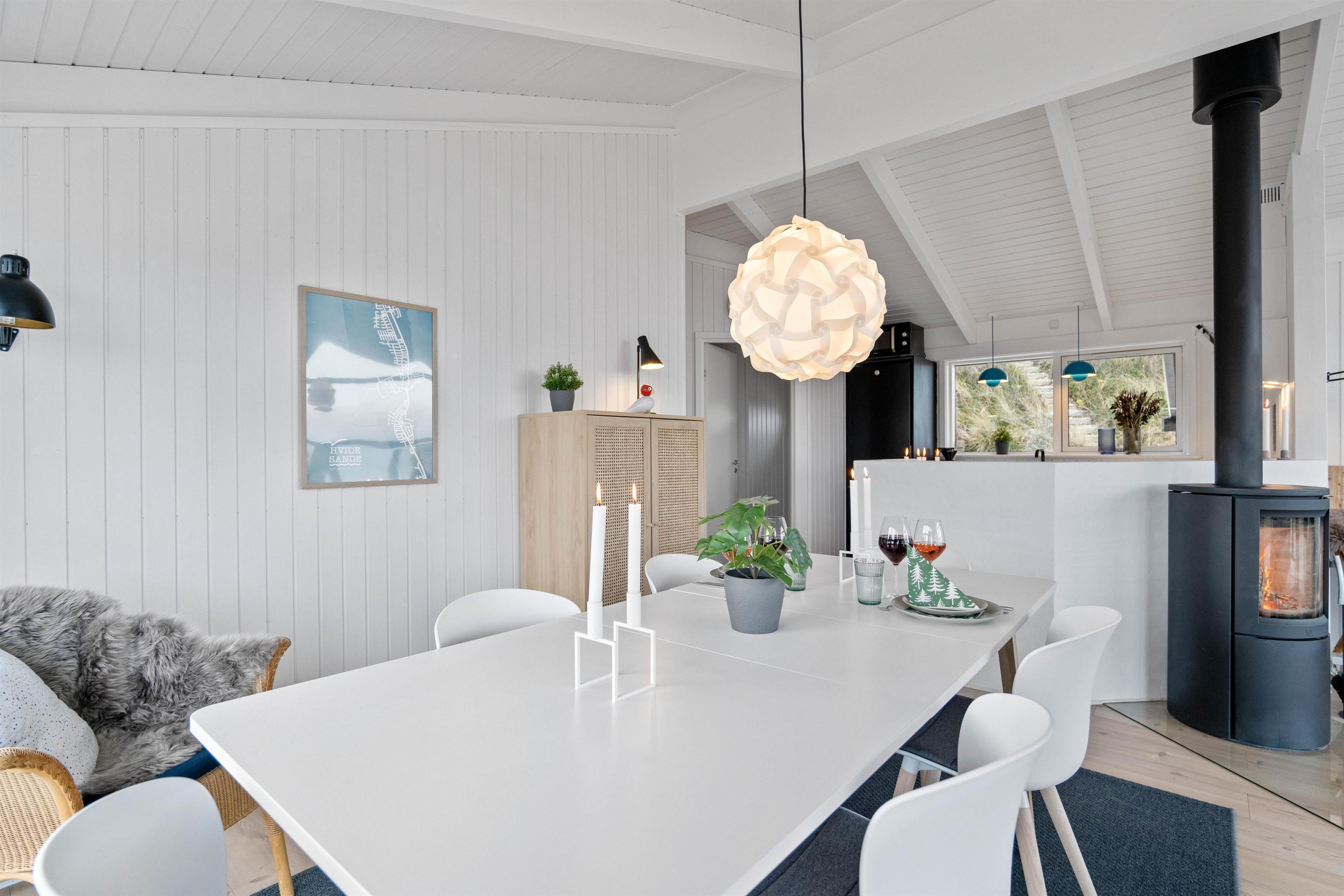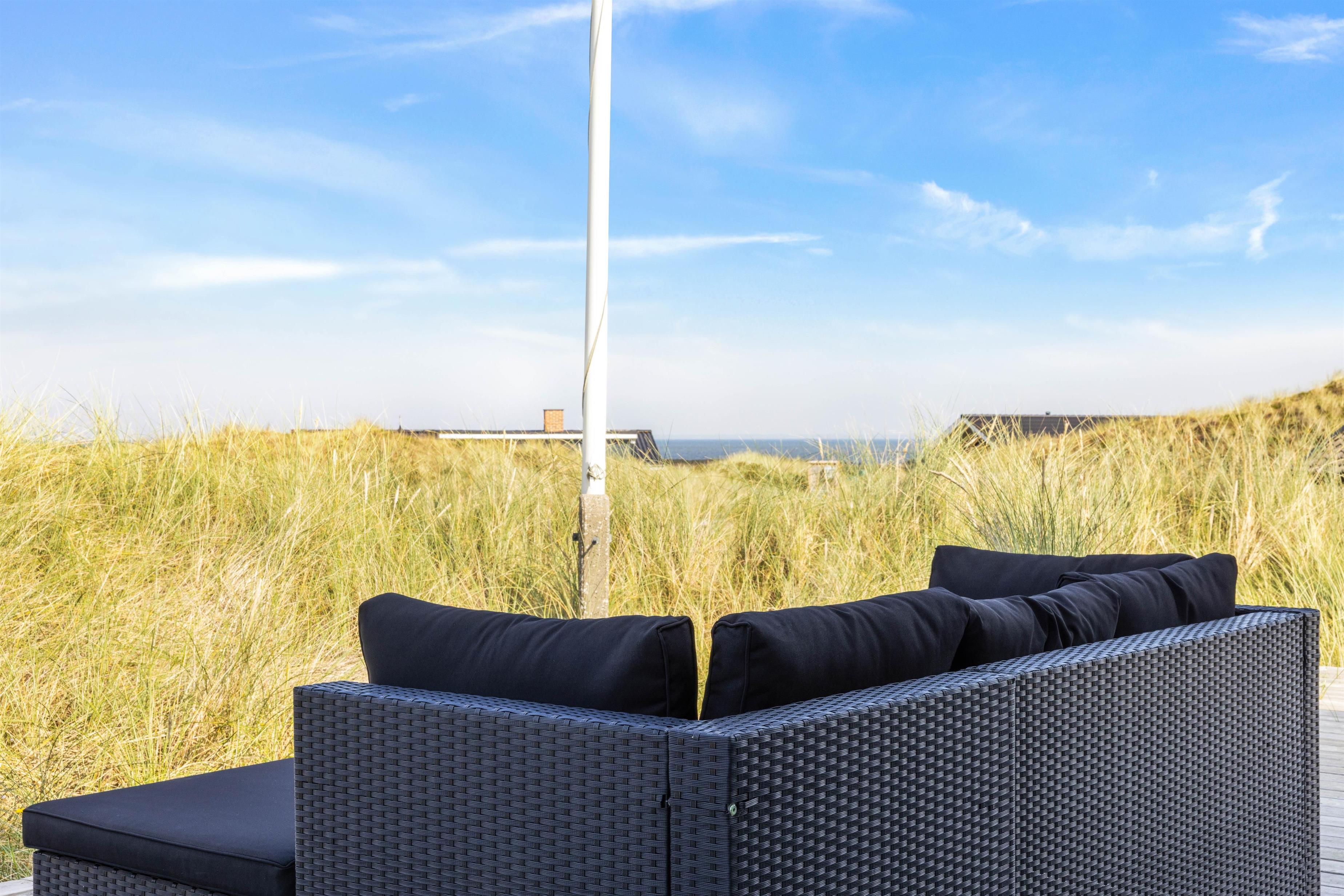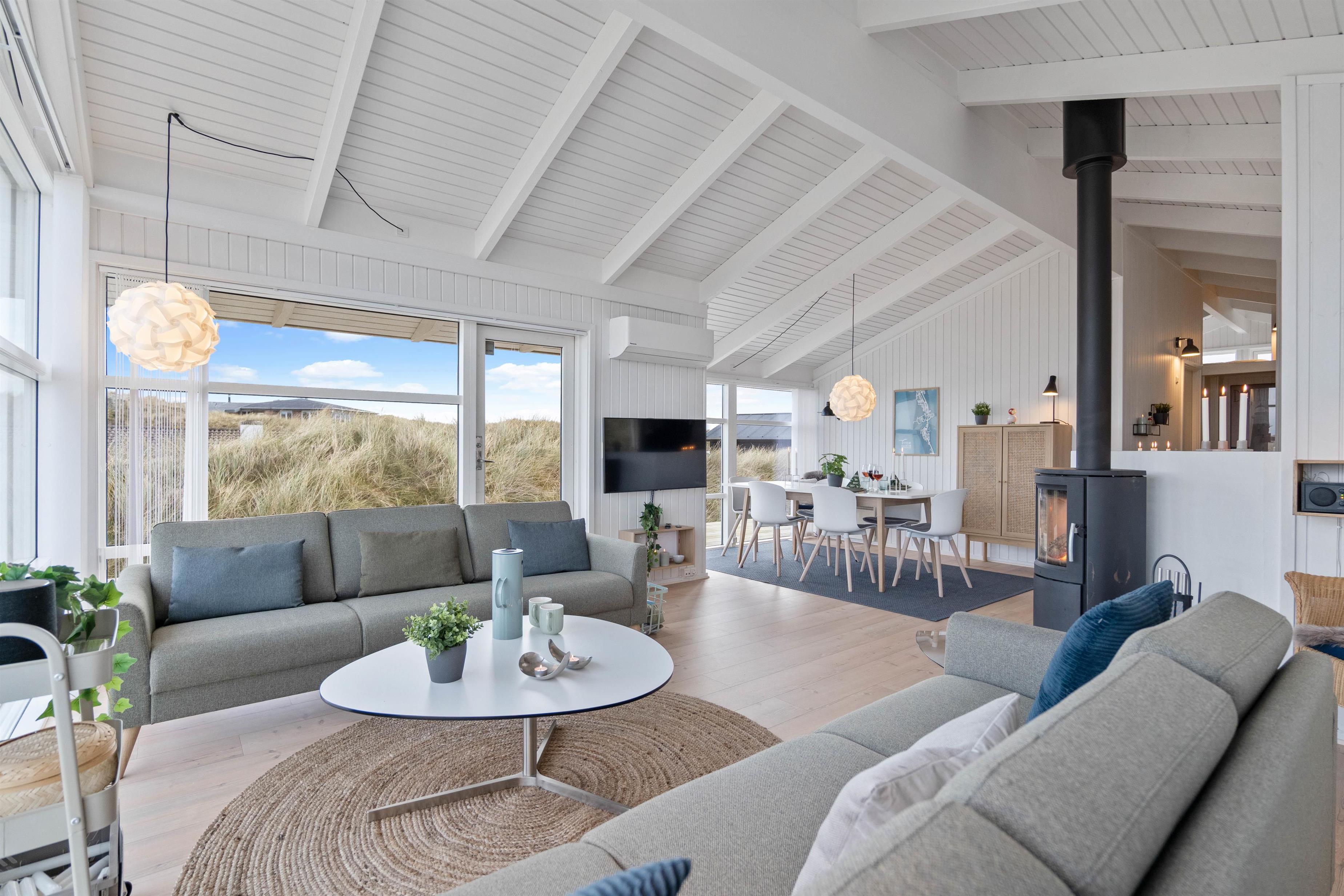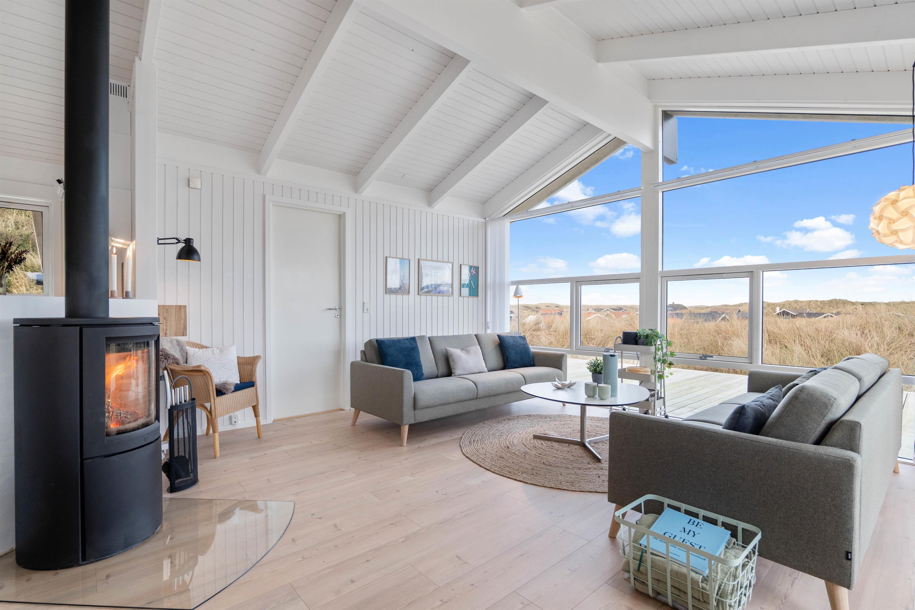 Sommerhuset har grundet sin gode beliggenhed en smuk udsigt, der kan nydes både indefra og ude på terrassen. Fra stuen kan I nyde den flotte panoramaudsigt over klitlandskabet, og om aftenen kan I planlægge en filmaften og streame filmen fra sommerhusets Chromecast, mens I nyder varmen fra den knitrende brændeovn.