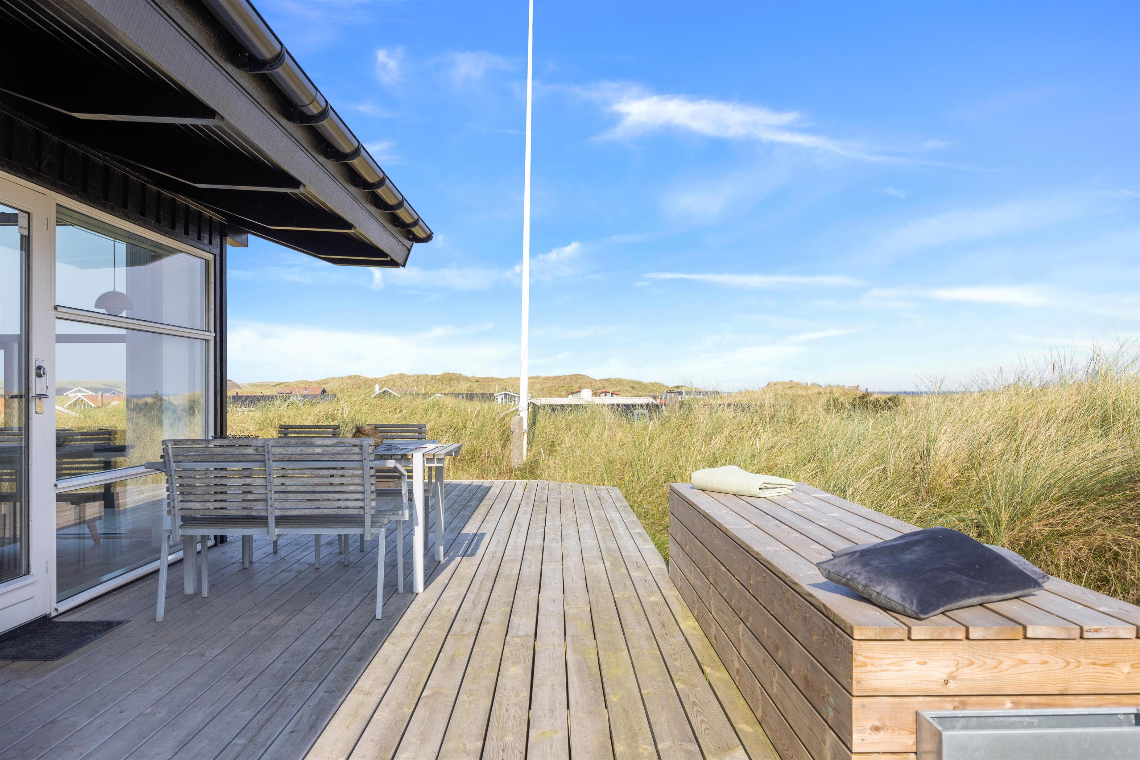 Ønsker I at være midt i den skønne natur, men stadig have moderne faciliter til rådighed, så er dette sommerhus helt ideelt. Det ligger på en kuperet klitgrund nær Vesterhavet med panoramaudsigt over landskabet og fjorden, og der er skøn terrasse omkring sommerhuset, så I rigtigt kan nyde omgivelserne. I sommerhuset kan der bo 5 personer og 1 hund. Feriehuset er desuden renoveret i 2022 og fremstår lyst og indbydende.