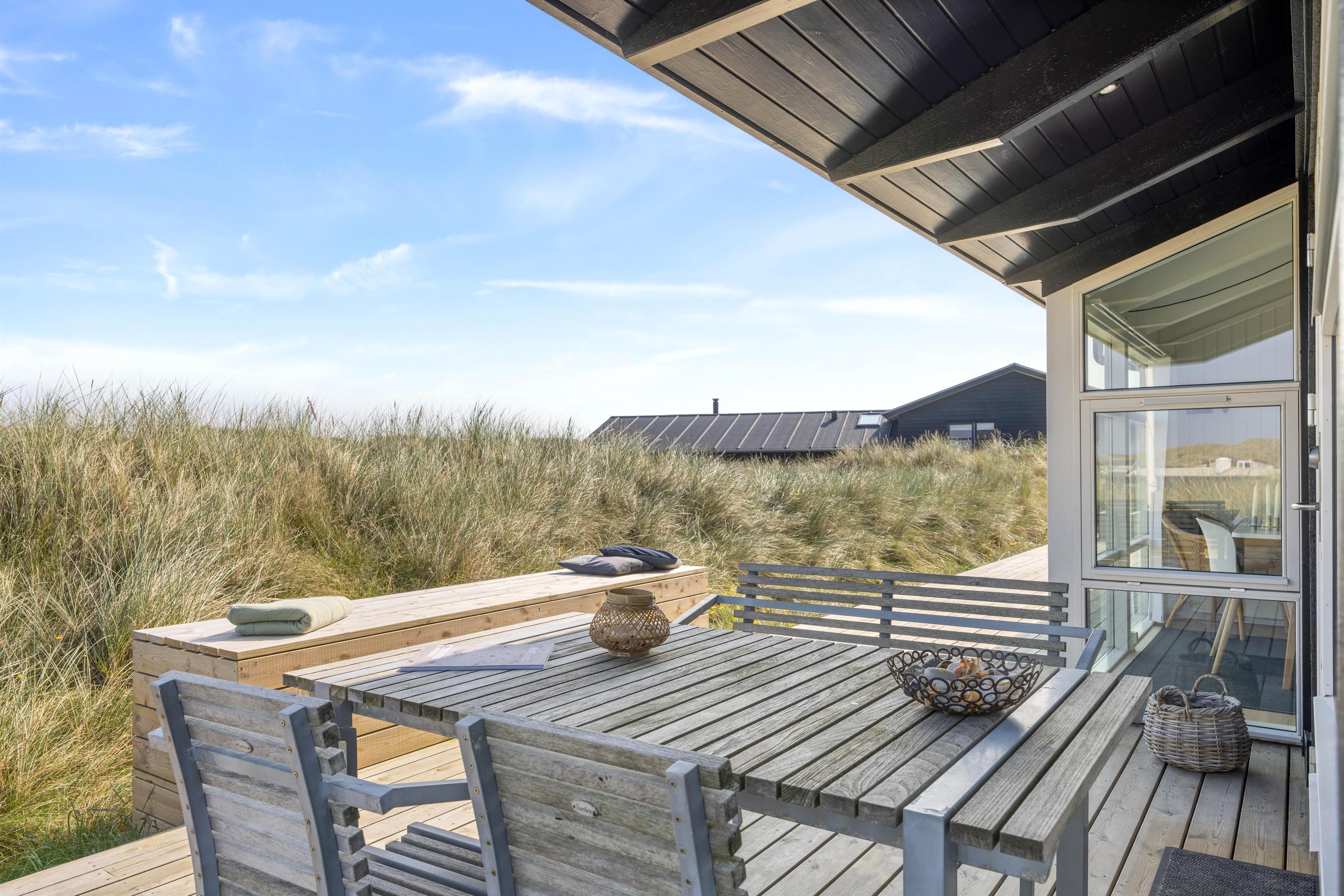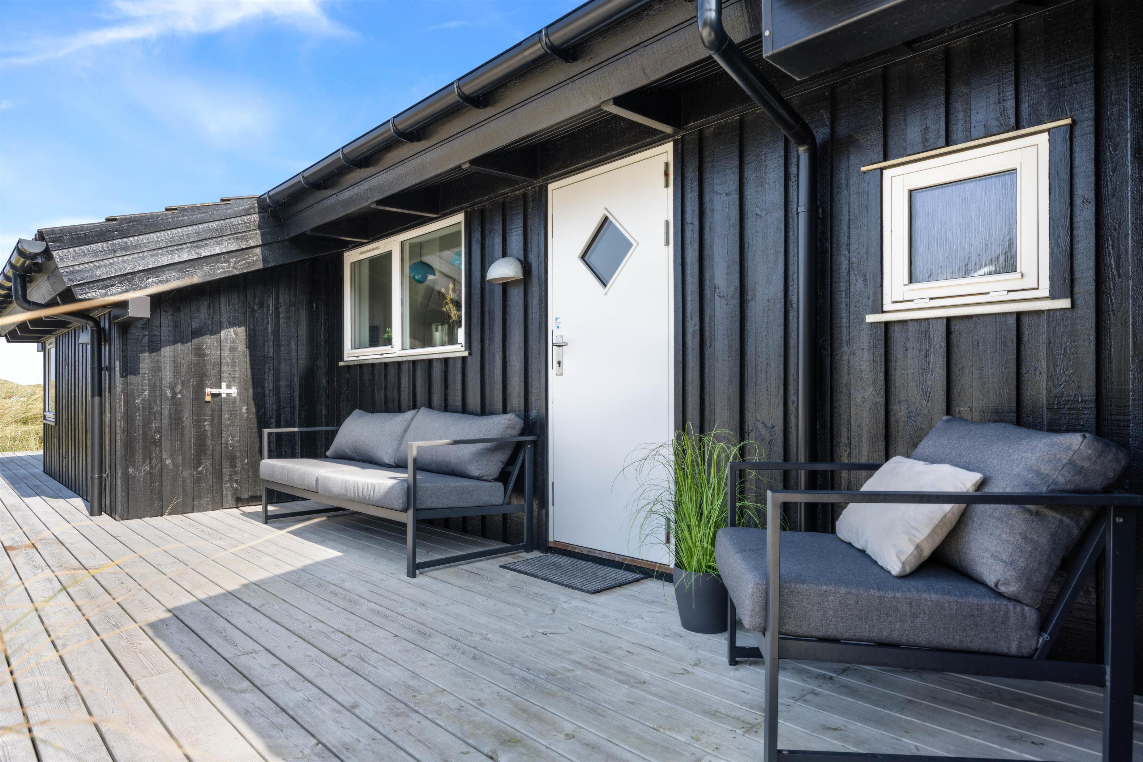 Sommerhusets har en stor og dejlig terrasse. Den strækker sig næsten hele vejen omkring feriehuset, hvilket betyder, at I altid kan finde et dejligt hjørne med sol eller læ. Den er også delvist afskærmet og delvist lukket, så I har privatliv, når I ligger og soler jer eller griller med familien.