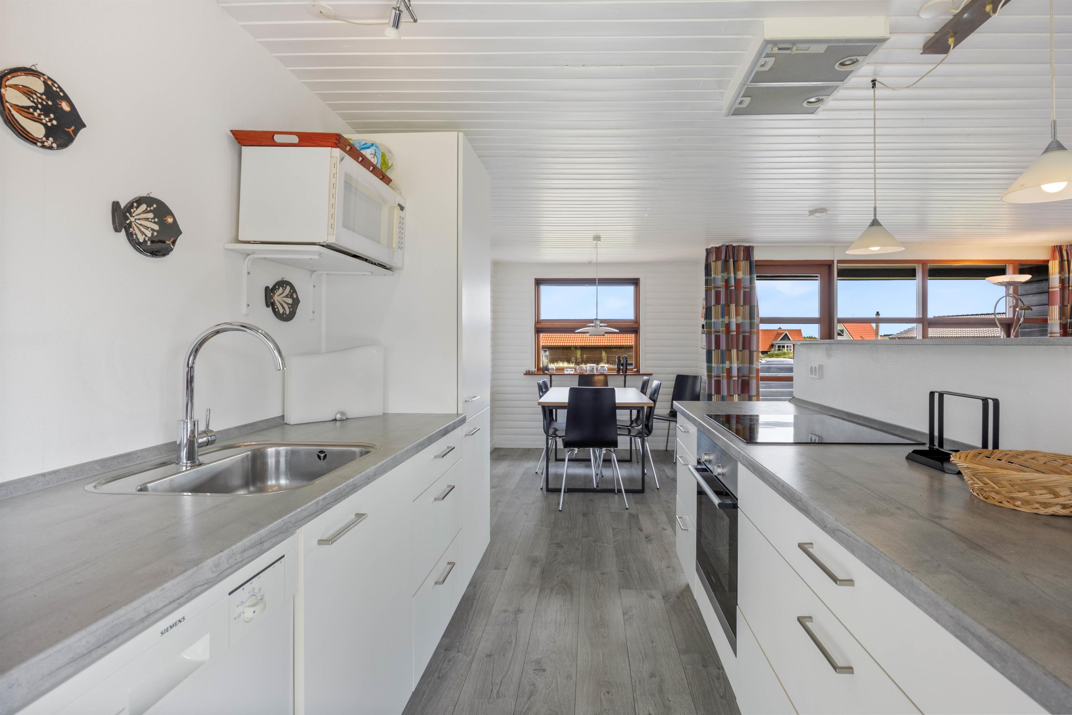 Sommerhuset er indrettet klassisk, enkelt og hyggeligt. Her er der lige præcis det nødvendige, for at skabe rammerne til en god og mindeværdig ferie. Køkkenalrummet, som er både lyst og funktionelt, bliver sikkert jeres samlingspunkt i sommerhuset. Hvor I altid vil kunne lave et lækkert måltid, mens I lytter til børnene hygge sig i sofaområdet. I køkkenet er der desuden mikroovn, en 75 liter fryser og opvaskemaskine, som kan tage opvasken for jer.