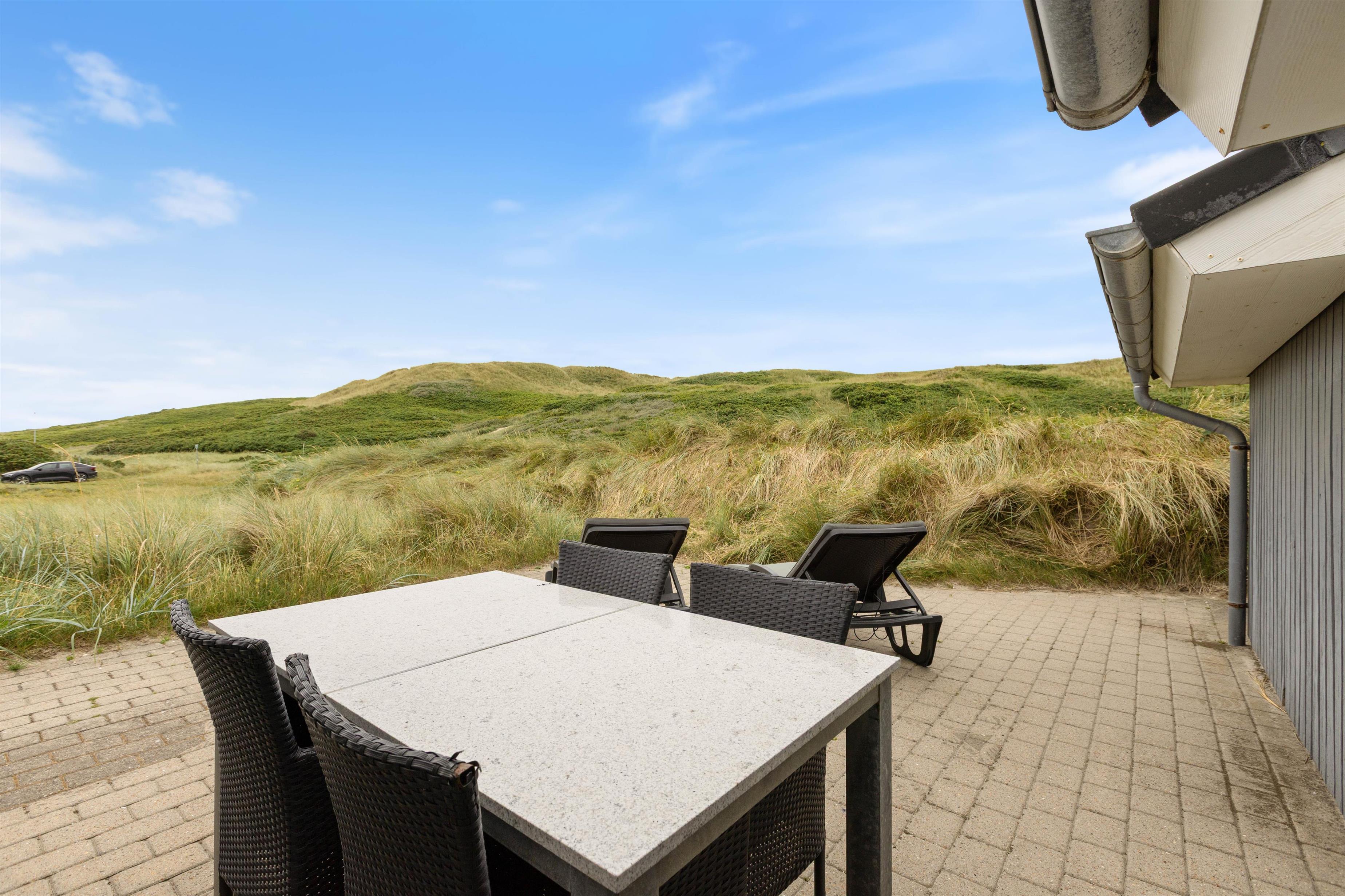 Dagen kan afsluttes med et lækkert grillmåltid i den friske havluft, mens solen går ned bag klitterne til lyden af havets brusen. Terrassen er delvist afskærmet, så I kan sidde i læ for vinden.
