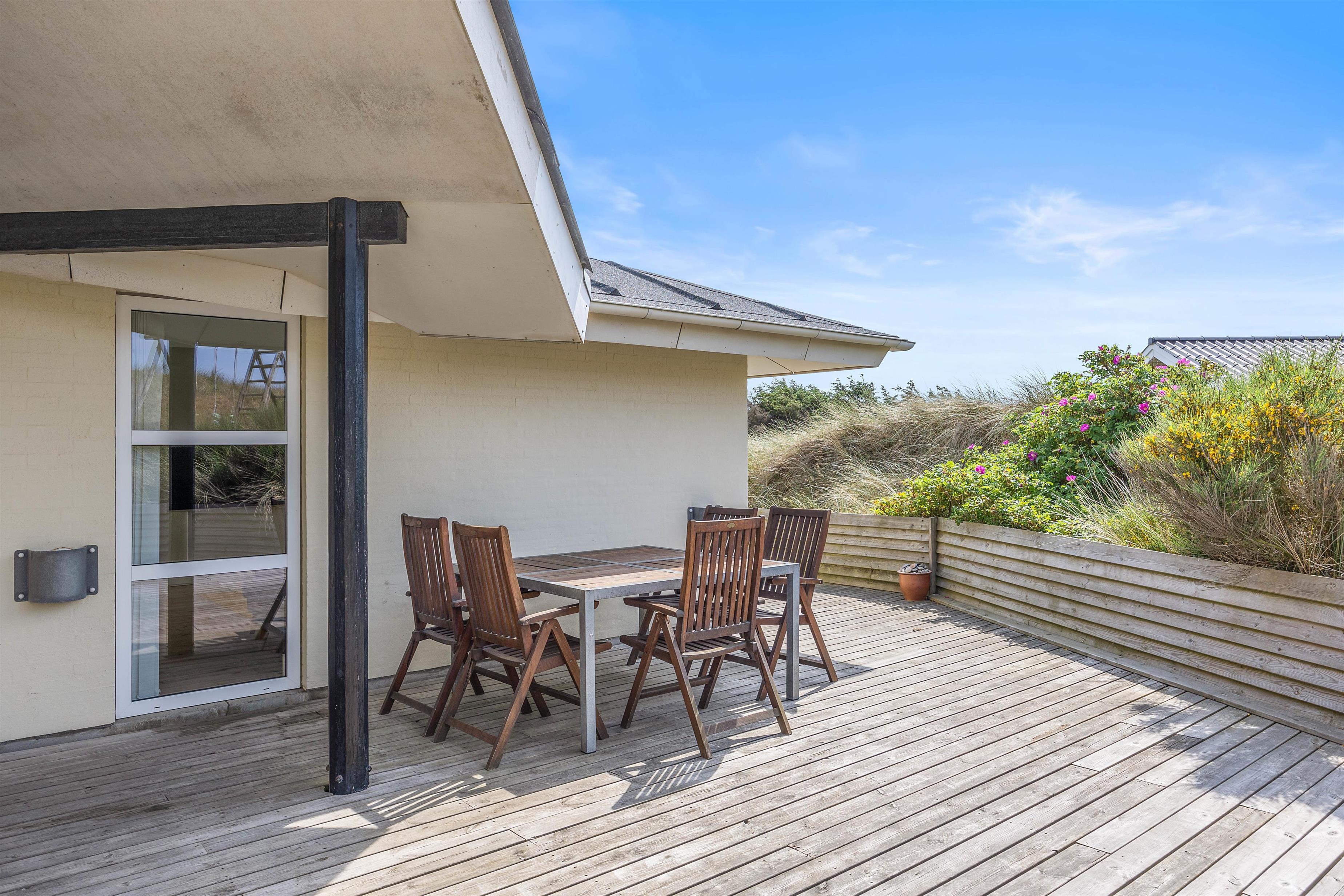 Udenfor har du en dejlig stor terrasse, der indbyder til solbadning, afslapning og frokoster i det fri på de gode sommerdage.Terrassen har også flere gode hyggehjørner, så du ofte kan sidde i læ.