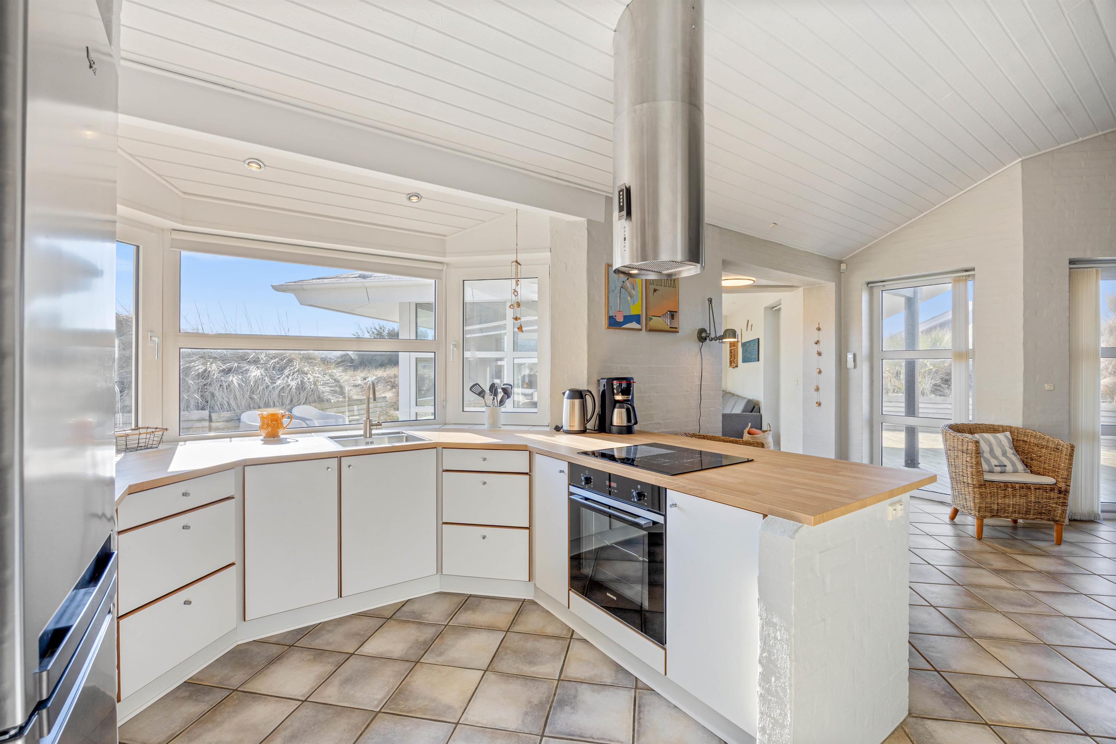 Der er et dejligt lyst og rummeligt køkken, hvor du kan lave lækkert feriemad eller tilbehør til grillbøfferne. Og i opholdsrummene er der lavet flere hyggekroge, så der er rig mulighed for at hygge sig med brætspil, en god film eller bare ren afslapning, hvor du kan nyde udsigten til naturgrunden og klitterne.