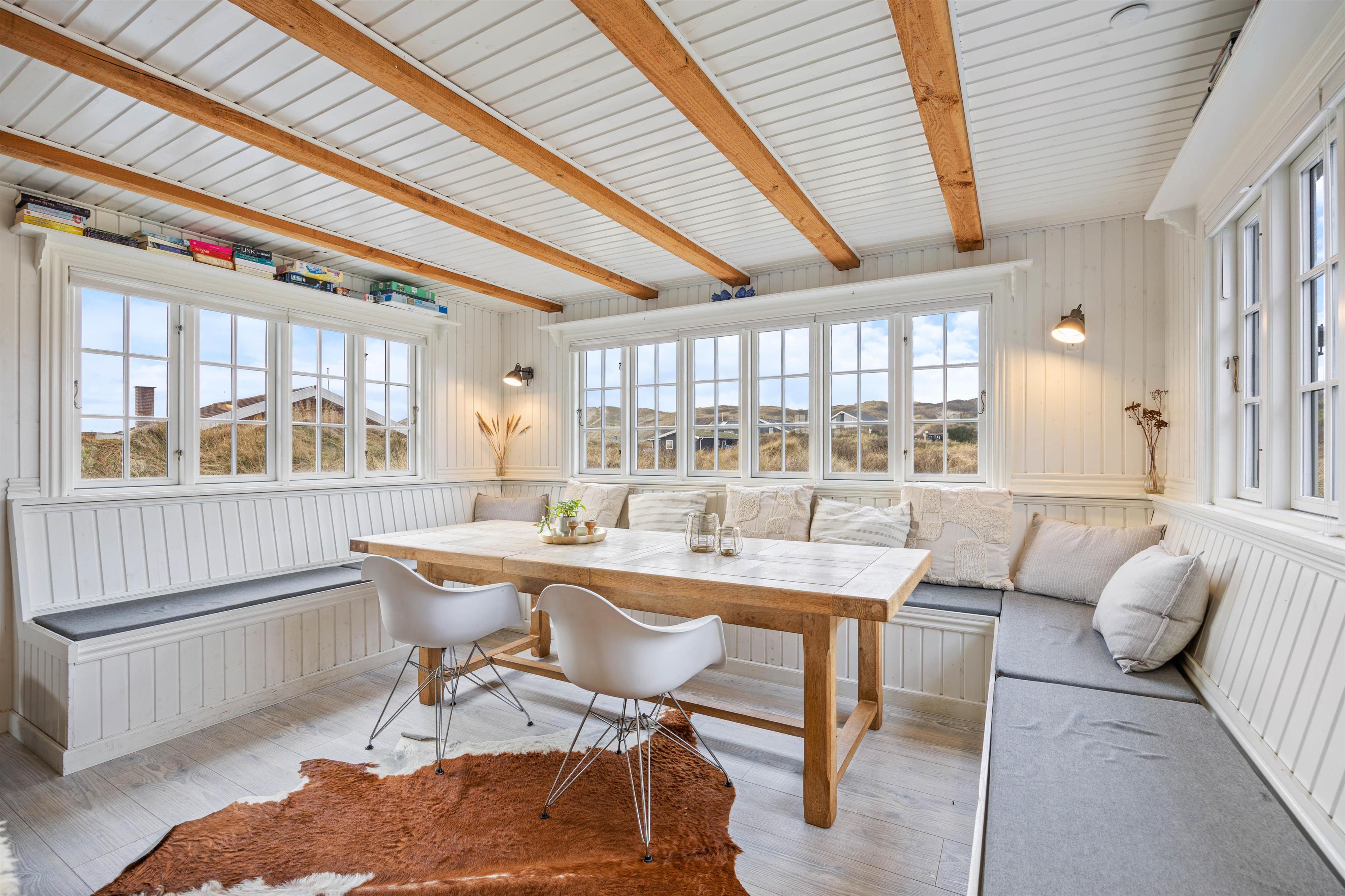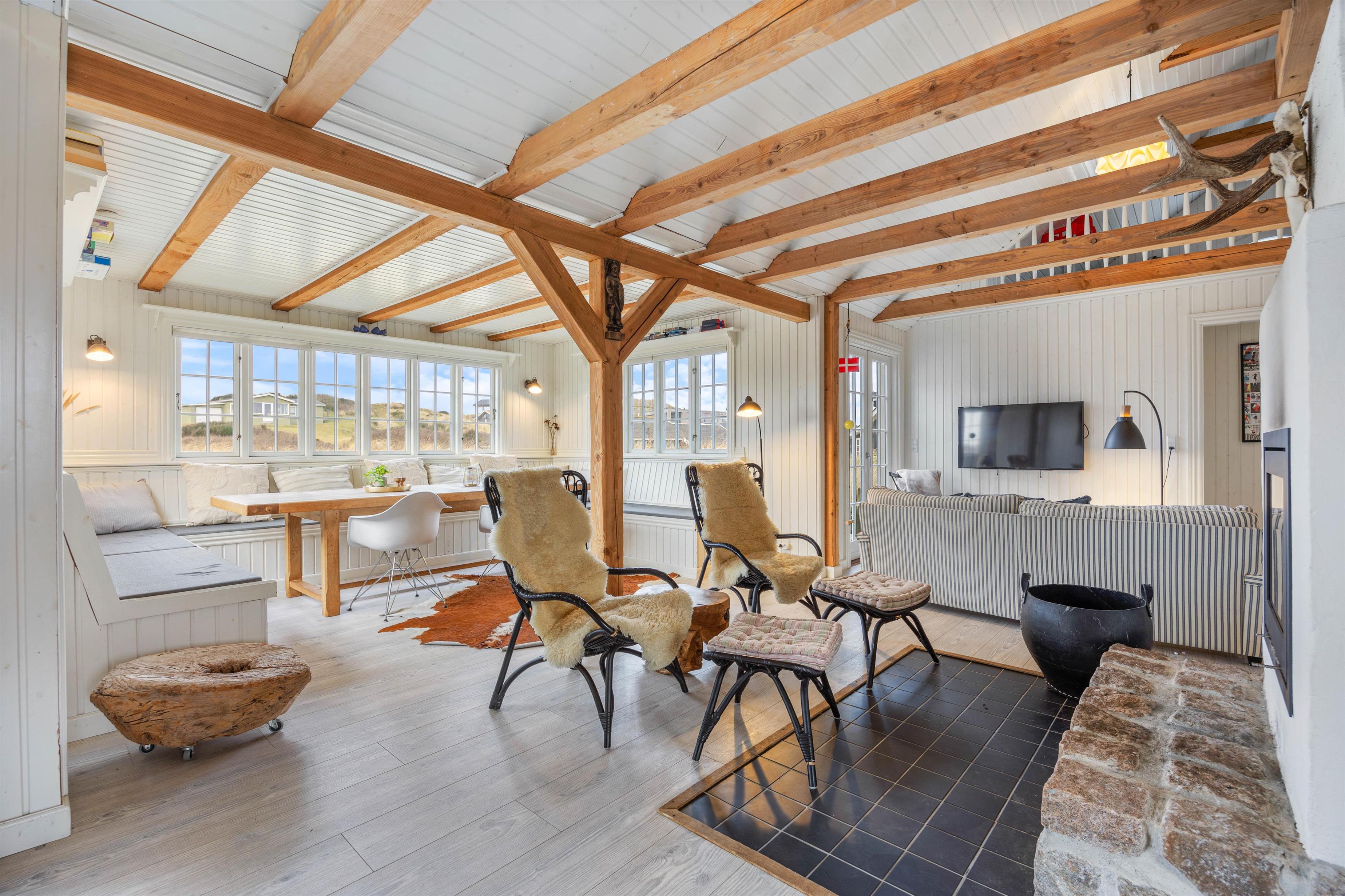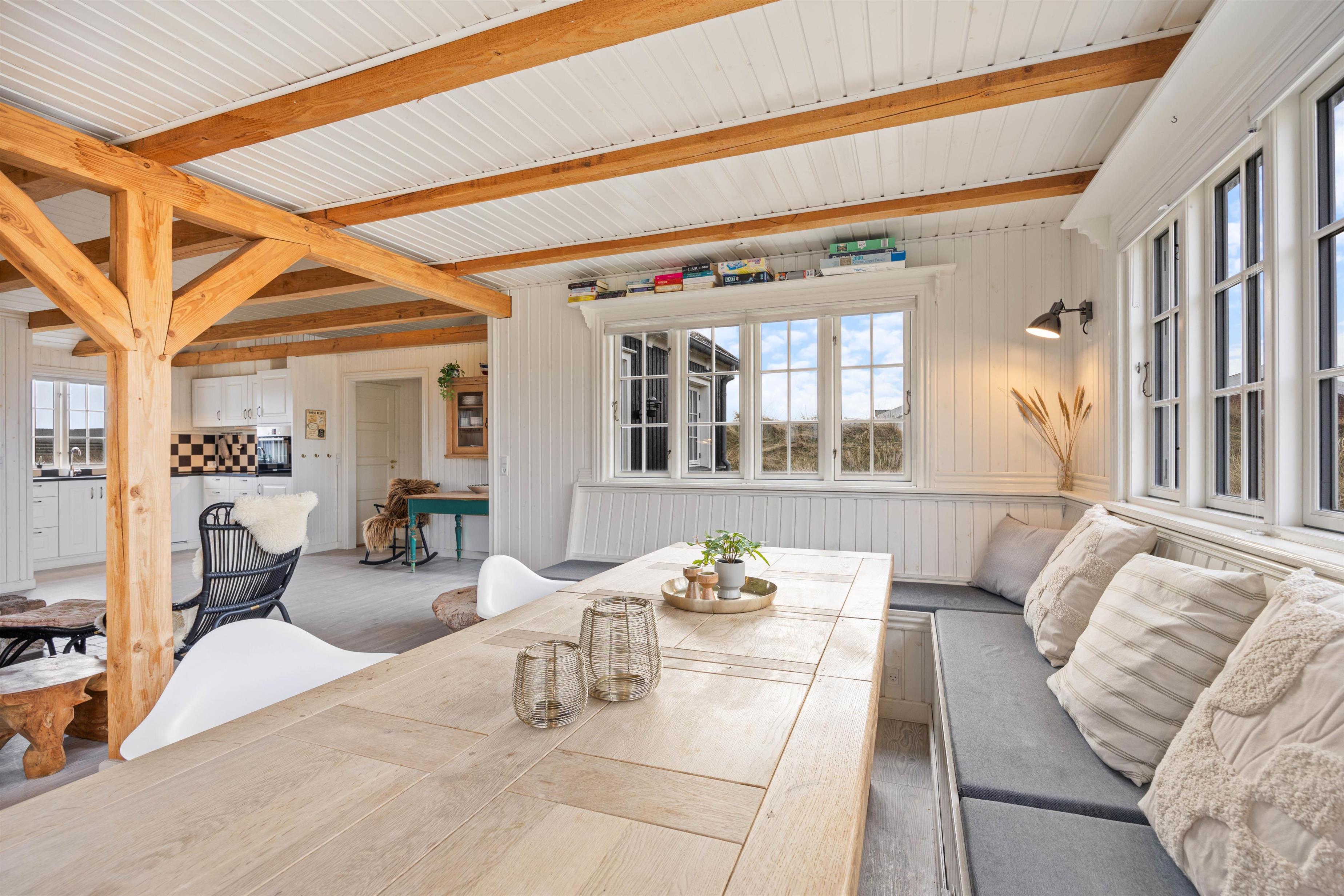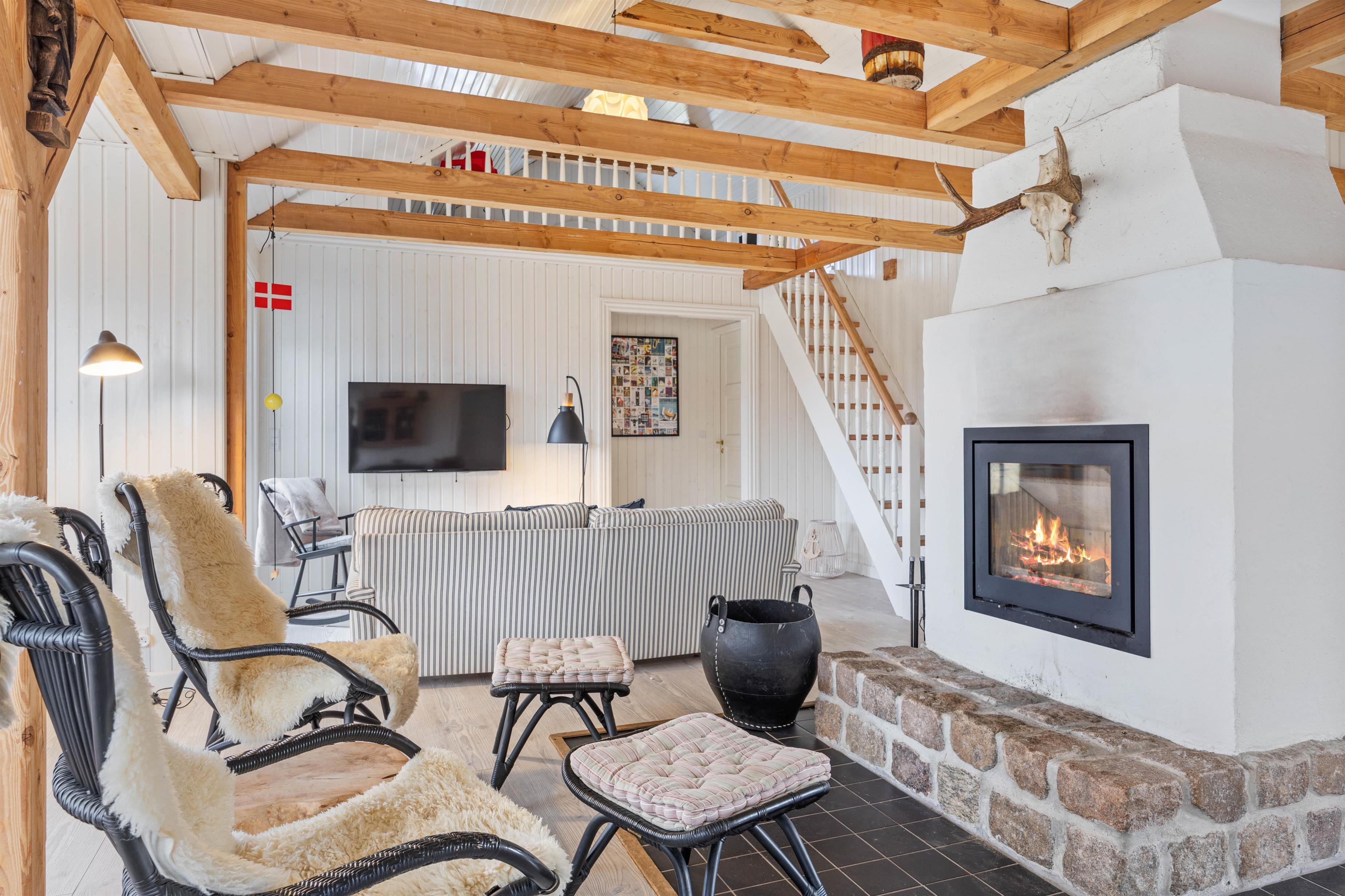 Der er et skønt køkken, hvor du kan tilberede lækre måltider eller tilbehør til til grillkødet. Hyg dig med en god bog på den brede bænk i karnappen, og nyd flammerne i den store pejs som er centralt placeret i den smukke rum. Den store pejs, de fritlagte bjælker og det fantastiske lysindfald i husets centrale rum, gør det til en skøn oase, som du bare ikke har lyst til at tage hjem fra. Karnappen med den brede bænk er perfekt til skønne måltider, lange spilleaftner og hygge med venner og familien.