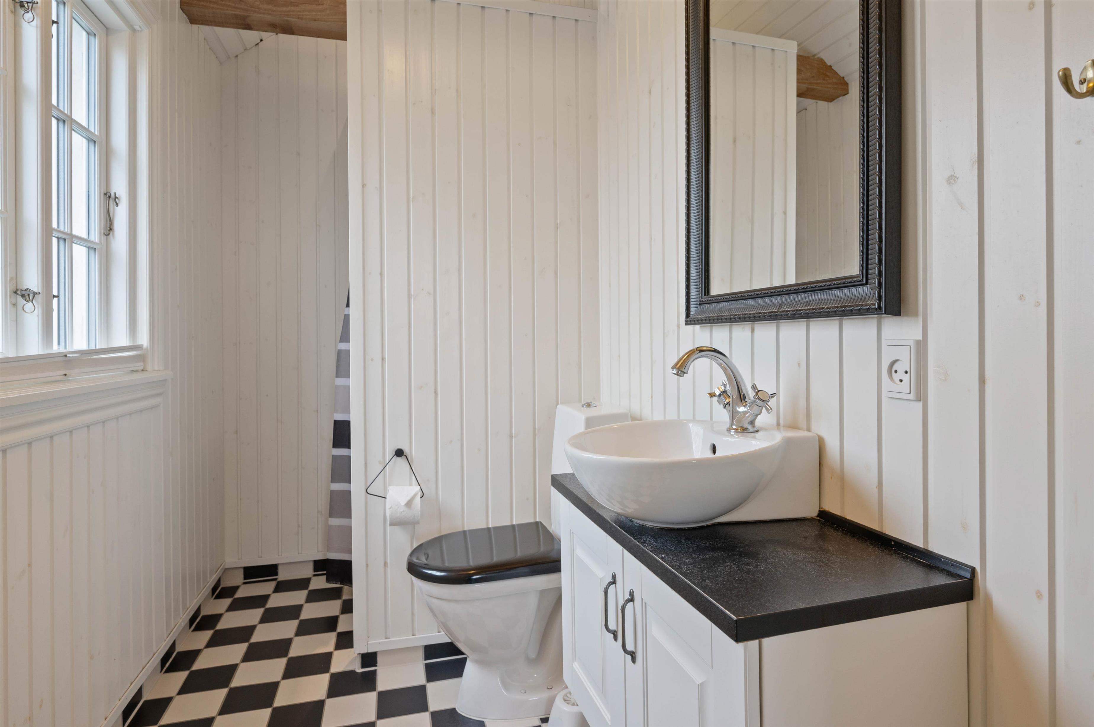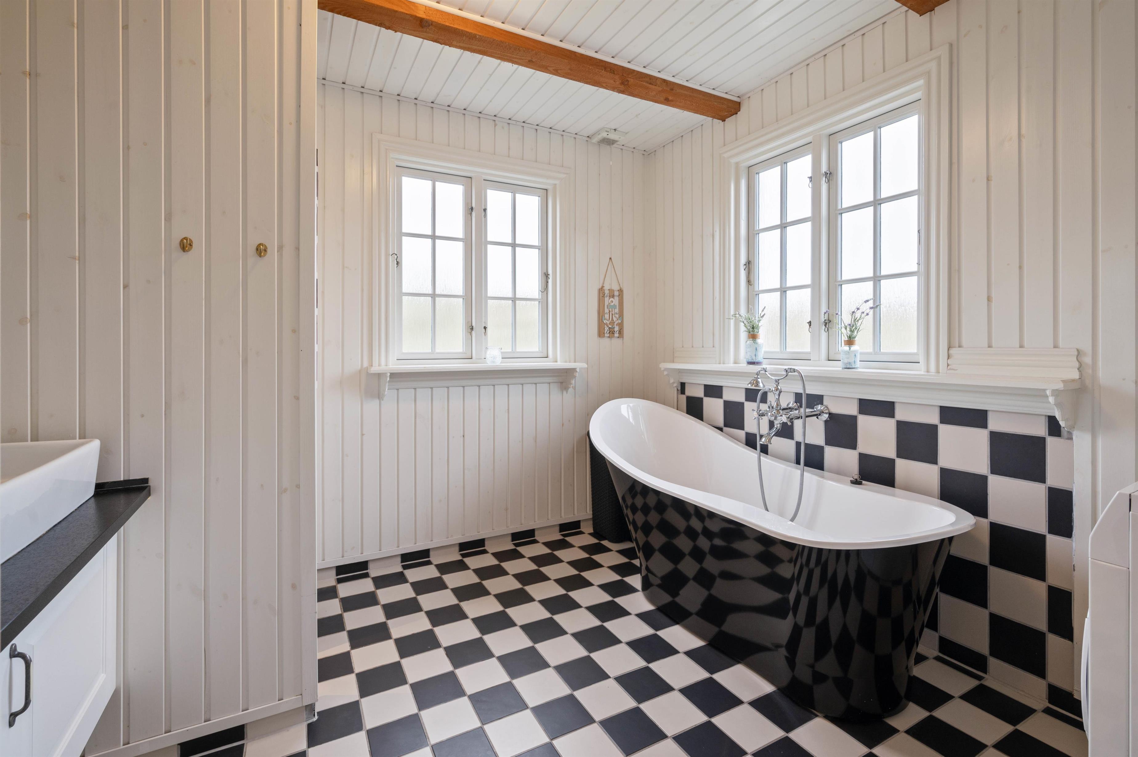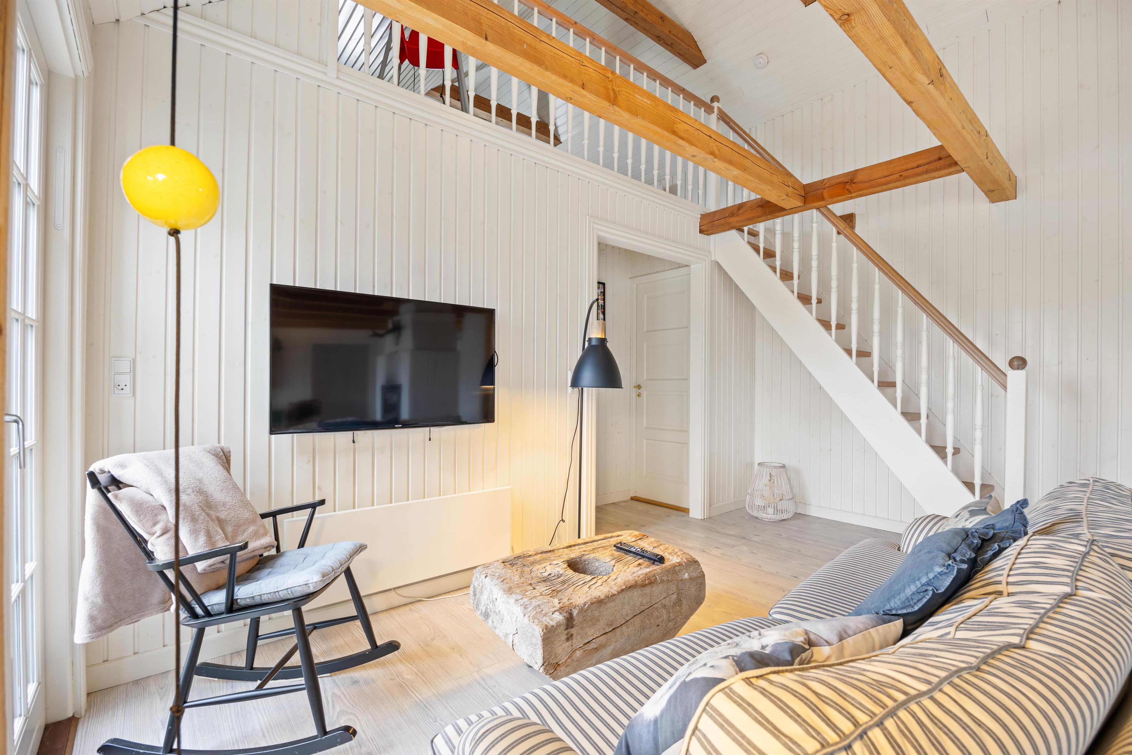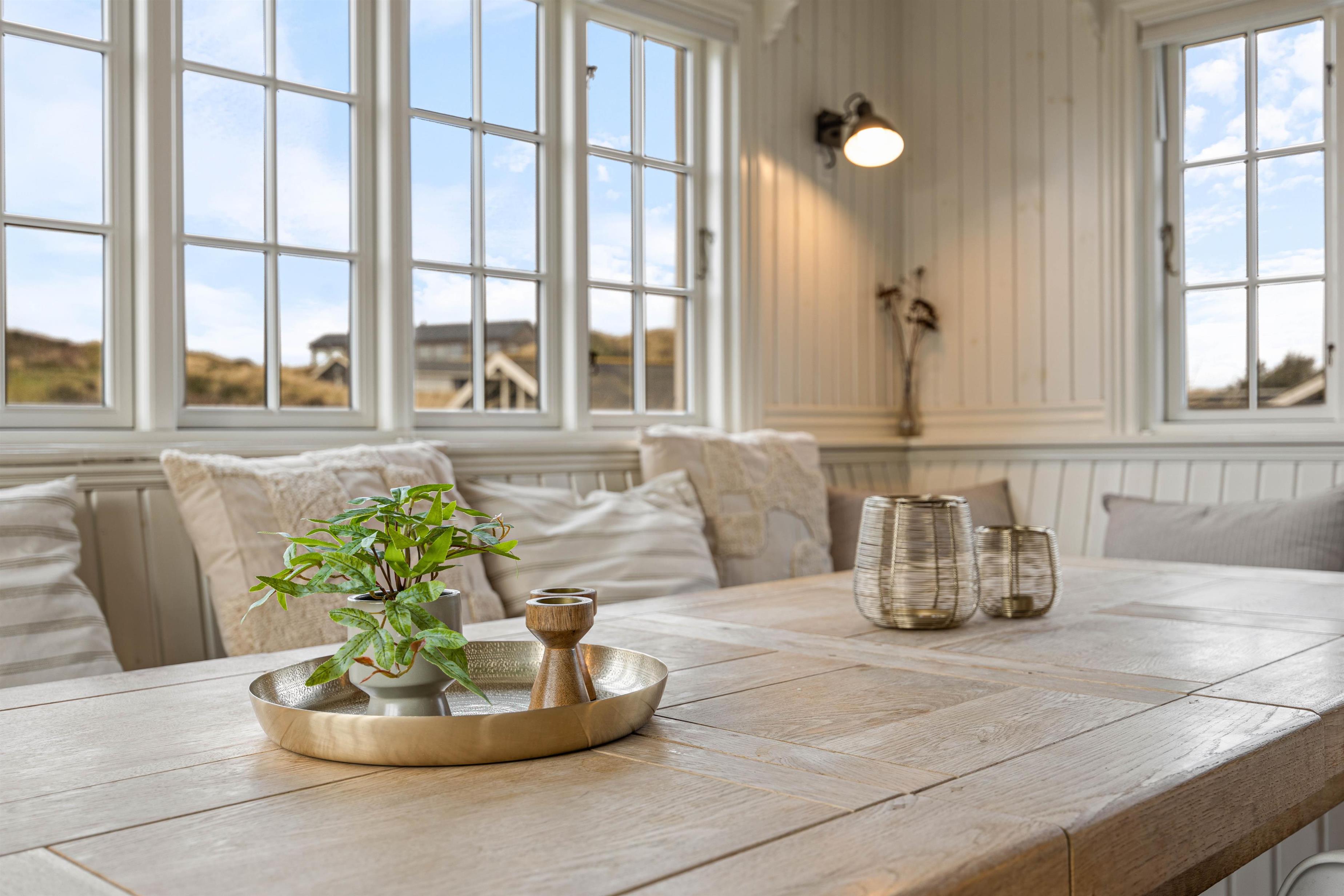 Der er et skønt køkken, hvor du kan tilberede lækre måltider eller tilbehør til til grillkødet. Hyg dig med en god bog på den brede bænk i karnappen, og nyd flammerne i den store pejs som er centralt placeret i den smukke rum. Den store pejs, de fritlagte bjælker og det fantastiske lysindfald i husets centrale rum, gør det til en skøn oase, som du bare ikke har lyst til at tage hjem fra. Karnappen med den brede bænk er perfekt til skønne måltider, lange spilleaftner og hygge med venner og familien.