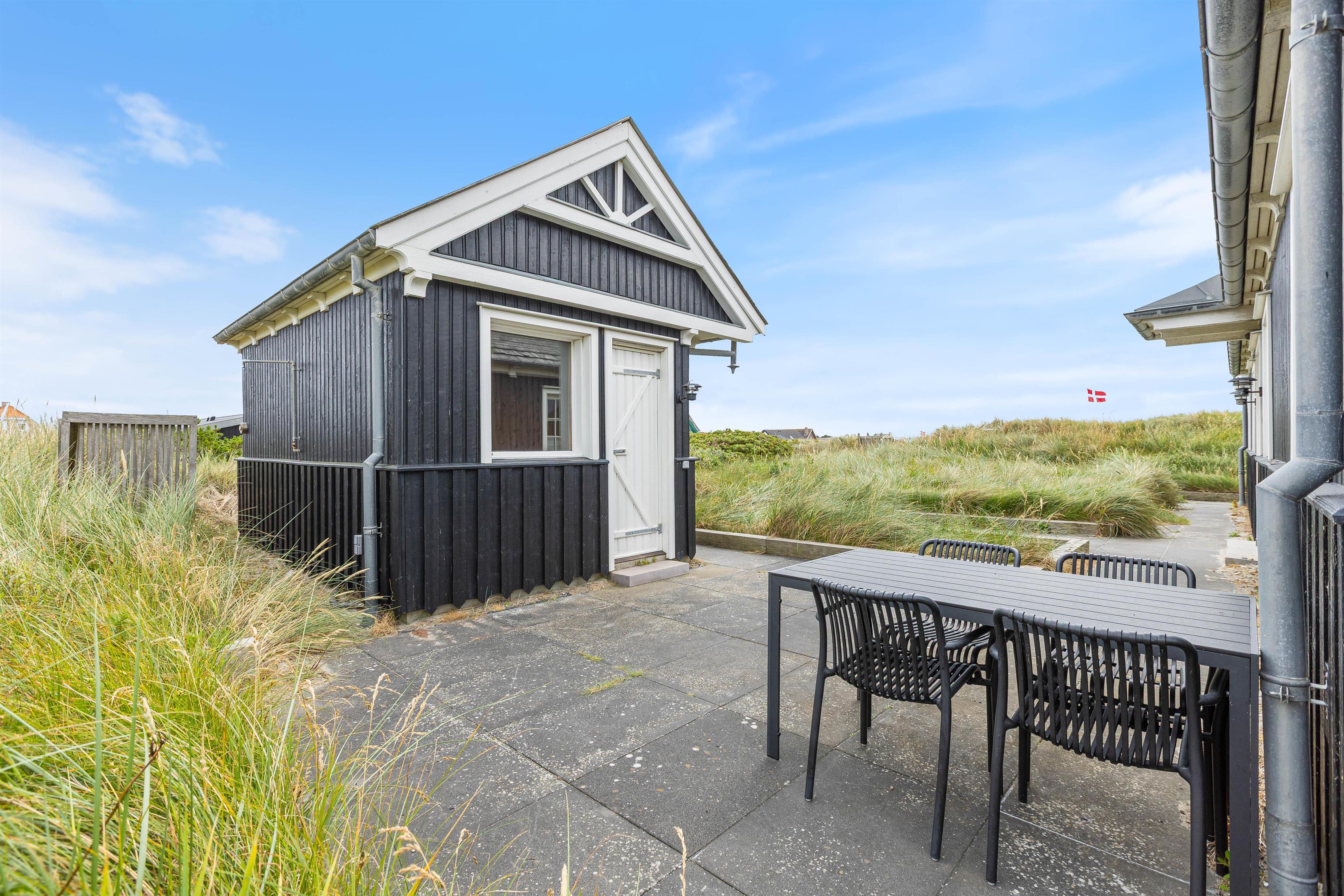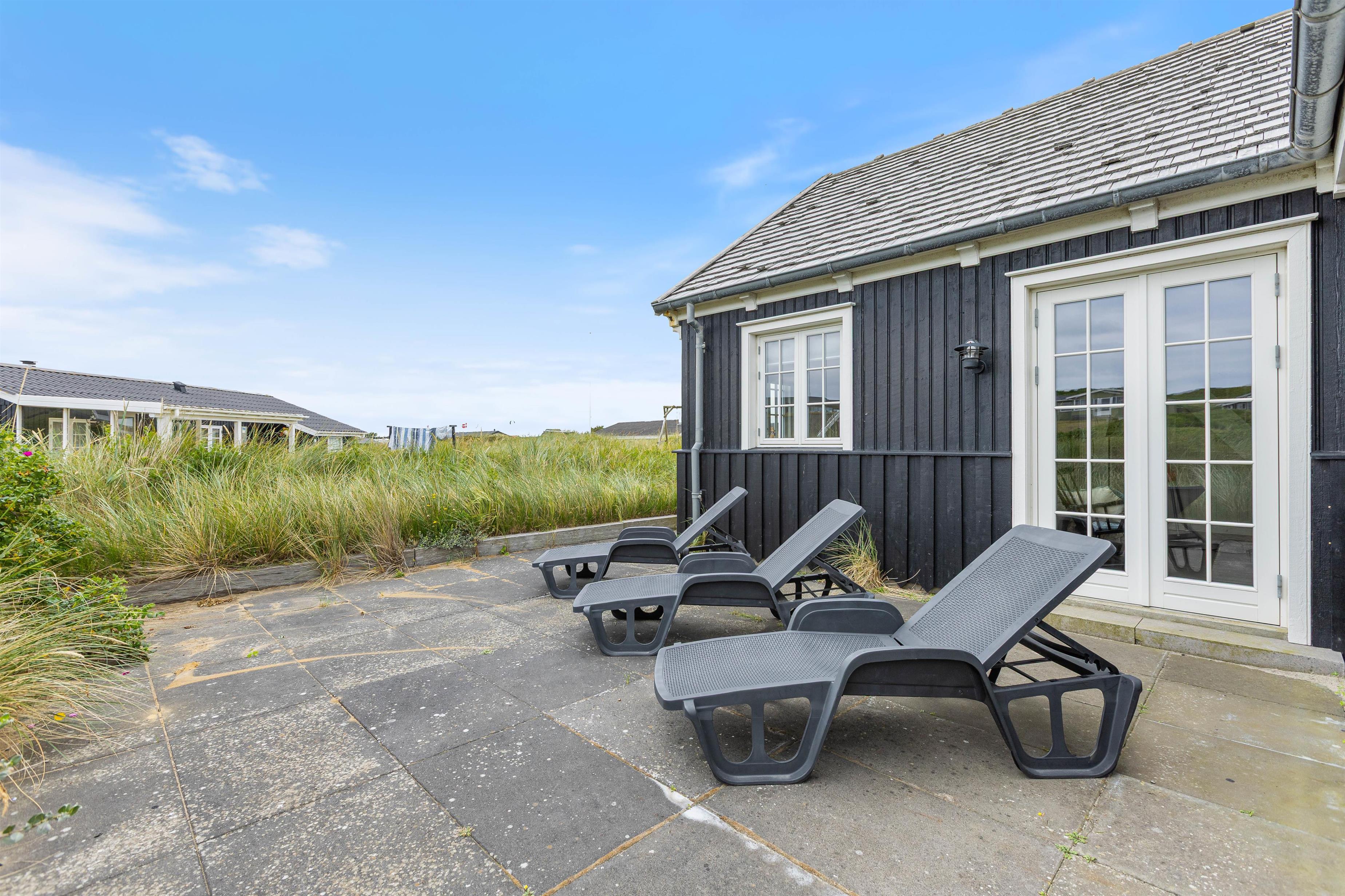 Til feriehuset hører der også skønne terrasser. Her kan du altid finde en hyggelig krog, nyde roen og de smukke omgivelser – måske endda med et glas vin, mens bøfferne vendes på grillen og du hører Vesterhavets brusen i det fjerne.