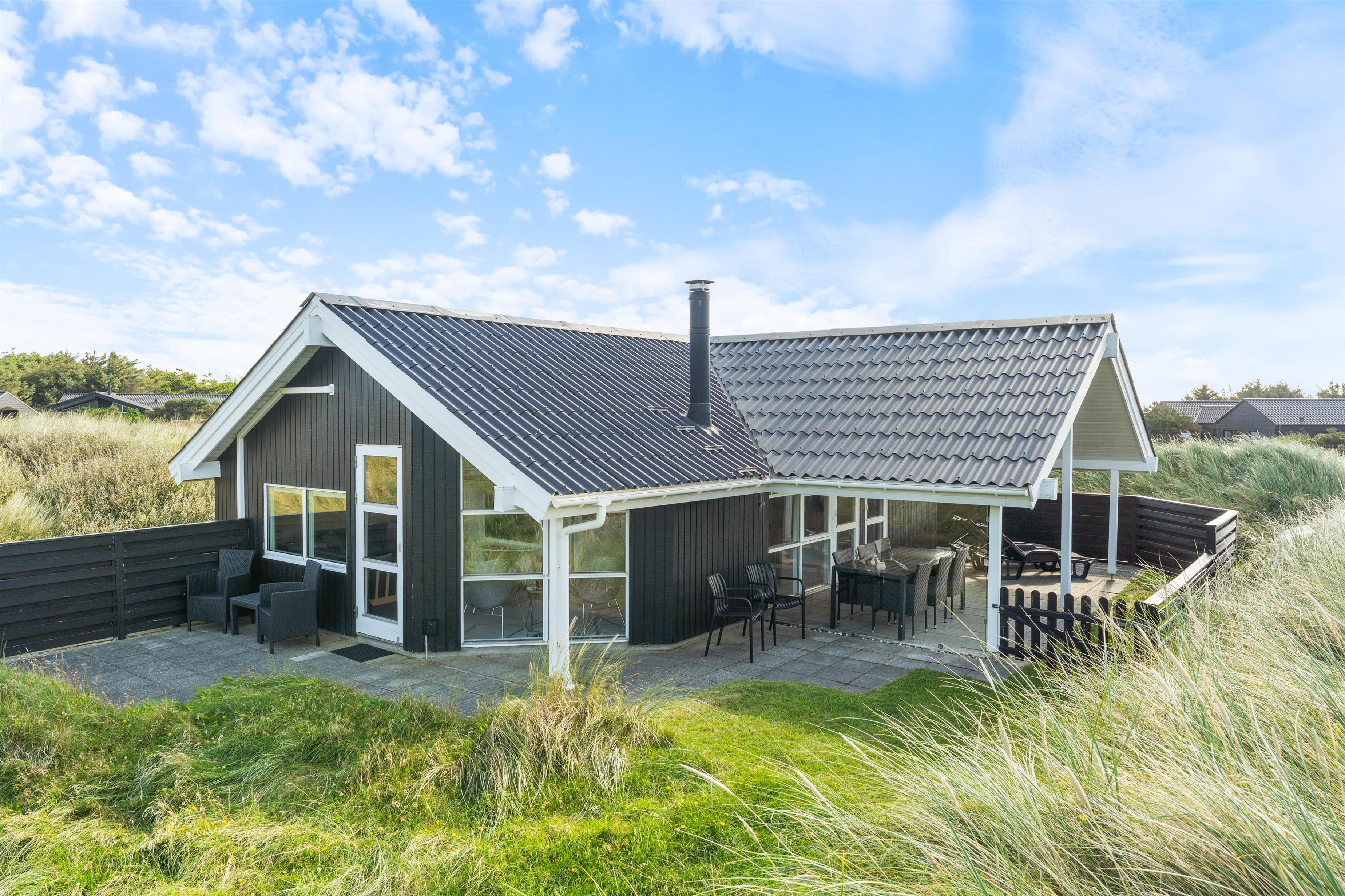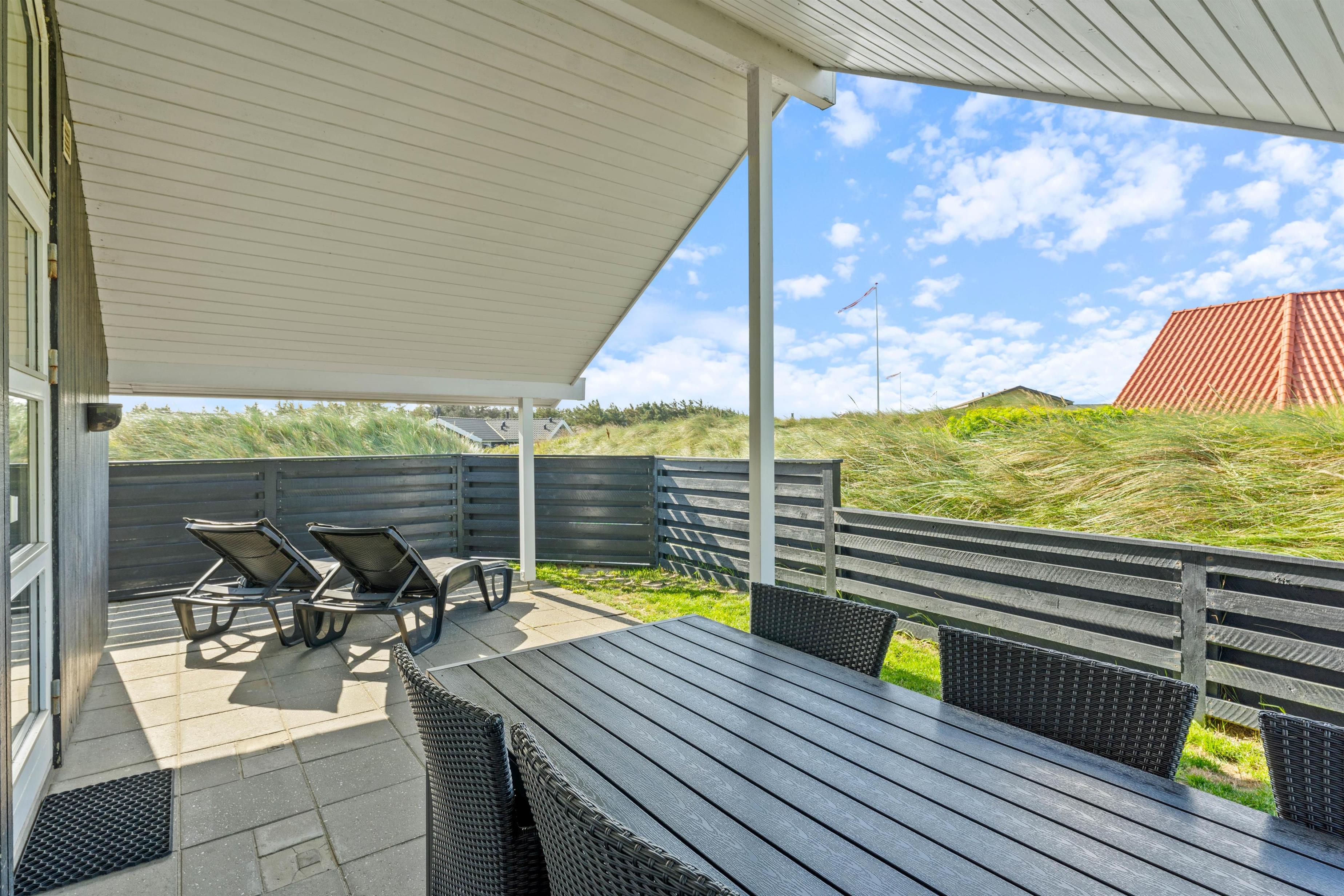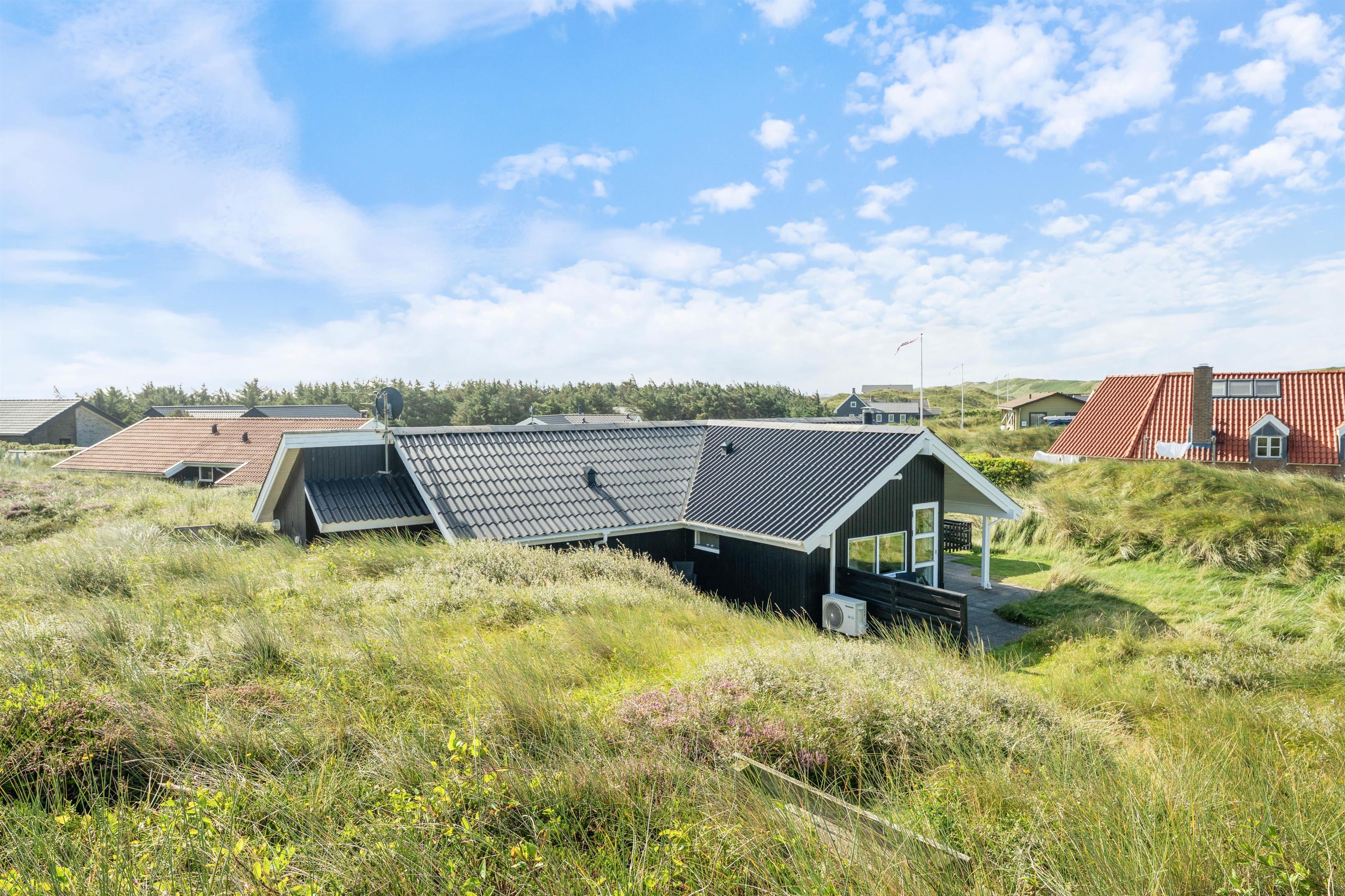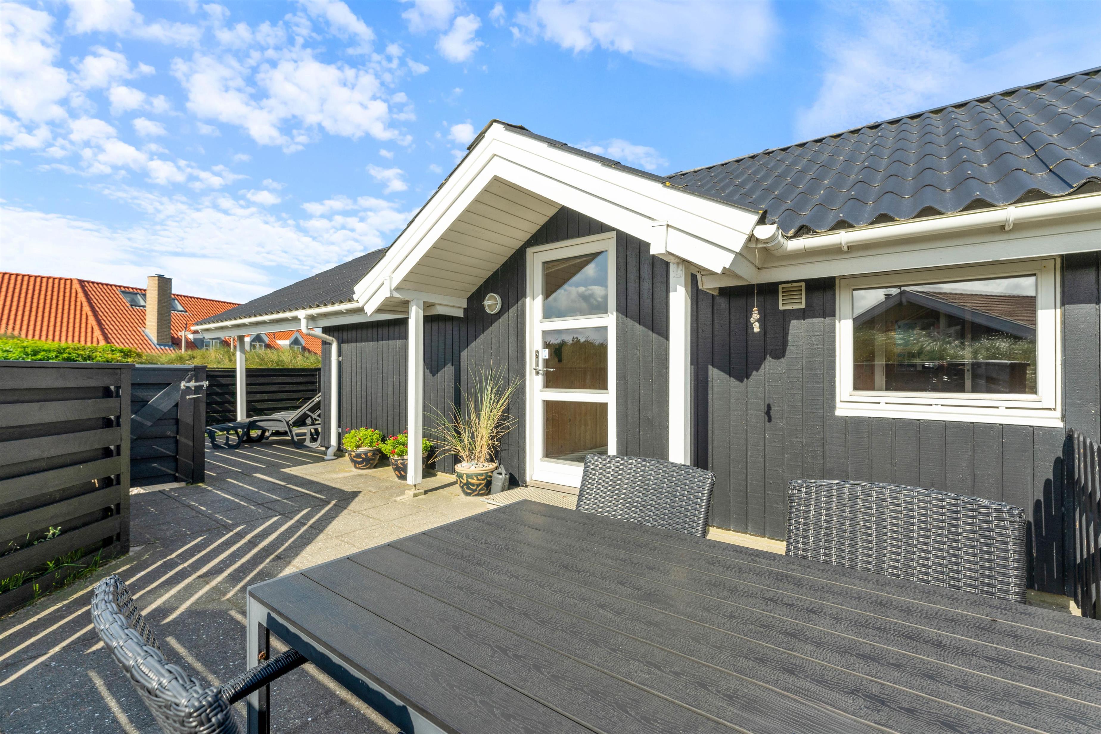 Udenfor finder I en skøn terrasse, som løber næsten hele vejen rundt om huset og byder både på god afskærmning, en overdækket del og jeres egen lille græsplæne. En klitbanke rundt om huset sørger for yderligere læ og ugenerede dage i solen. Om aften kan I finde grillen frem og nyde aftensmaden udenfor.
