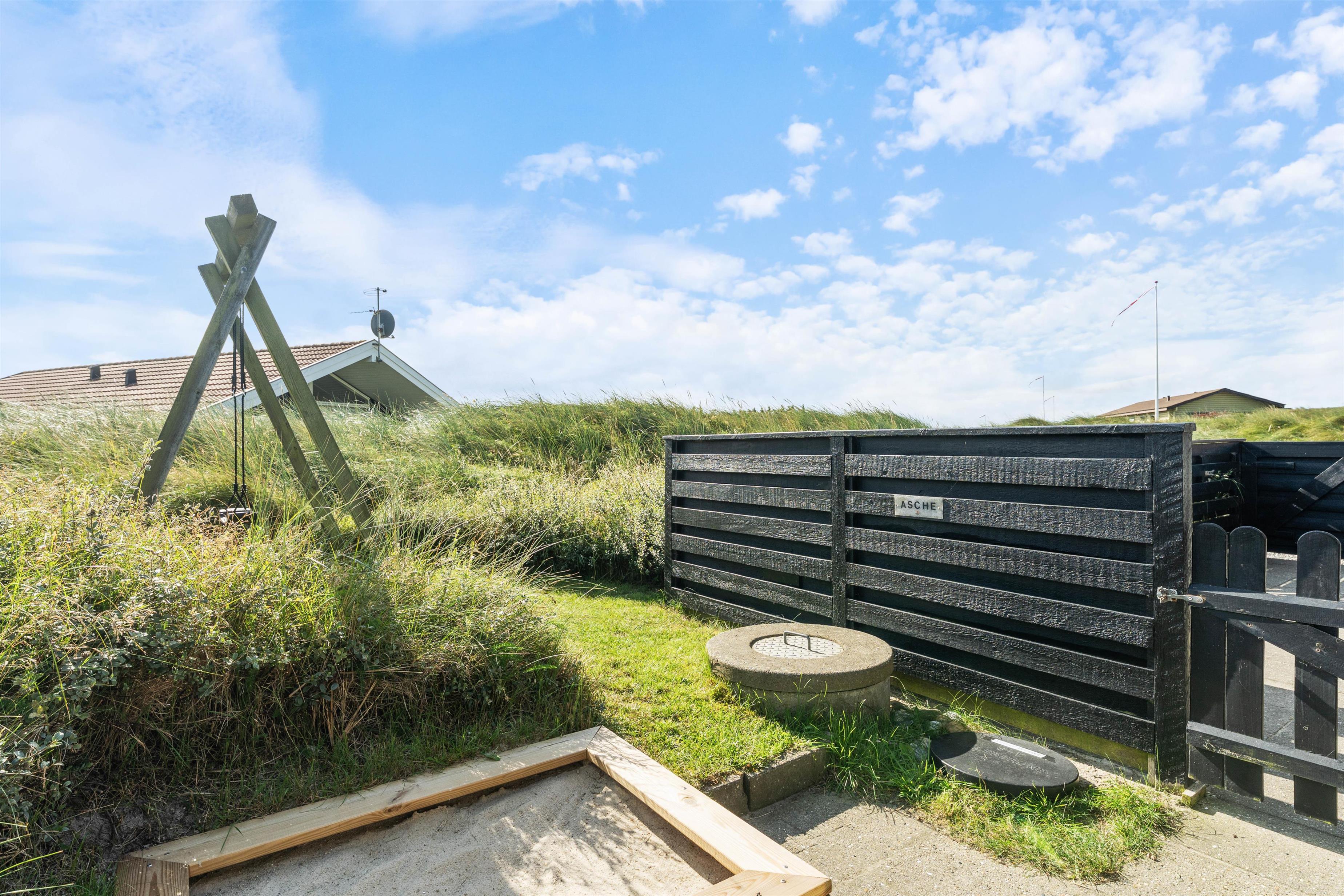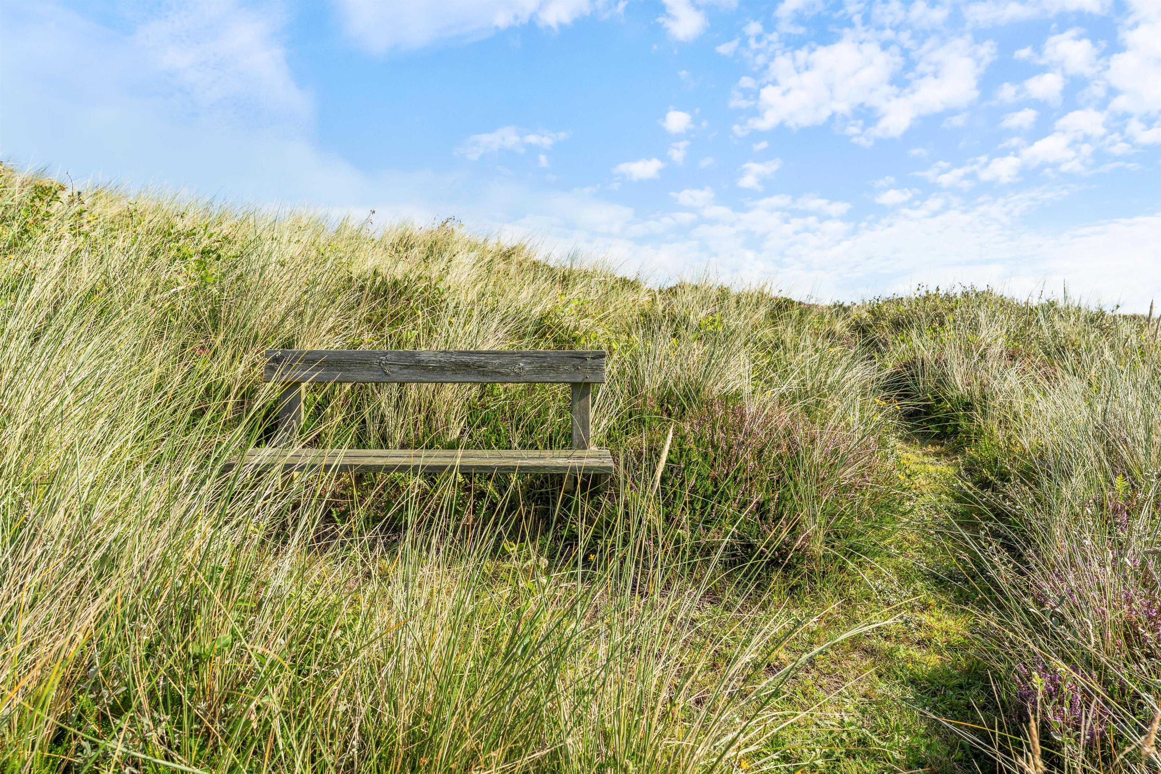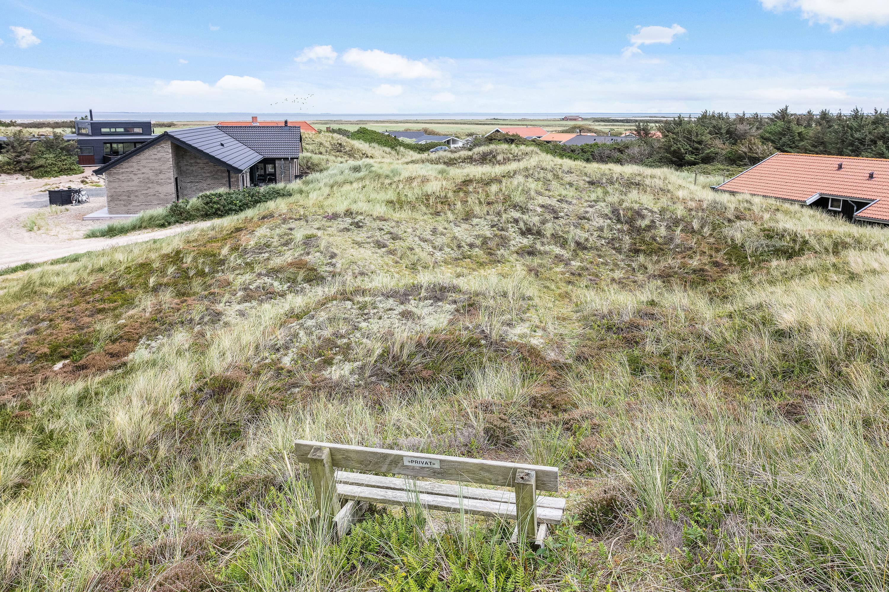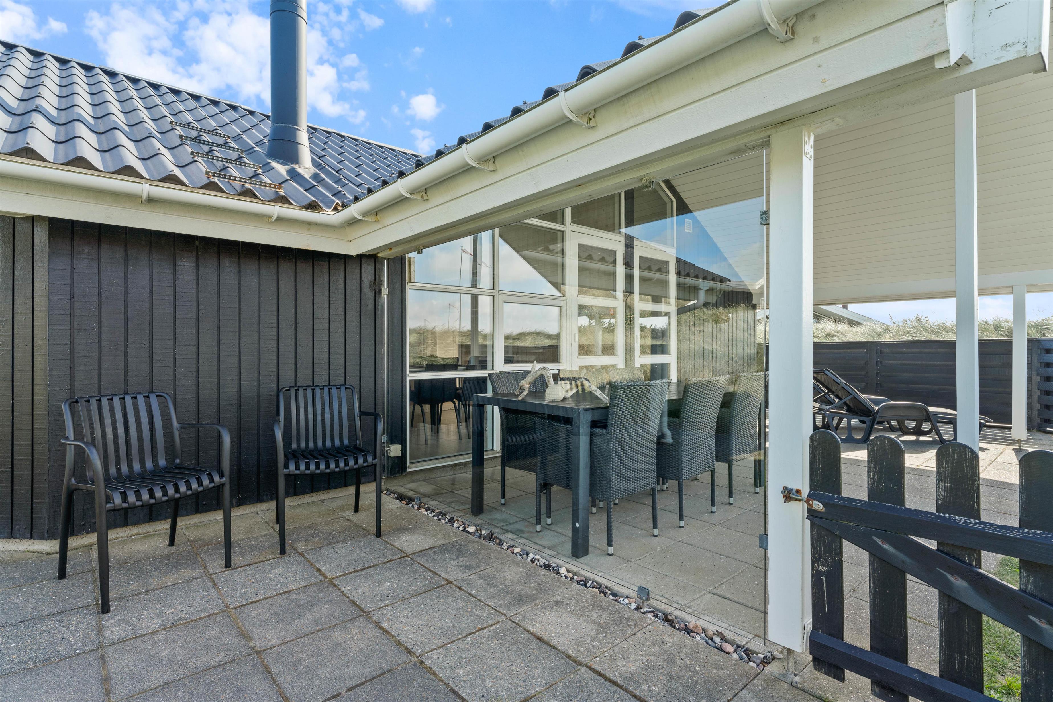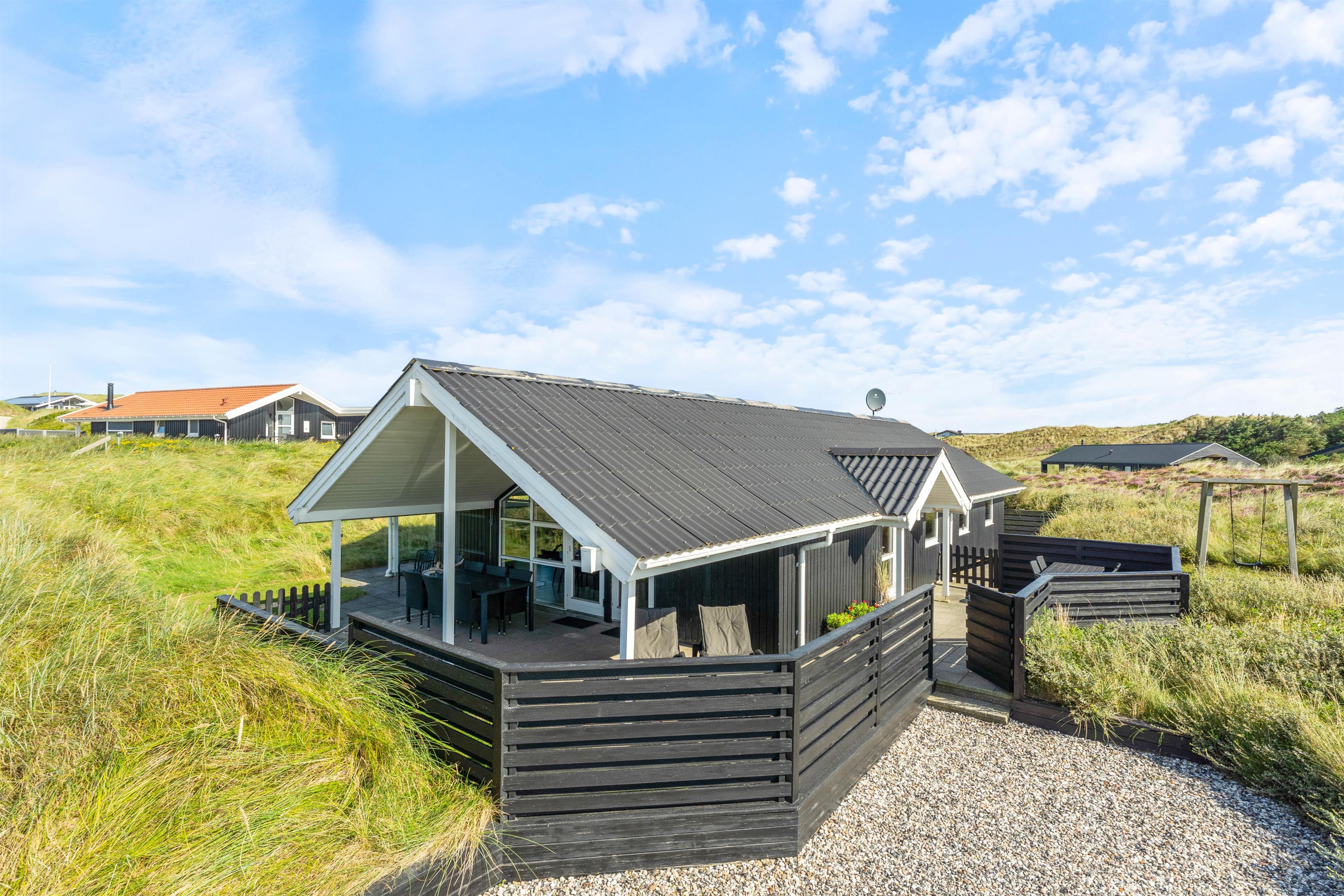 Udenfor finder I en skøn terrasse, som løber næsten hele vejen rundt om huset og byder både på god afskærmning, en overdækket del og jeres egen lille græsplæne. En klitbanke rundt om huset sørger for yderligere læ og ugenerede dage i solen. Om aften kan I finde grillen frem og nyde aftensmaden udenfor.