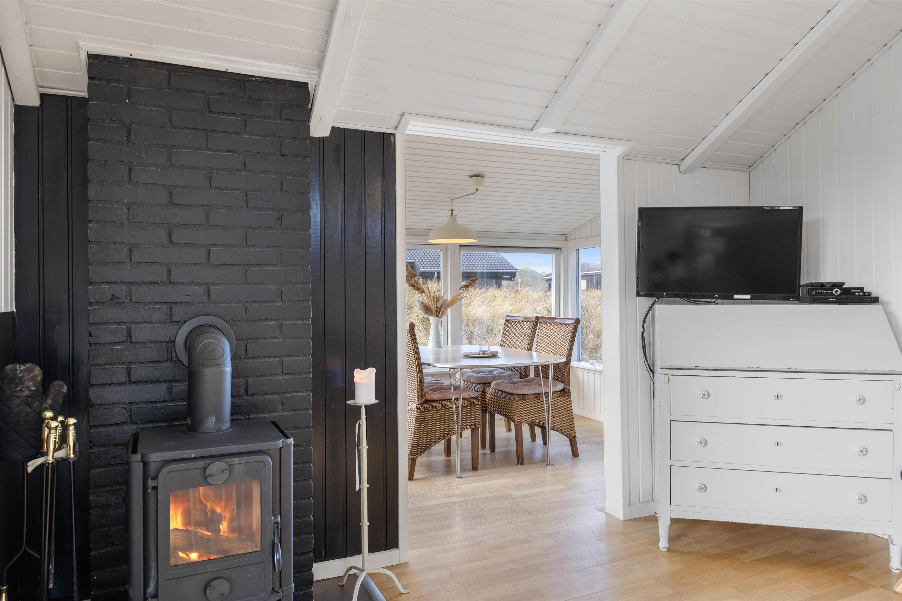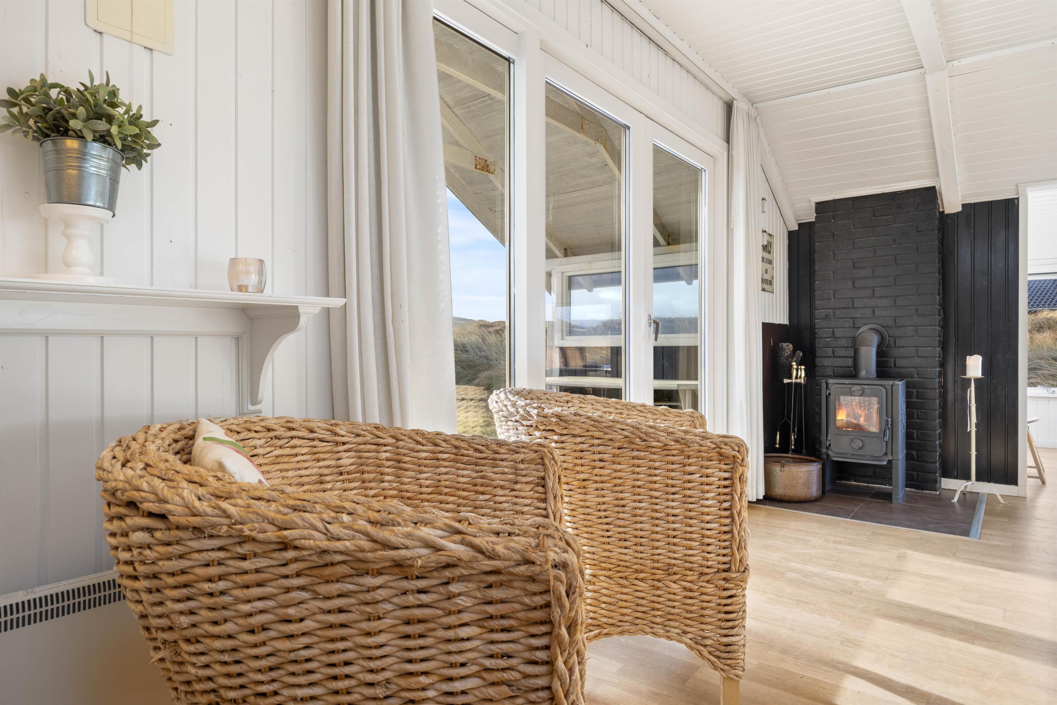 Vinduerne, der blev installeret i 2026, sikrer god isolering og et behageligt indeklima. Brændeovnen i stuen giver hyggelig varme på køligere dage, mens vinterhaven tilbyder en vidunderlig udsigt over Årgab-klitterne.