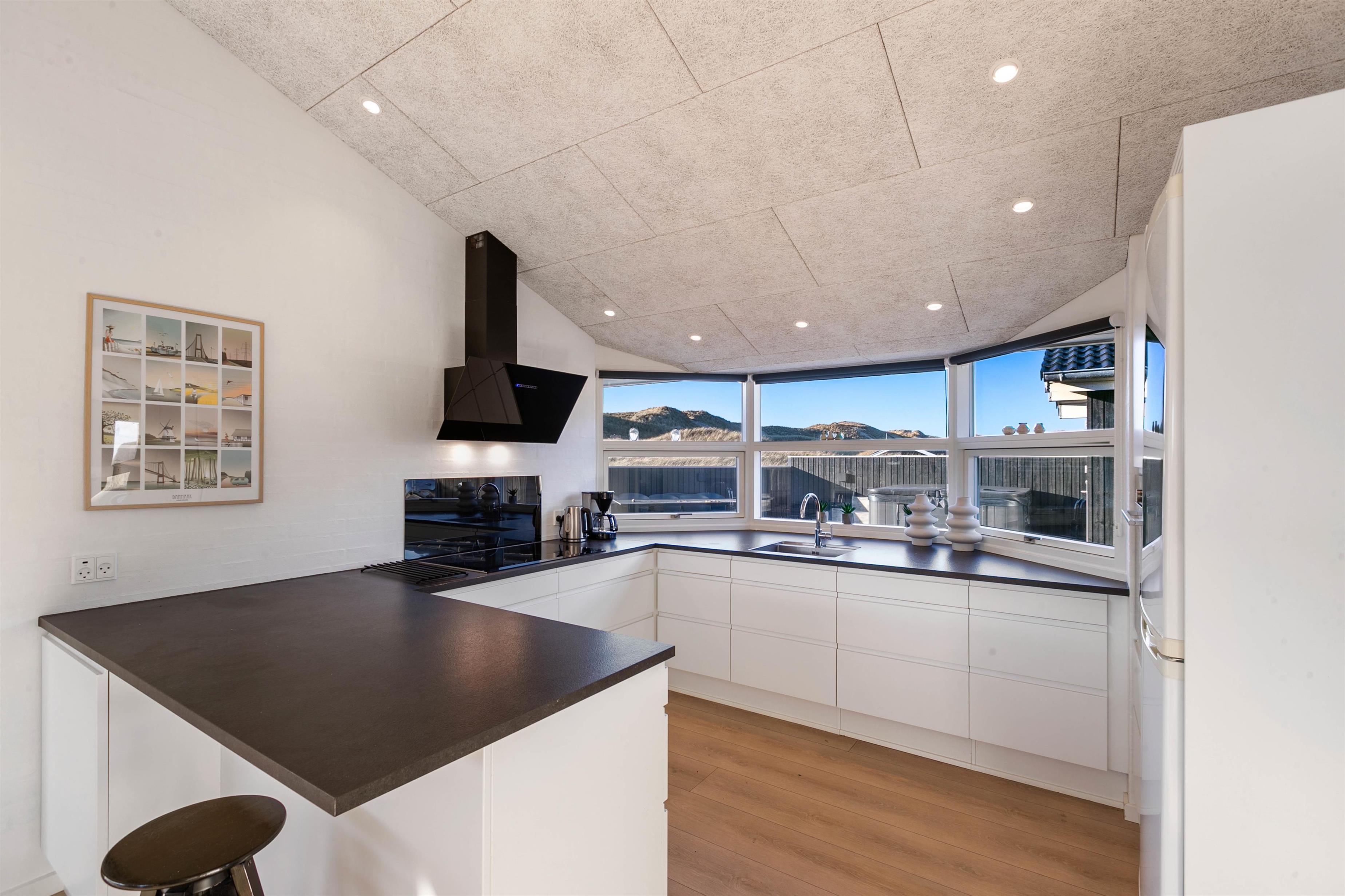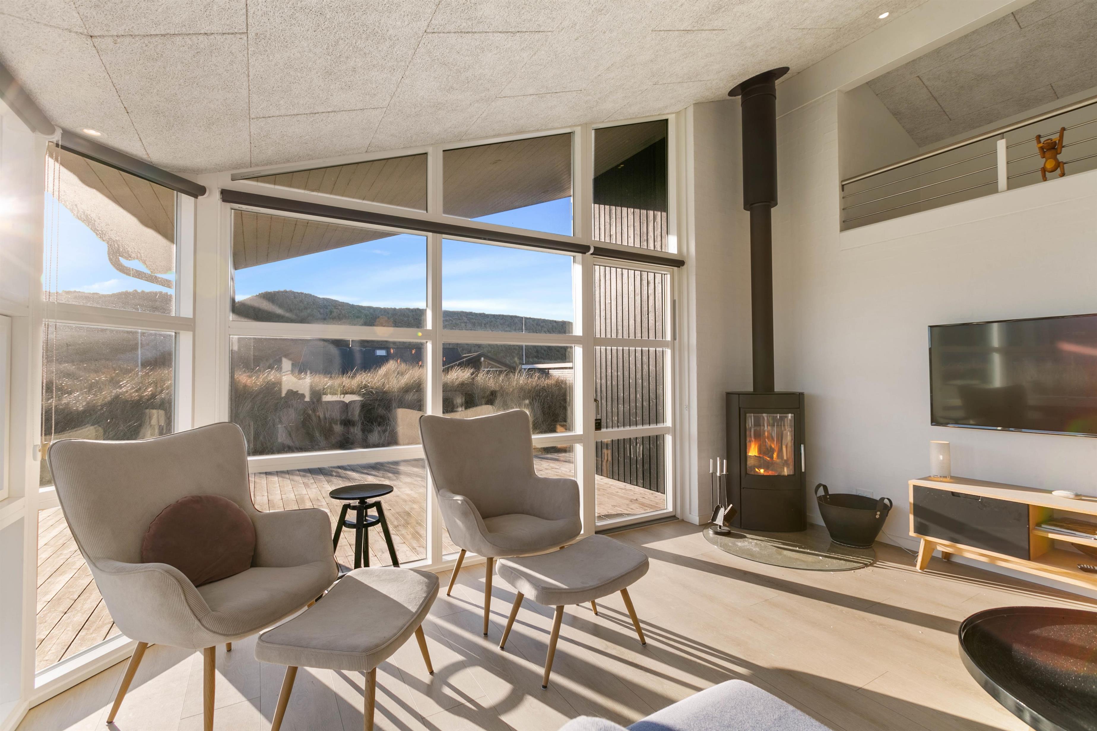 Husets centrum er det store opholdsrum, hvor køkken og stue er slået sammen. Her sørger store vinduesfronter for at åbne op og invitere solens lys såvel som de naturskønne omgivelser indenfor. Den klassiske brændeovn er selvfølgelig på plads, så I får en god varme hele året rundt.