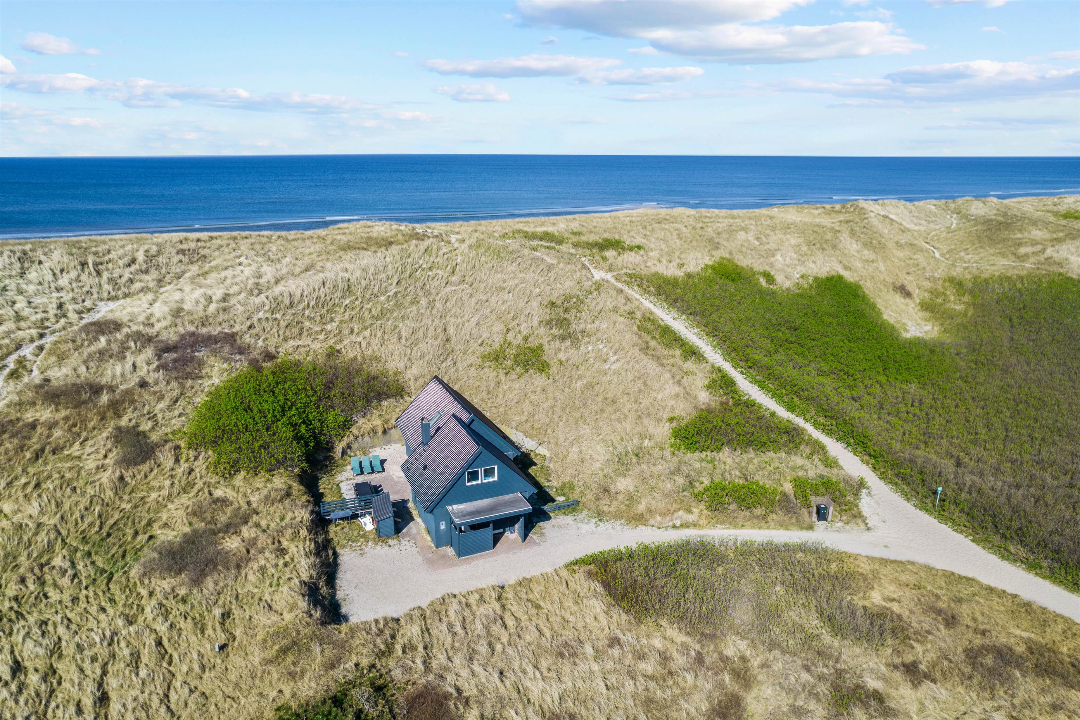 Dette skønne sommerhus ligger direkte i klitterne og kun 50 meter fra Vesterhavet - en helt enestående beliggenhed. Fra den smukke naturgrund er der ikke langt til den vidunderlige sandstrand, hvor I kan gå lange ture med hundene eller bygge store sandslotte med børnene.