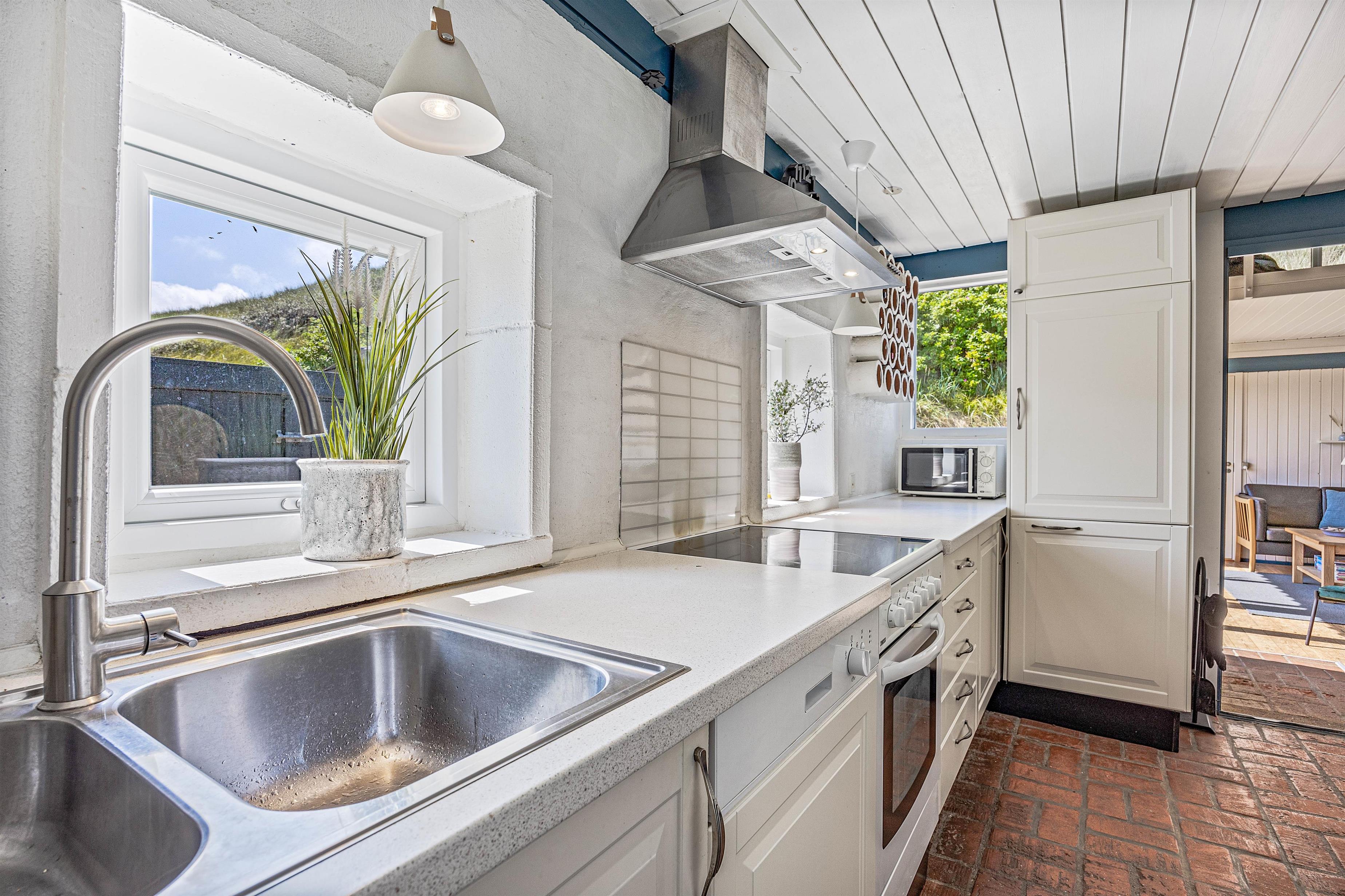 I dette sommerhus er der lagt stor vægt på at skabe en hyggelig og venlig atmosfære. Fra opholdsrummet i stueetagen har du en smuk udsigt over klitterne genne de store panoramavinduer, som du kan nyde med den knitrende pejs i baggrunden. Derudover er der en rummelig spiseplads og det åbne køkken, hvor I kan tilberede en lækker frokost sammen.