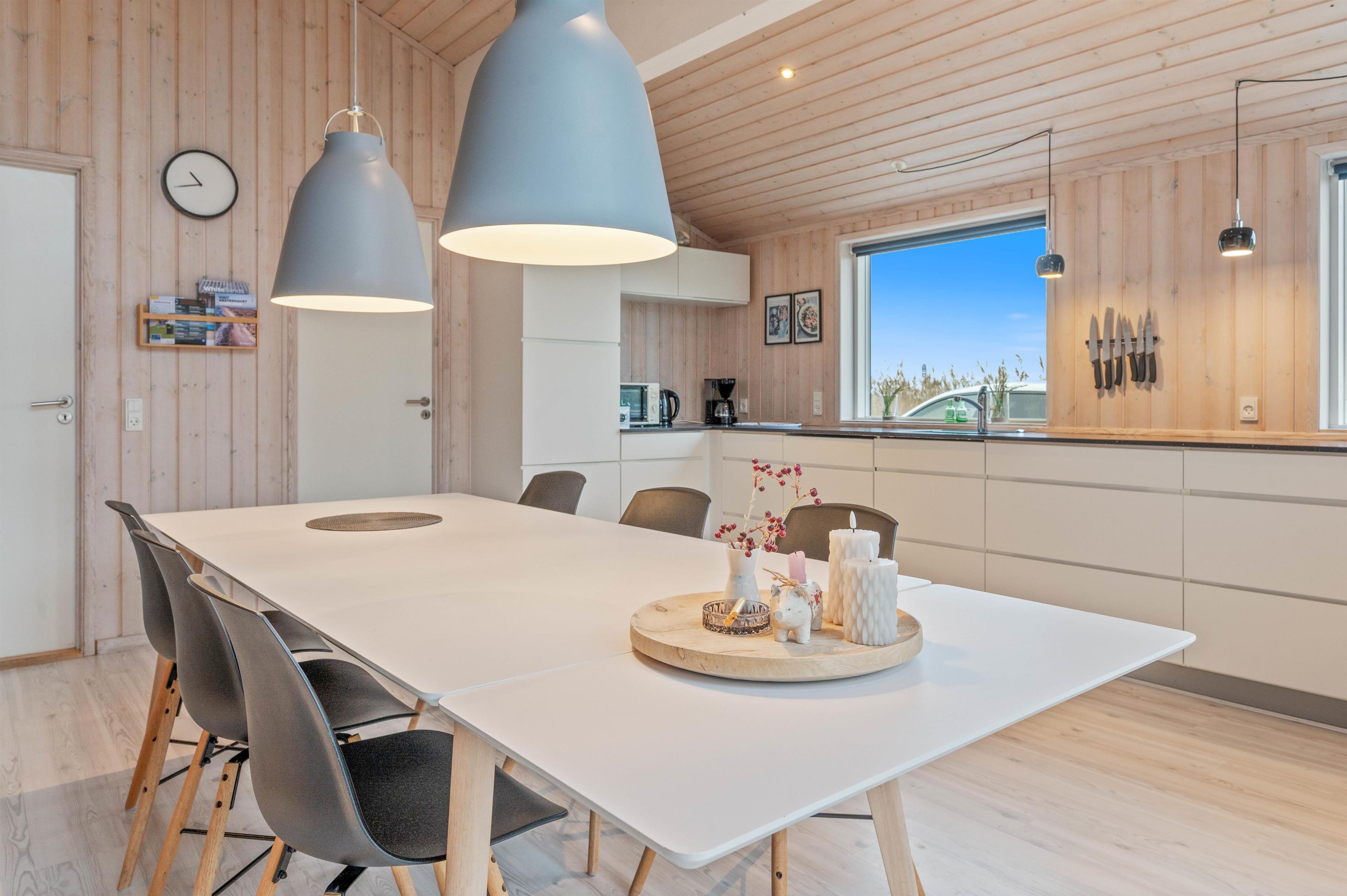 Køkkenet er flot og praktisk indrettet med bl.a. stor fryser (80l), opvaskemaskine og mikroovn. Spiseafdelingen ligger i umiddelbar forlængelse af køkkenet, hvorfra der også er adgang til den store stue. Her kan man, især på de lidt køligere dage, nyde en god bog foran den knitrende ild i brændeovnen.