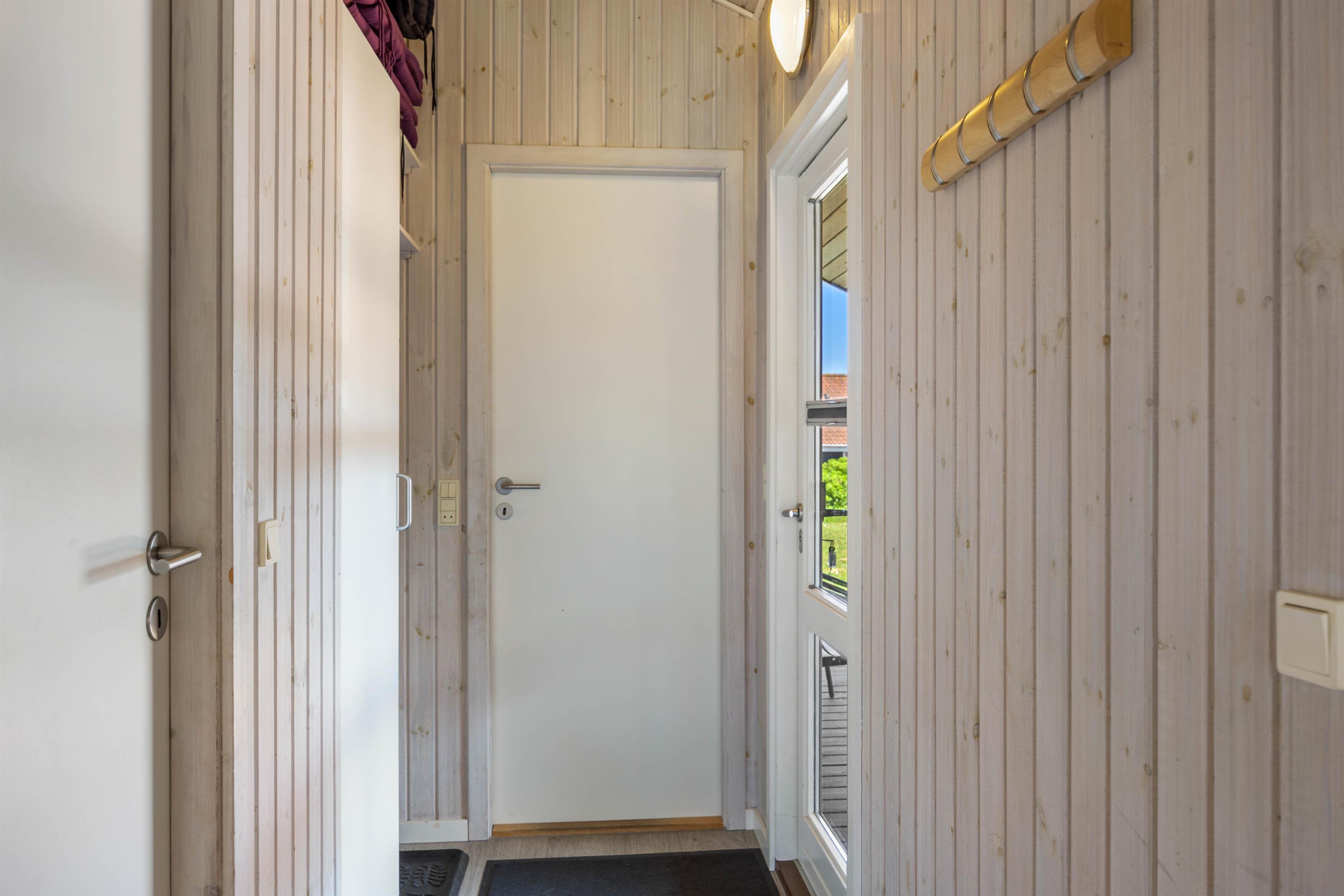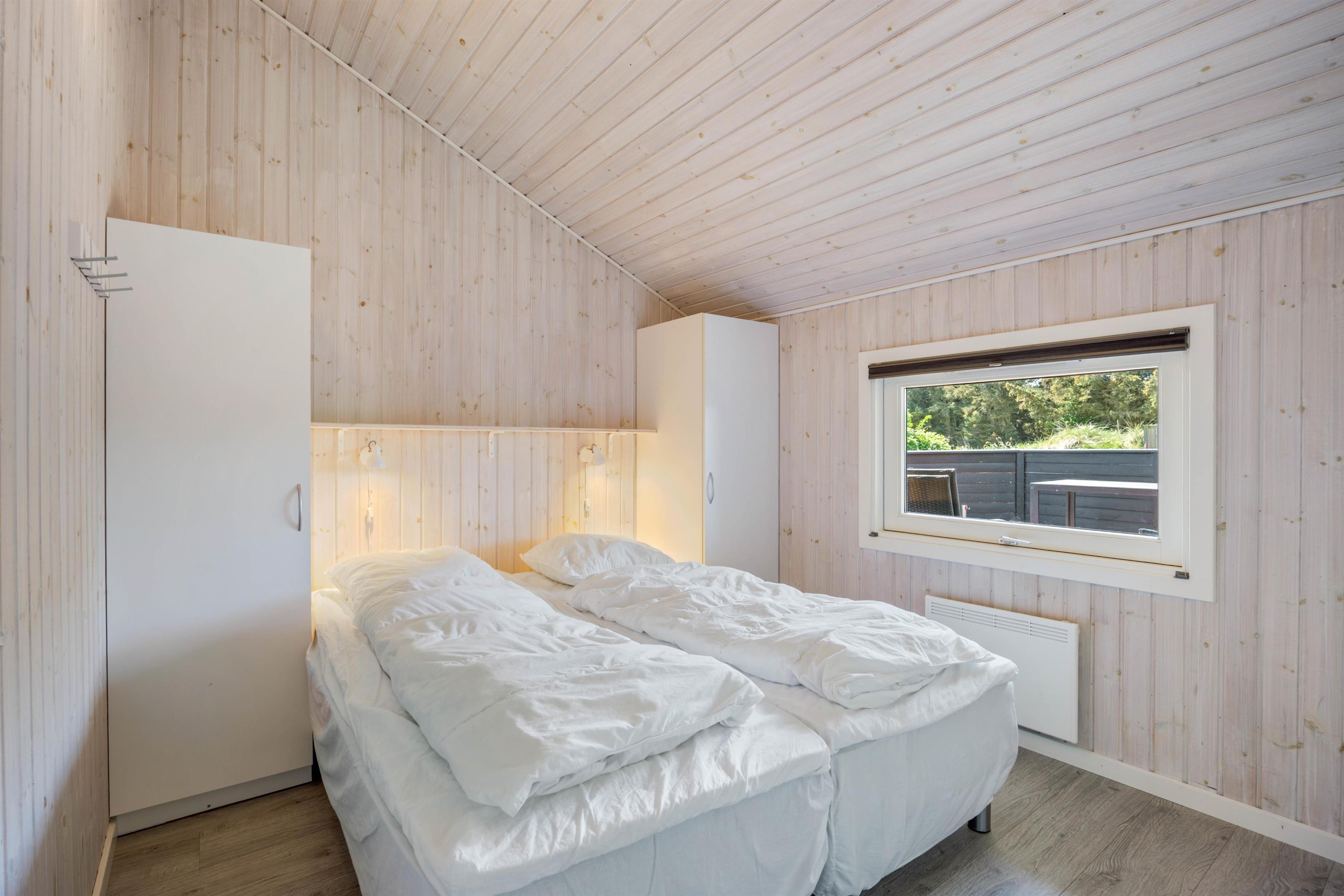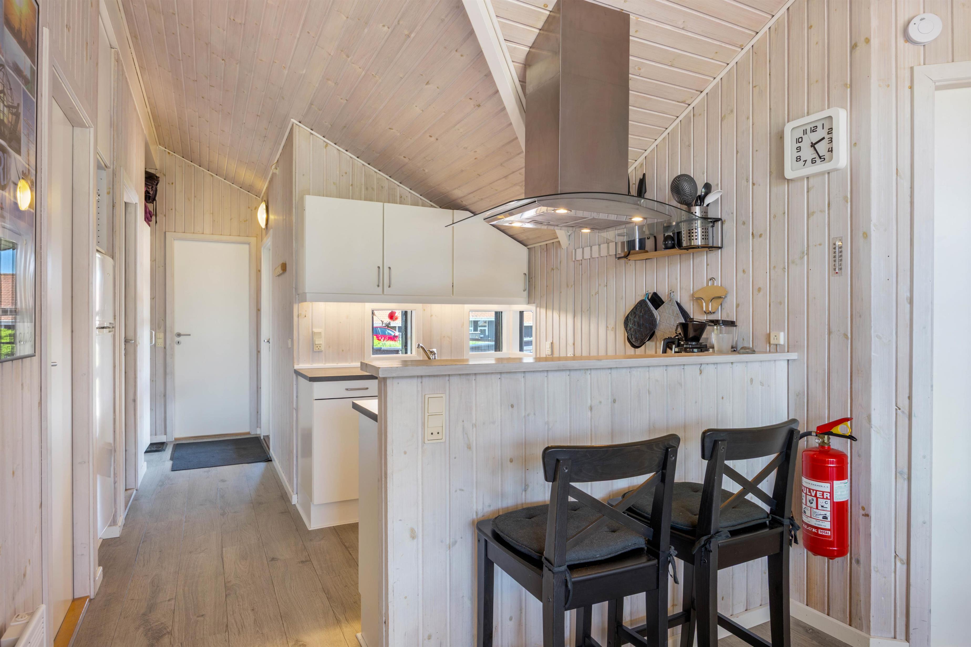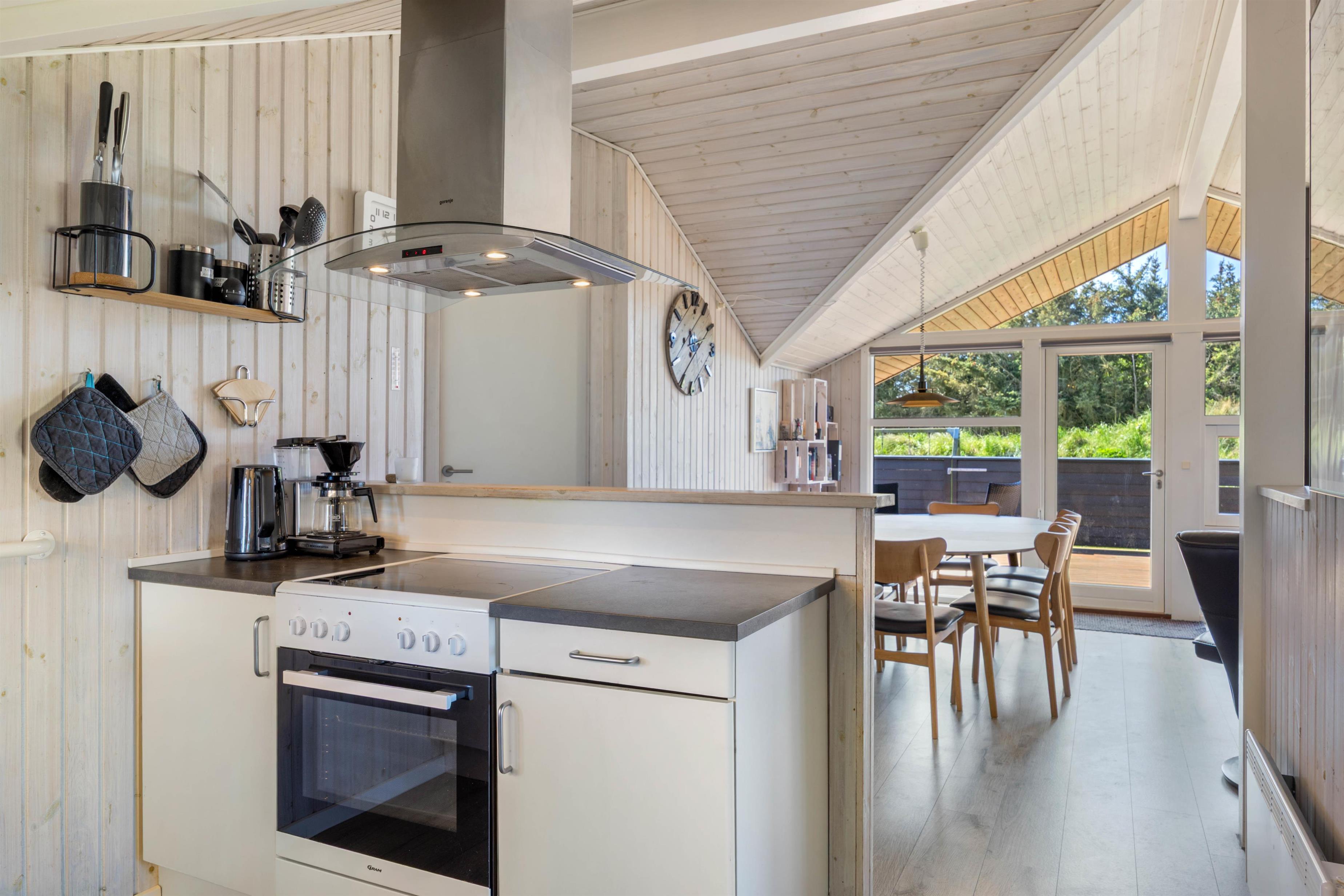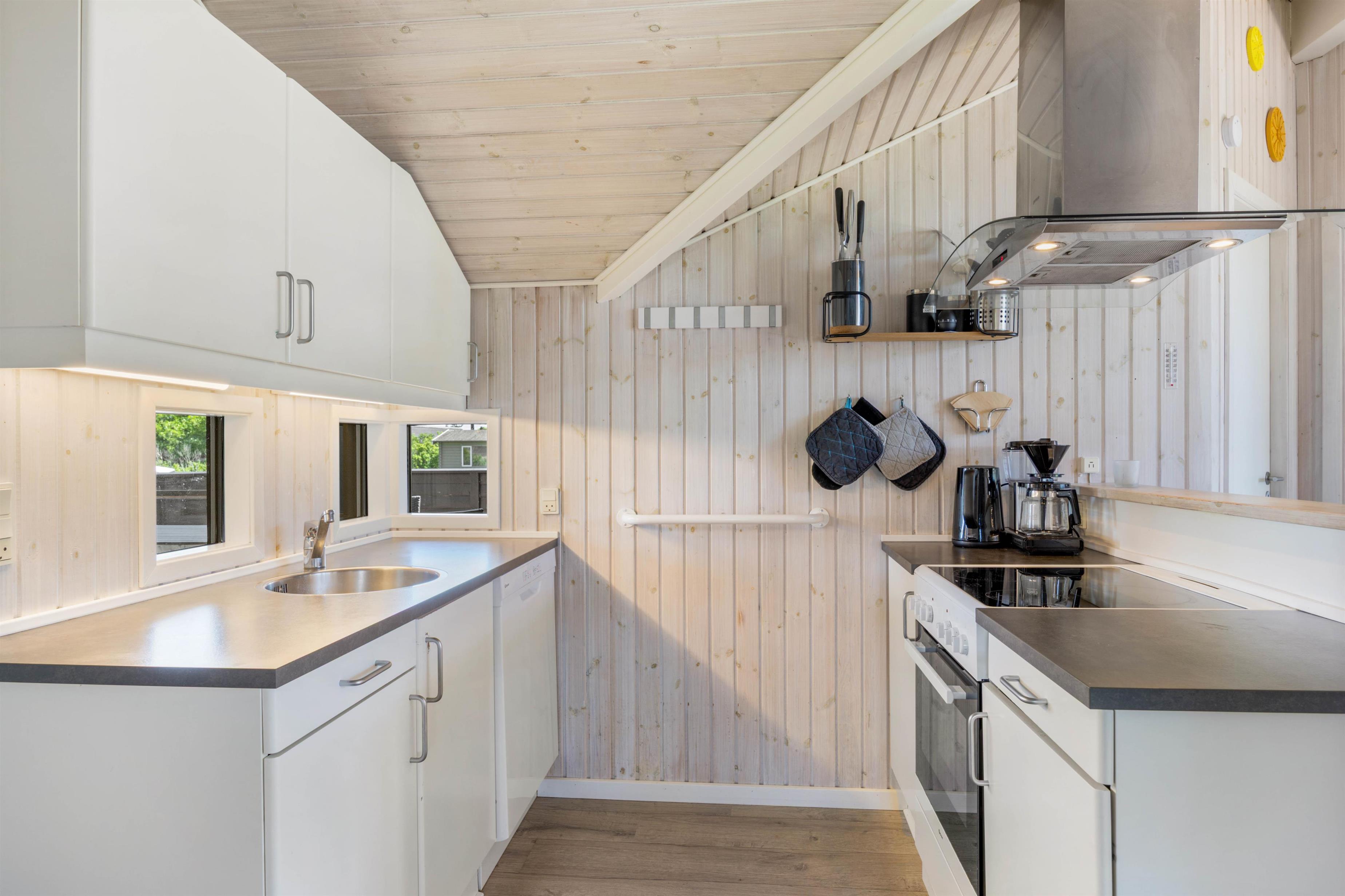 Indenfor i feriehuset er der højt til loftet. Det skaber masser af rummelighed i indretningen og en god og imødekommende stemning. De store vinduer, som er placeret i stueområdet lukker en masse lys ind i stuen og giver samtidig en rigtig dejlig udsigt til udeområdet. Tænd op i brændeovnen, og nyd de mørke aftentimer i stuen, mens varmen breder sig i rummet.