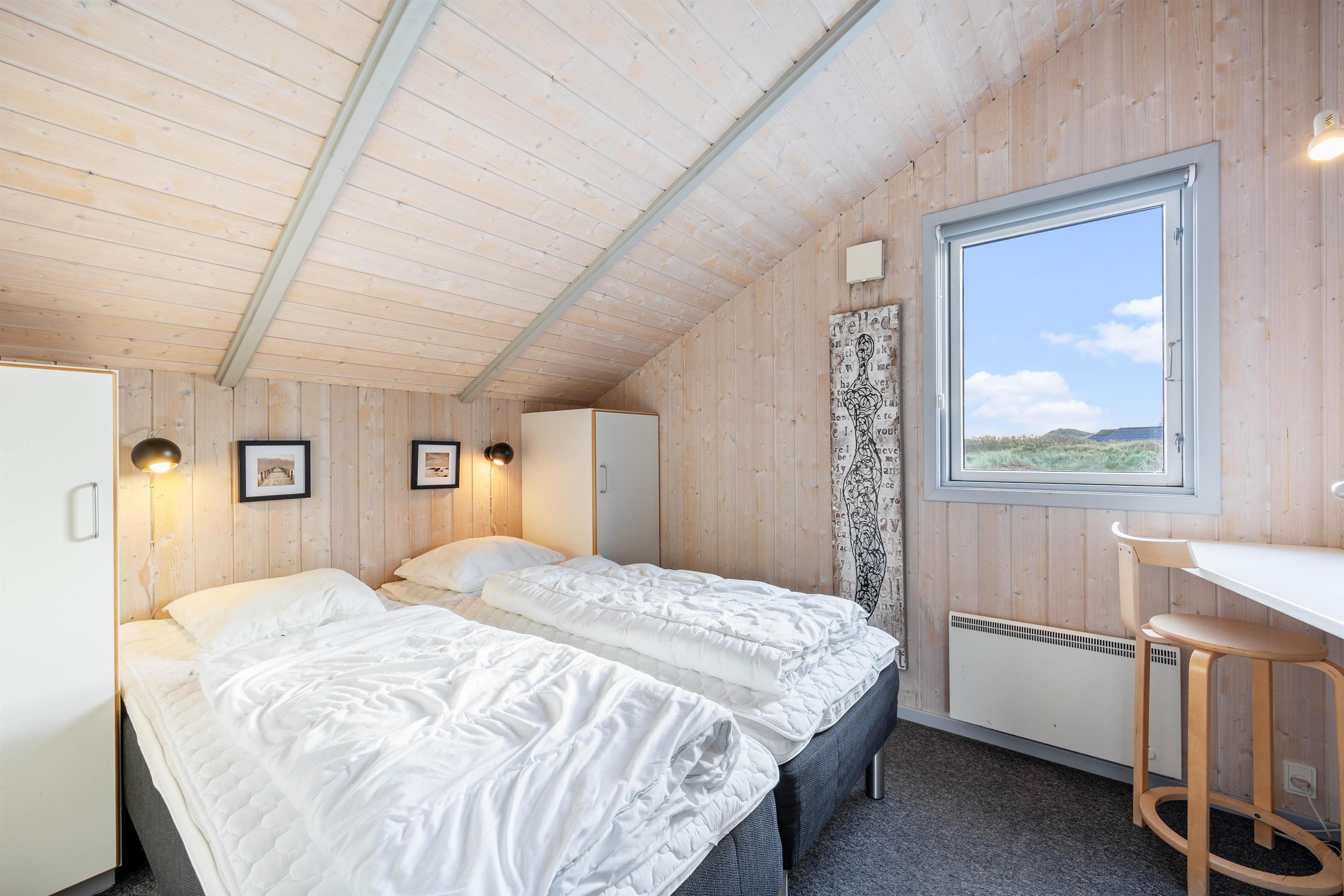 Der er 4 soveværelser i huset. 3 af værelserne er med dobbeltseng, og på det sidste værelse er der 2 enkeltsenge. Der er 2 badeværelser gulvvarme og bruseniche. På det store badeværelse er der endvidere en hjørnespa til 2 personer, en vaskemaskine og en sauna. Køkkenet er bl.a. udstyret med en opvaskemaskine og en mikroovn. Stuen er placeret midt i huset, og har store vinduespartier ud mod det smukke klitlandskab mod sydvest. Her er der en brændeovn, et fladskærms-TV, DVD-afspiller, radio m/CD-afspiller og gratis trådløst internet. Det er tilladt at medbringe 2 hunde.