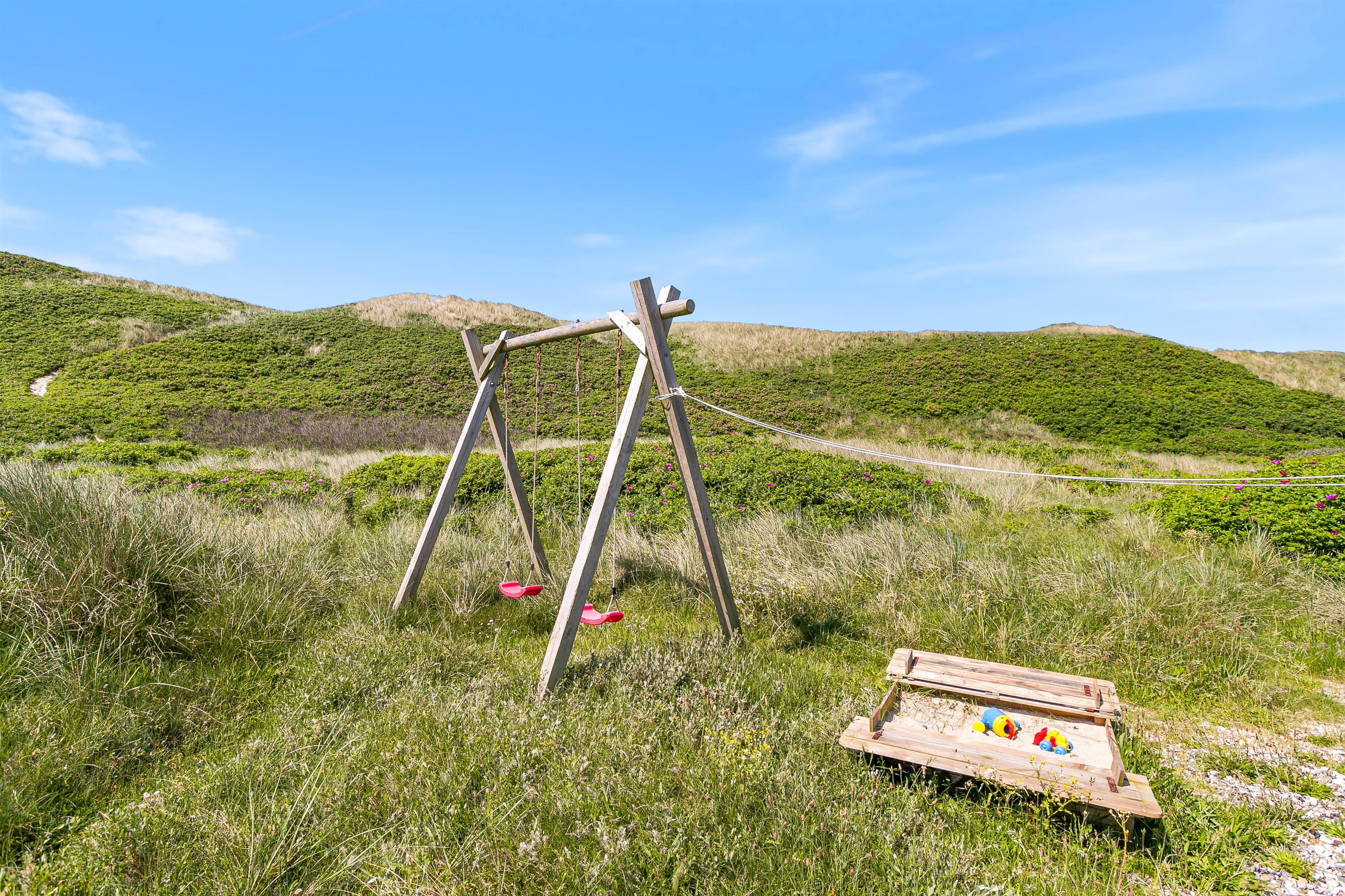 Den store terrasse mod sydvest er både delvist overdækket, delvis afskærmet, og delvist lukket, og kan således bruges meget af dagen. Den lidt mindre terrasse mod sydøst, ved husets indgang, er delvist afskærmet og derfor anvendelig til morgenkaffe på dage med godt vejr. Det smukke klitlandskab er en del af naturgrunden, så man får følelsen af at være et med naturen, når man bor i dette hus. Vesterhavet høres tydeligt fra terrasserne, og der er markerede stier til, når man ønsker at gå til havet.