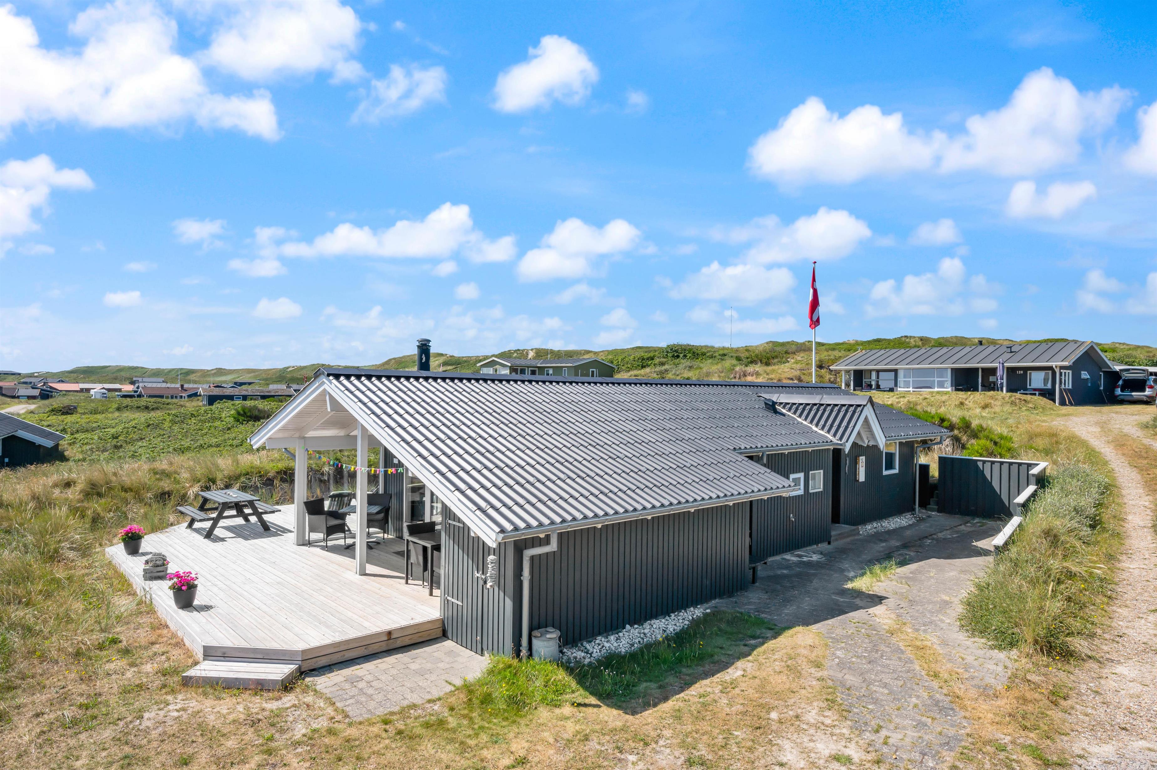 Sommerhuset ligger på en af de karakteristiske klitgrunde i feriehusområdet Årgab. Fra husets delvist overdækkede terrasse kan I nyde udsigten over det dejlige område, mens I nyder morgenmaden i det fri på terrassen i sommerhusets fine havemøbler.