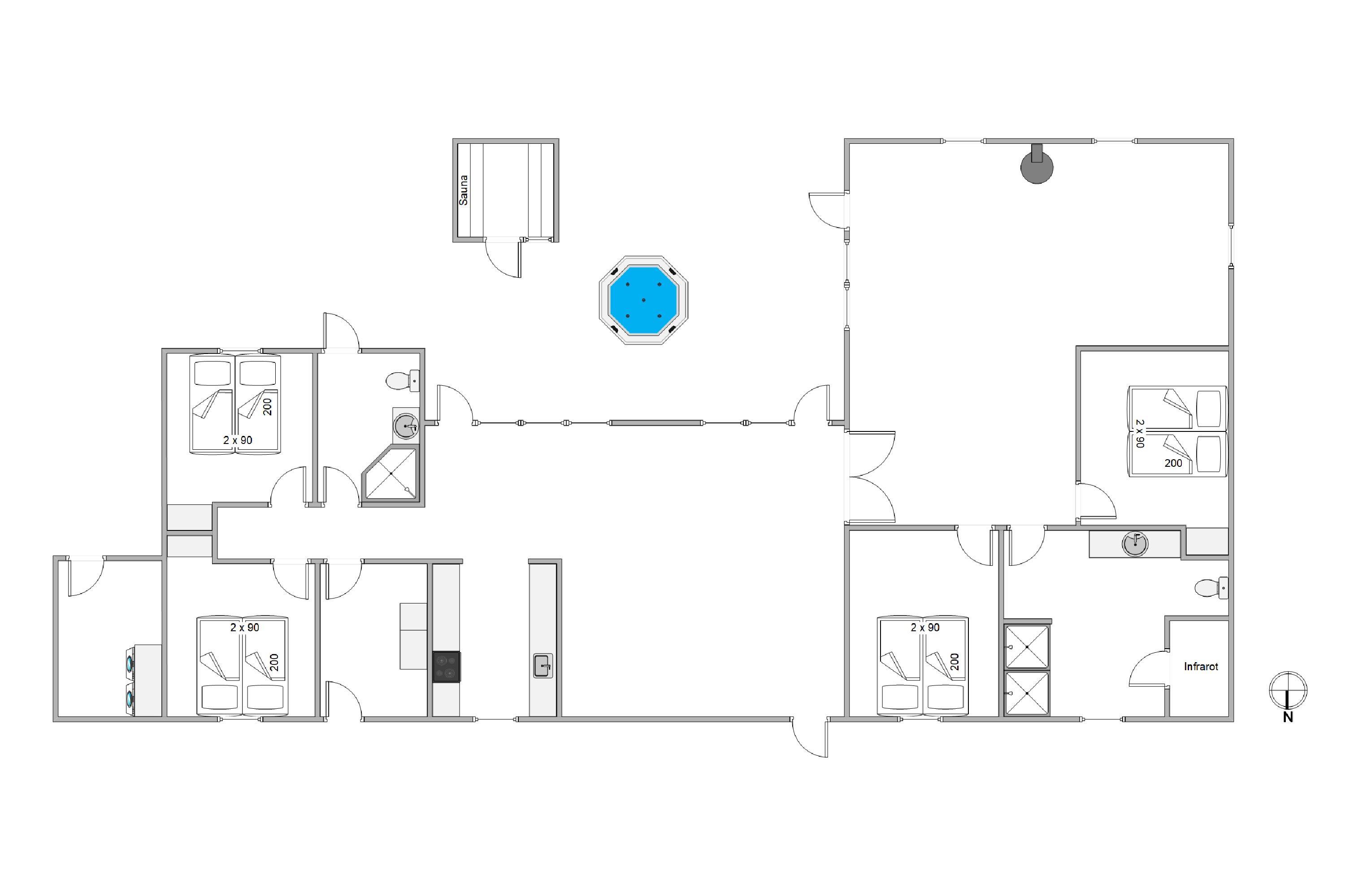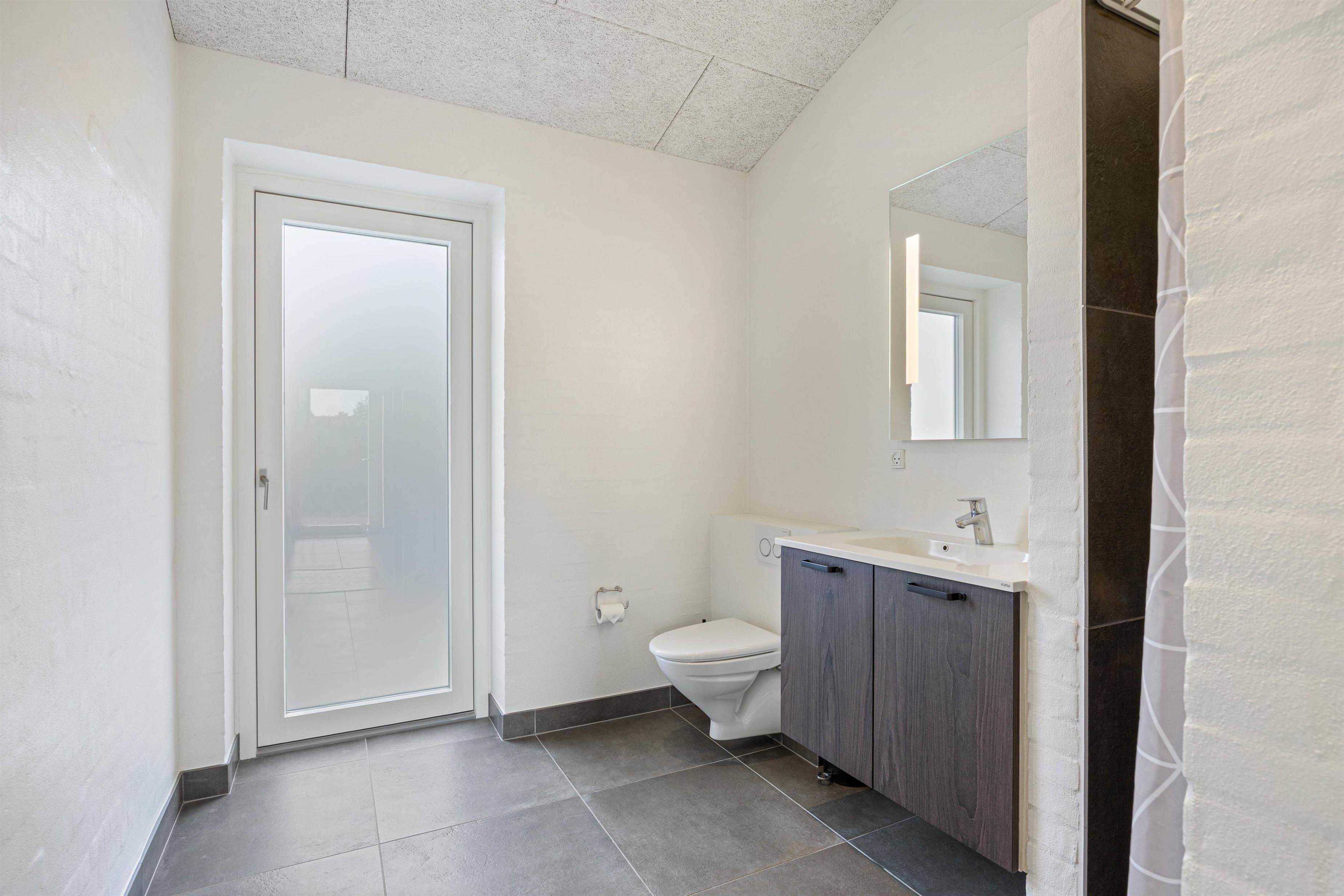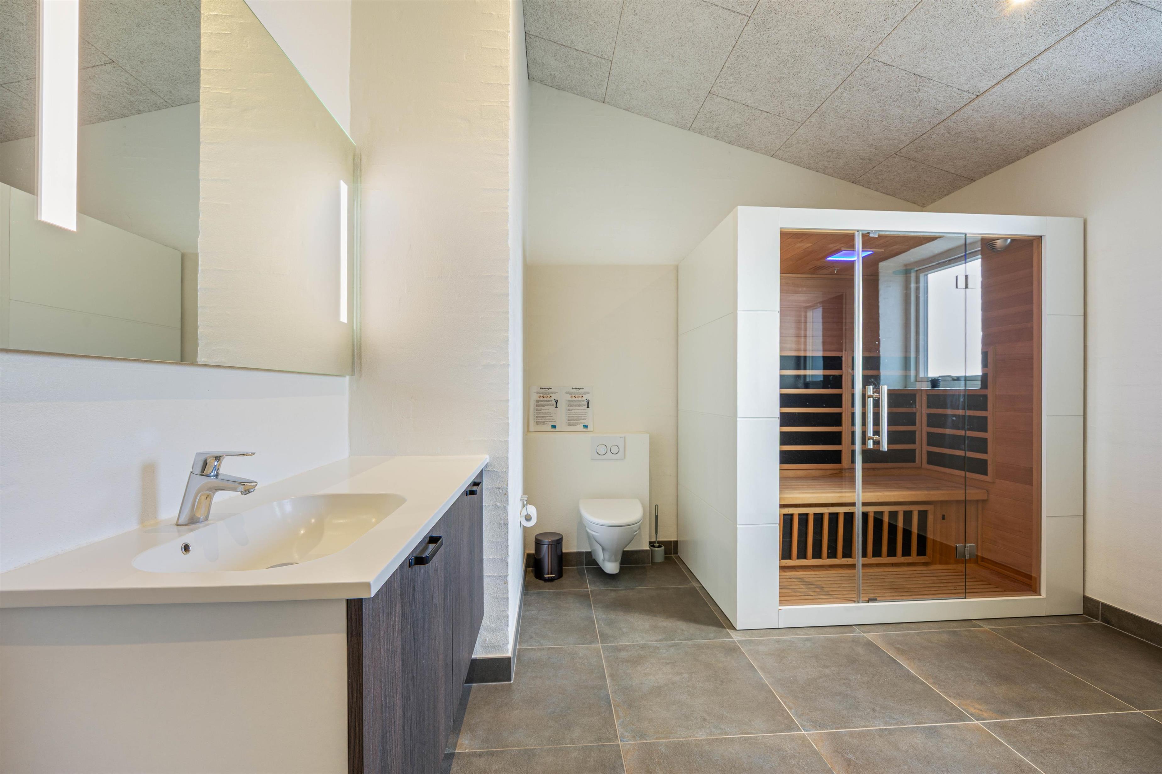 De 2 badeværelser er flotte og praktisk indrettede i hver sin side af feriehuset. Det største har, ud over en lækker dobbeltbruser, også infrarød sauna, hvor I kan slappe af efter en lang dag ved stranden.