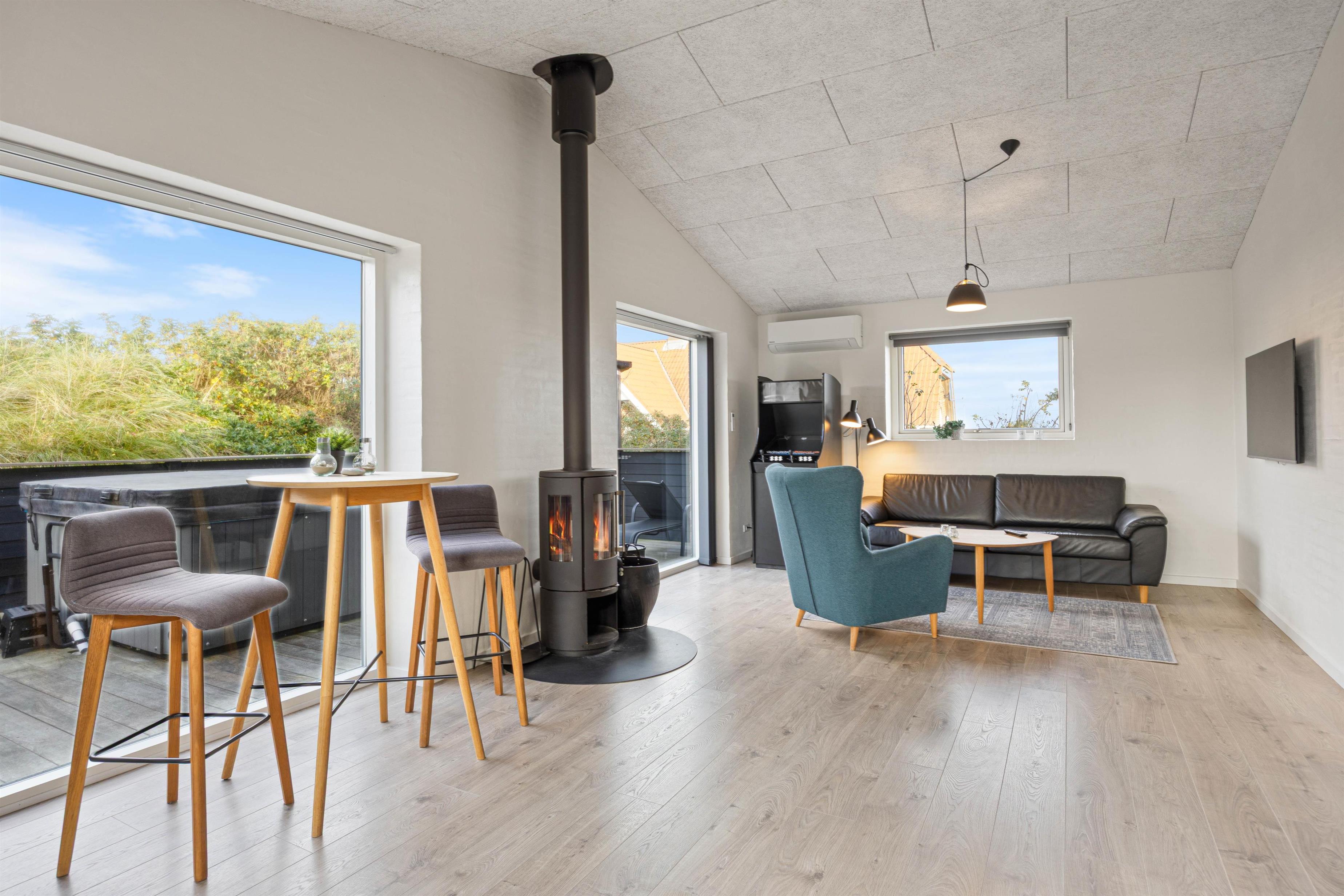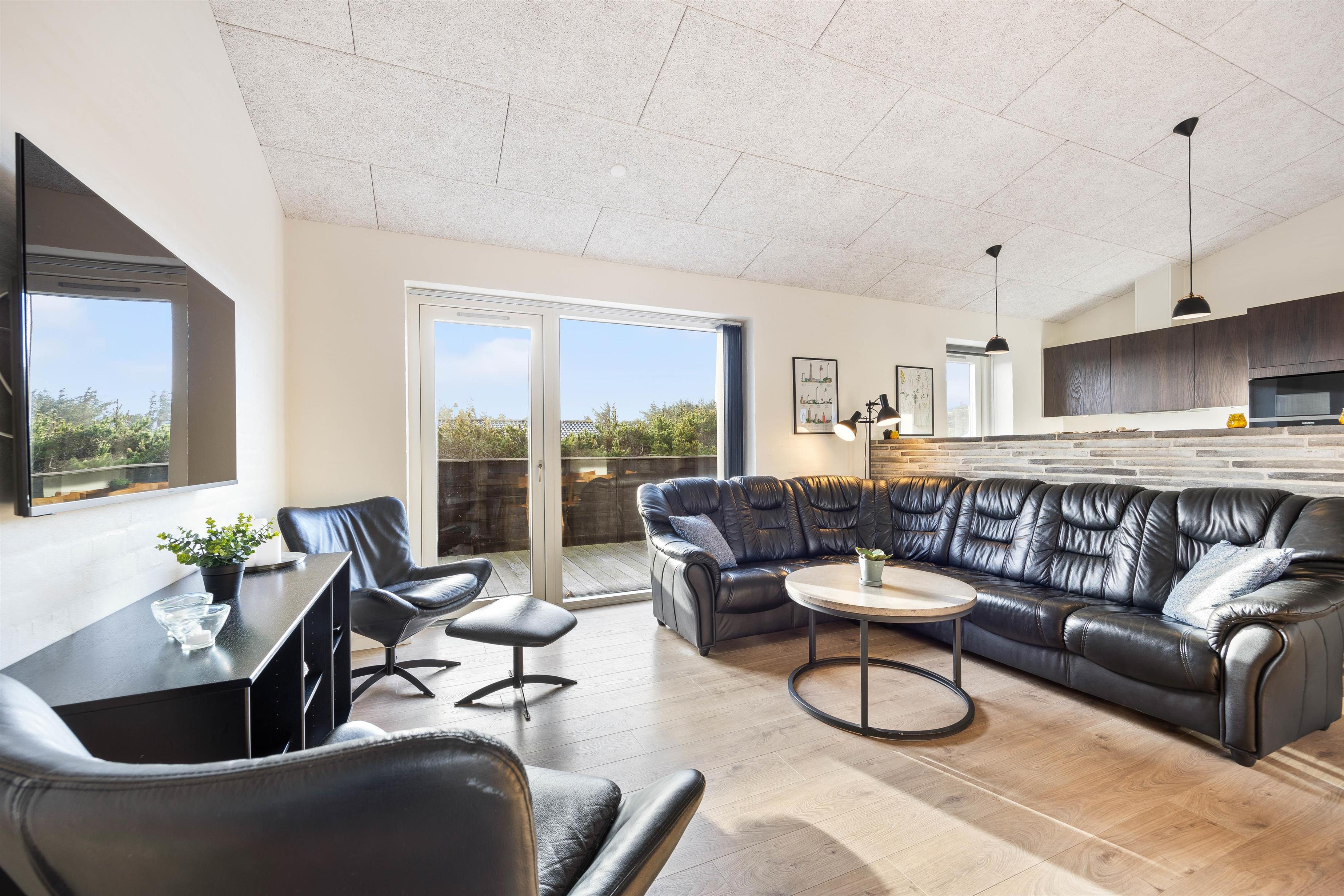 Det flotte opholdsrum med stue, spiseplads og køkken er hjertet i feriehuset, og hvor familien naturligt samles. Igennem de store vinduespartier mod syd har I en flot udsigt ud over sommerhusområdet og det flotte klitlandskab.