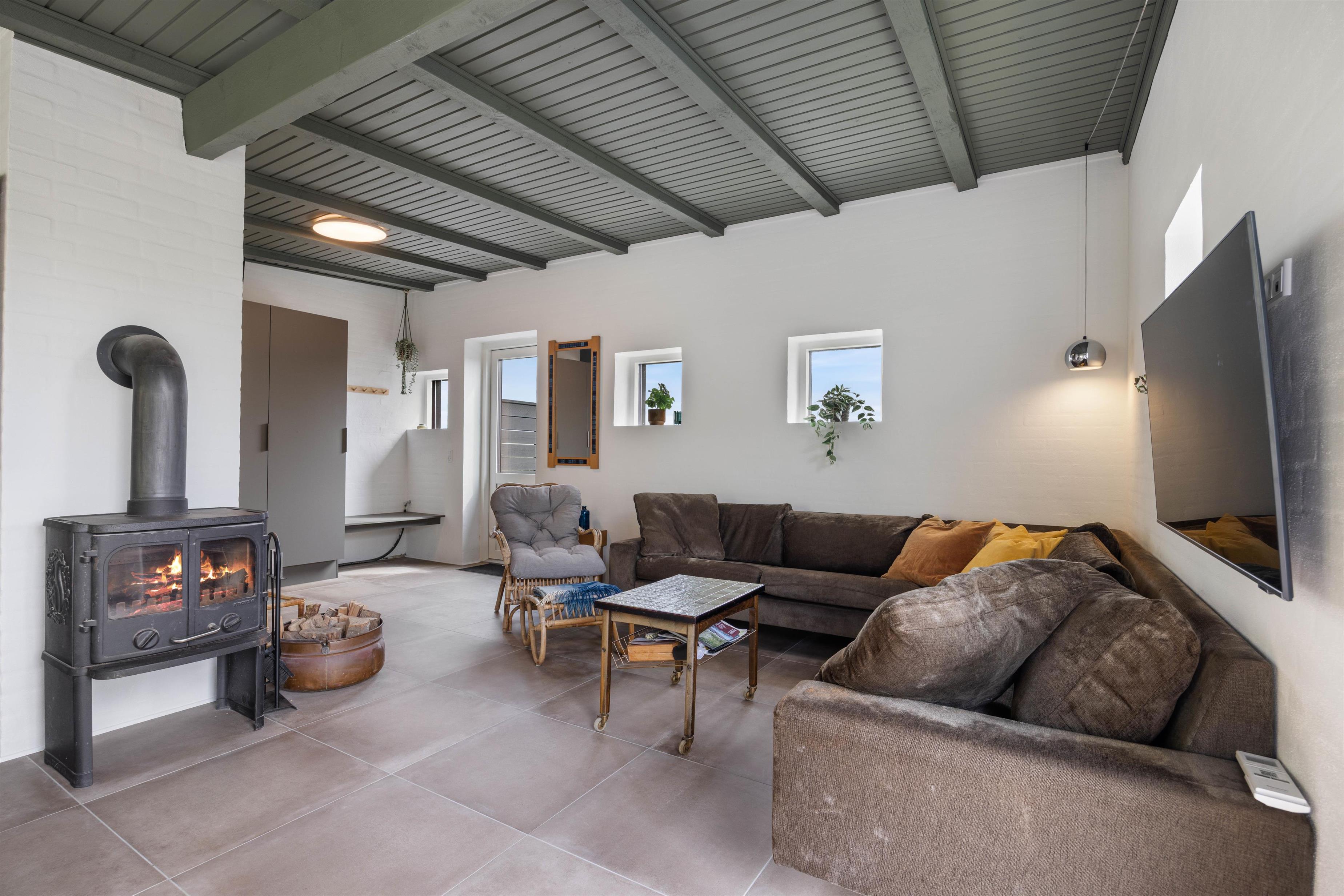 Sommerhusets hjerte er opholdsrummet med stue, spiseafdeling og køkken, der blandt andet er udstyret med opvaskemaskine, integreret emhætte i kogepladen og integreret airfryer i ovnen. Brændeovnen spreder en hyggelig feriestemning og varme på de blæsende og regnfulde dage.