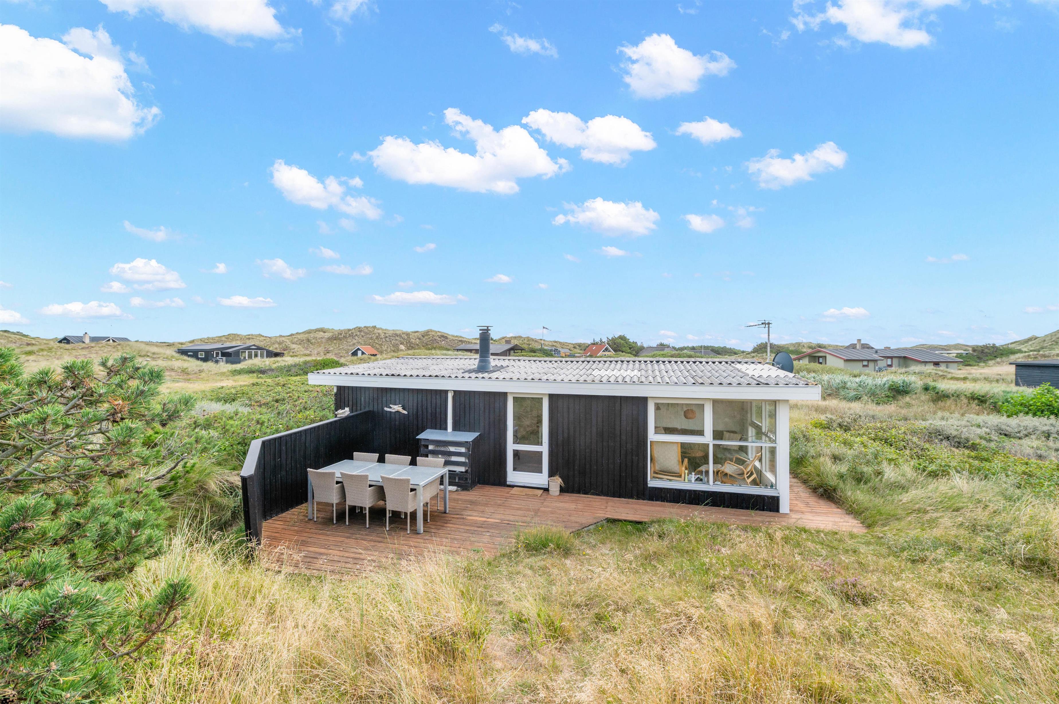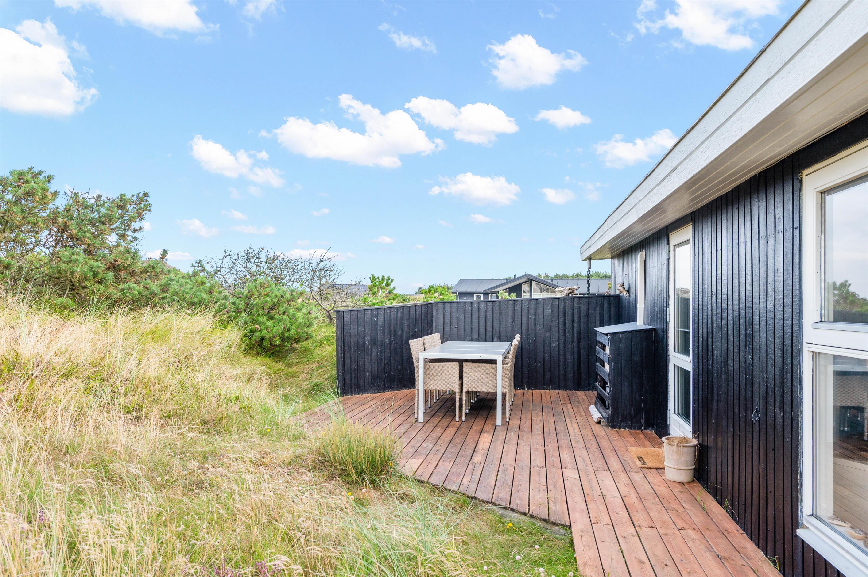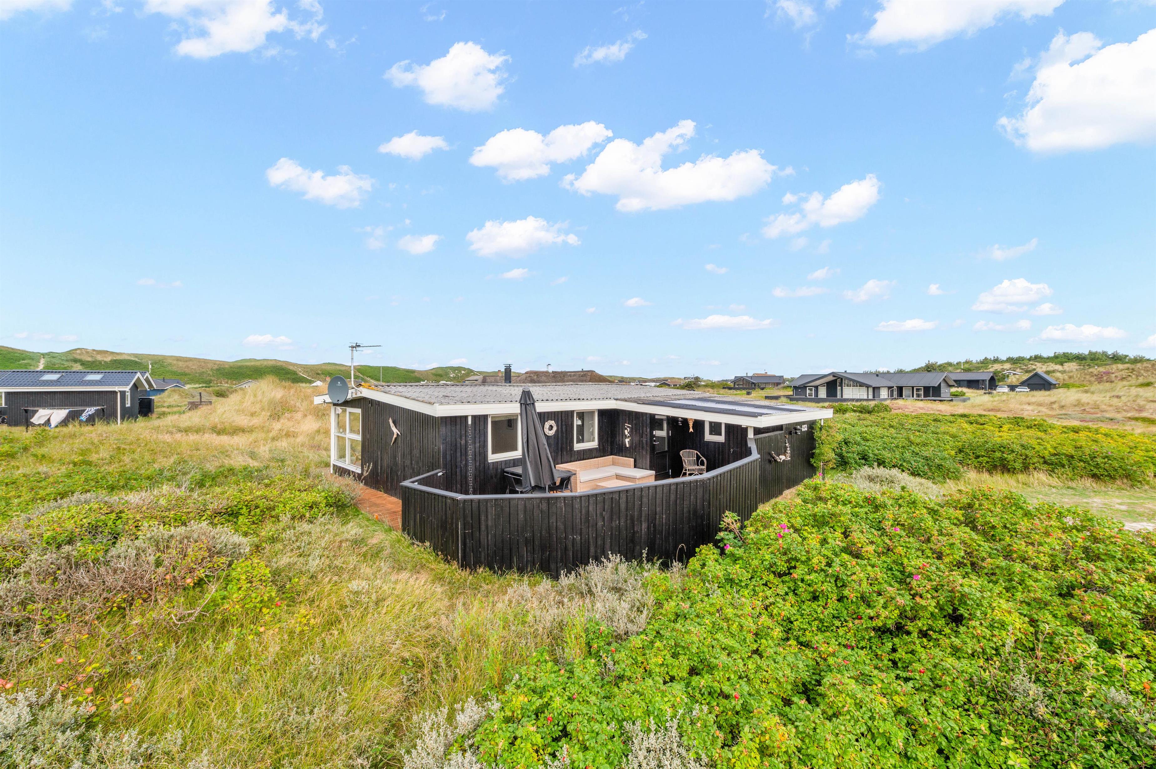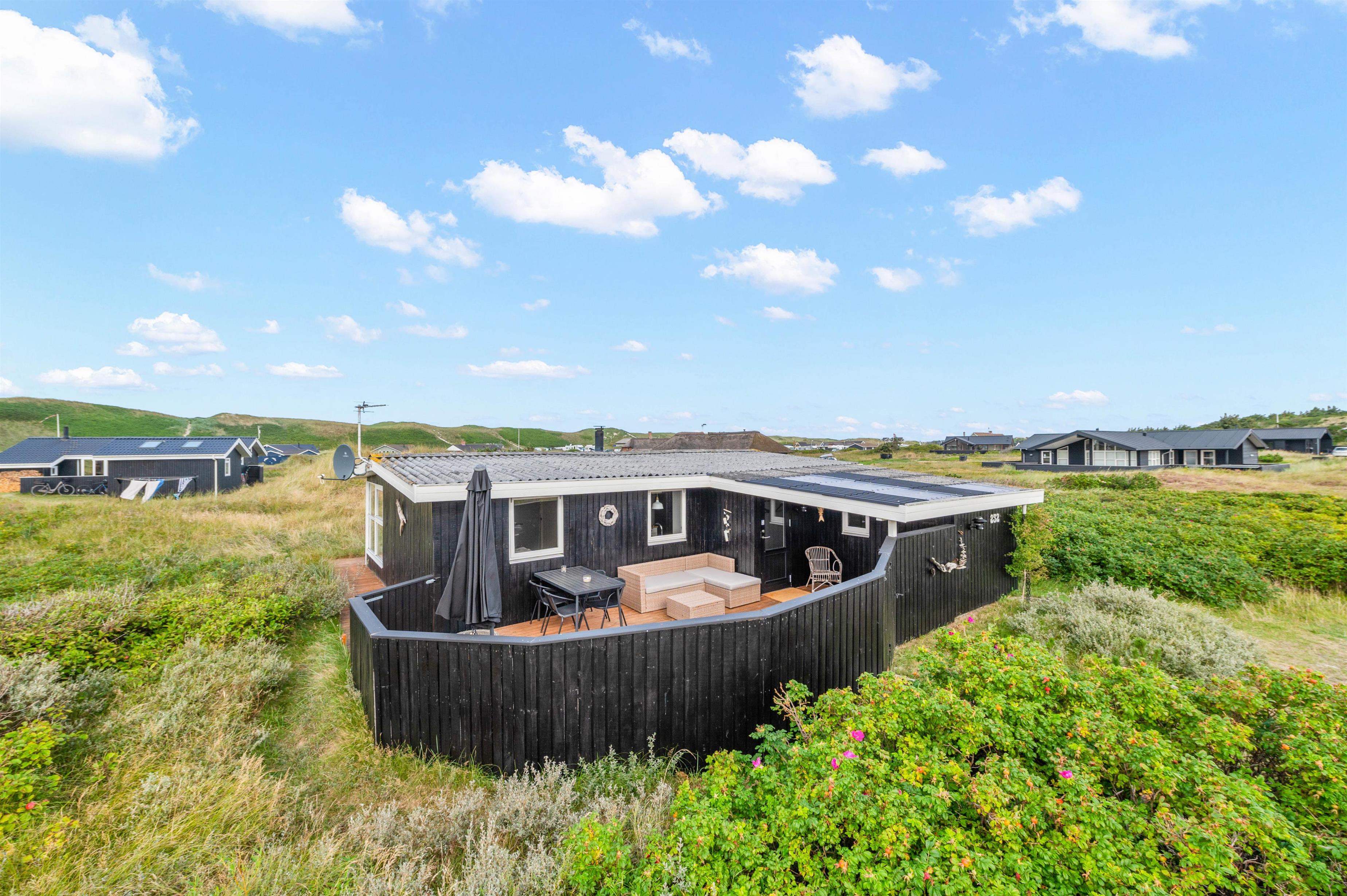 Sommerhuset ligger på en velvoksen naturgrund på 3000 m2. Med kun 250 meter til Vesterhavet vil du her mærke den friske brise og høre havet, når vindretningen er gunstig. Ved sommerhuset er der en stor og afskærmet terrasse med både spiseplads og lækroge. Her kan du finde læ og sol, og endda tørre badetøjet under halvtaget, så det er klar til næste dag.
