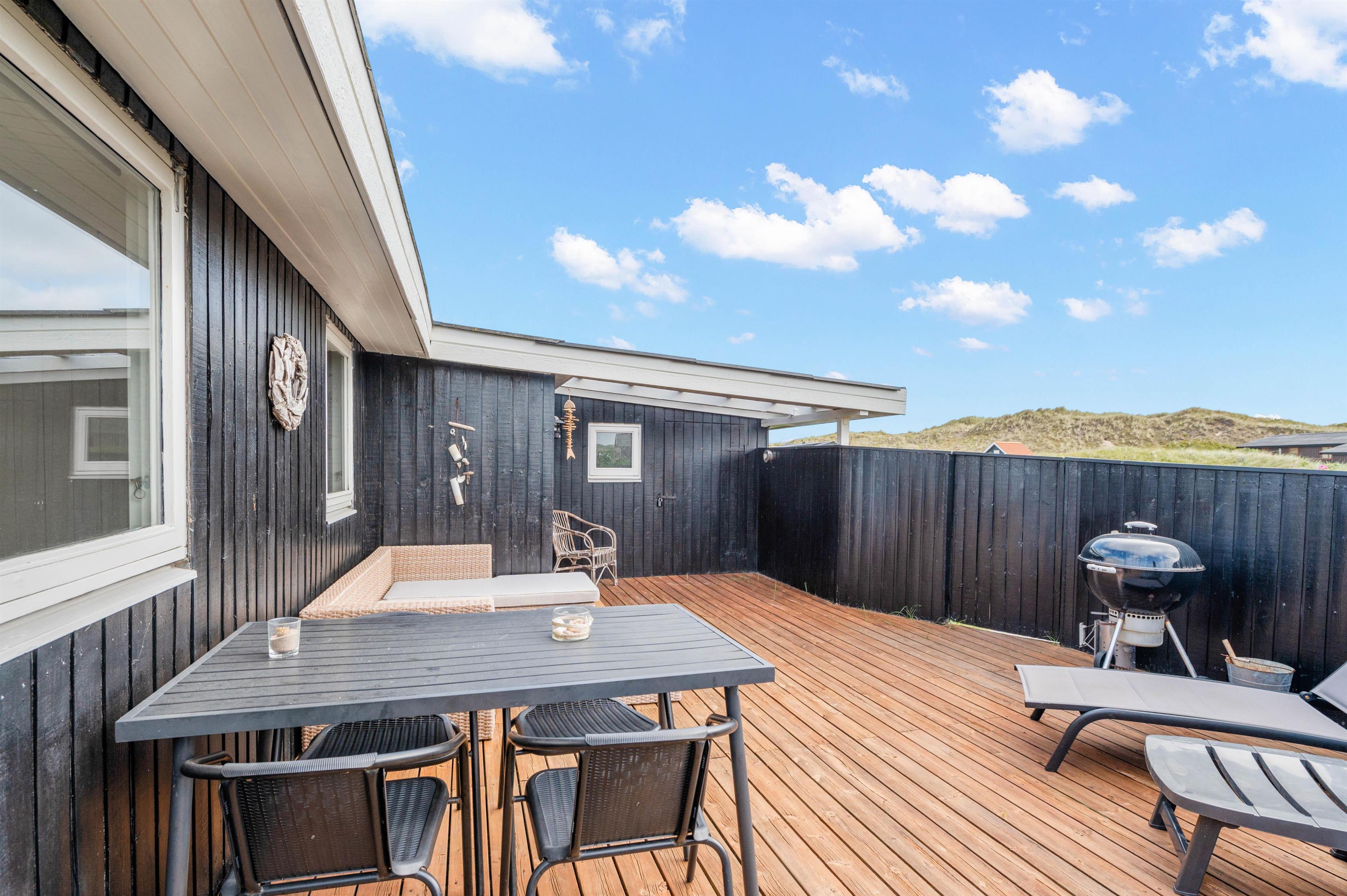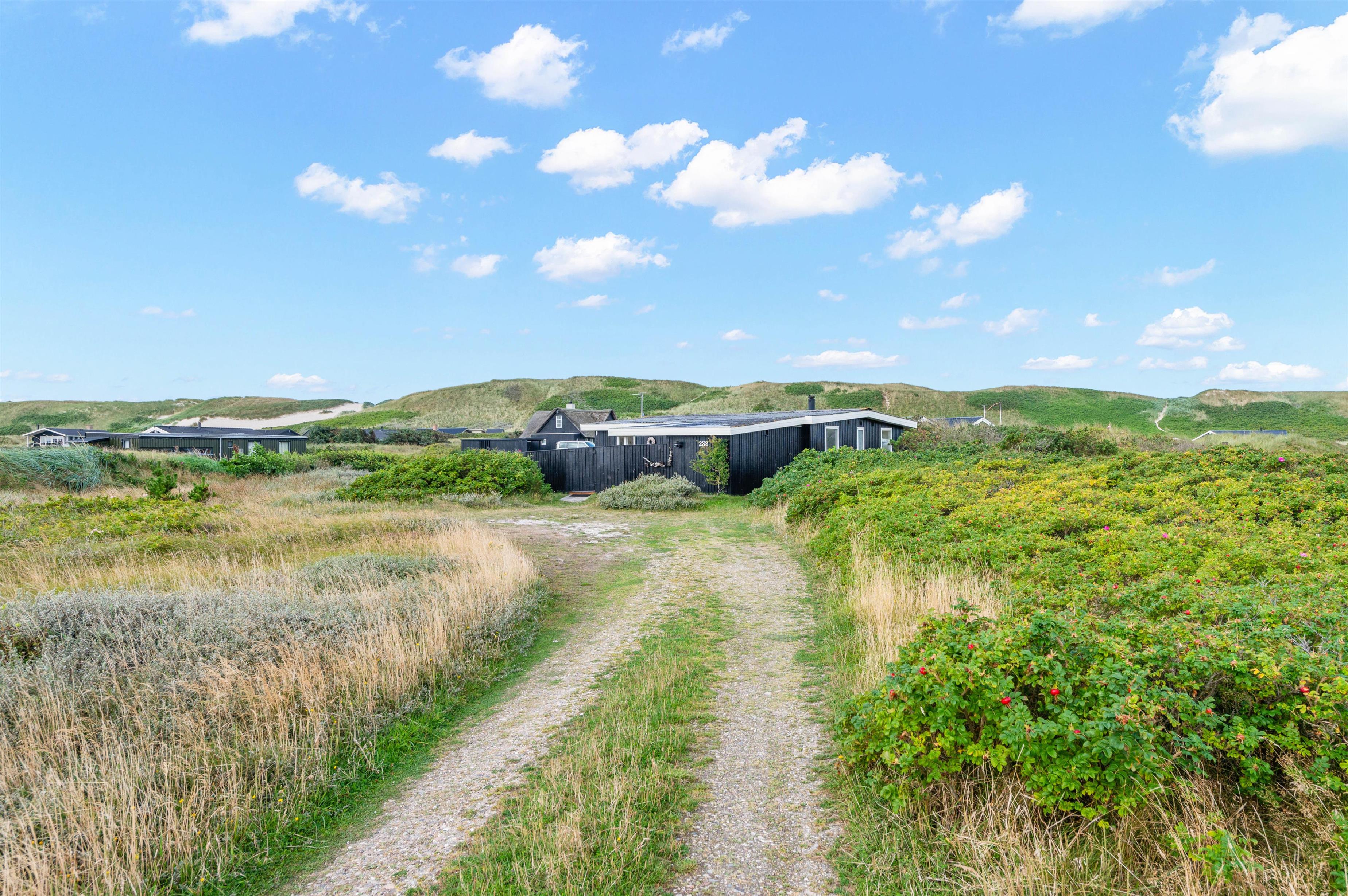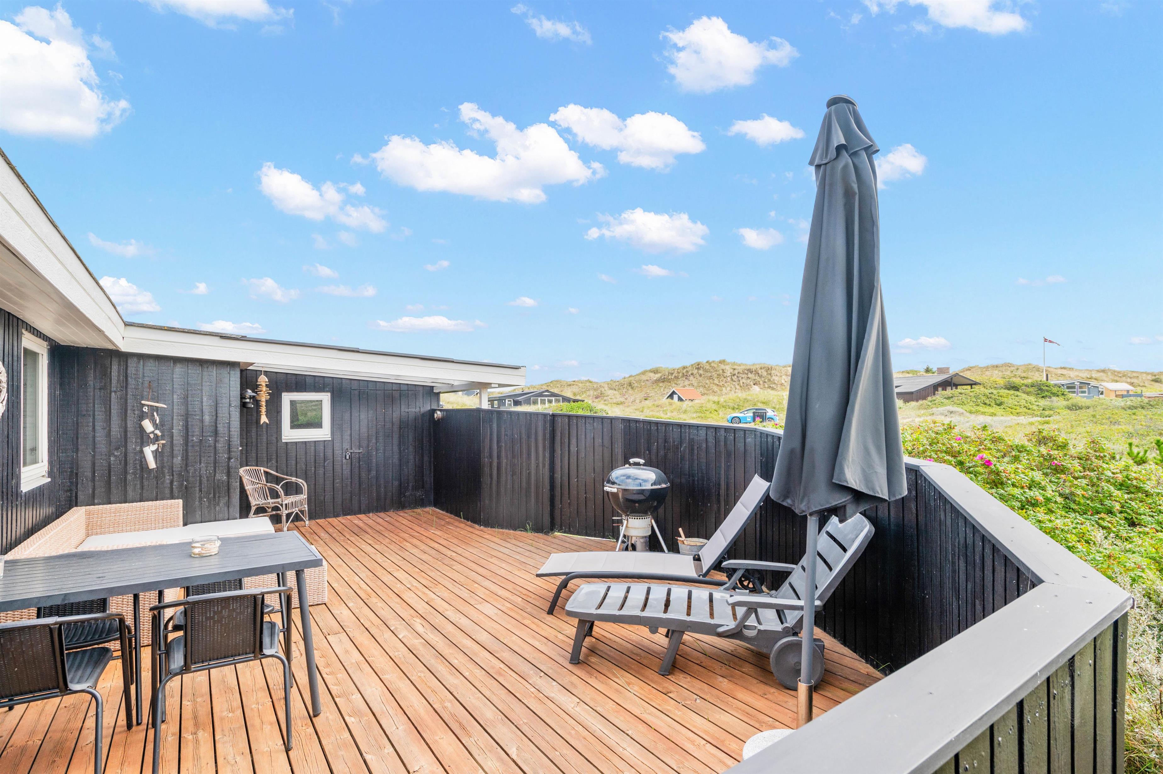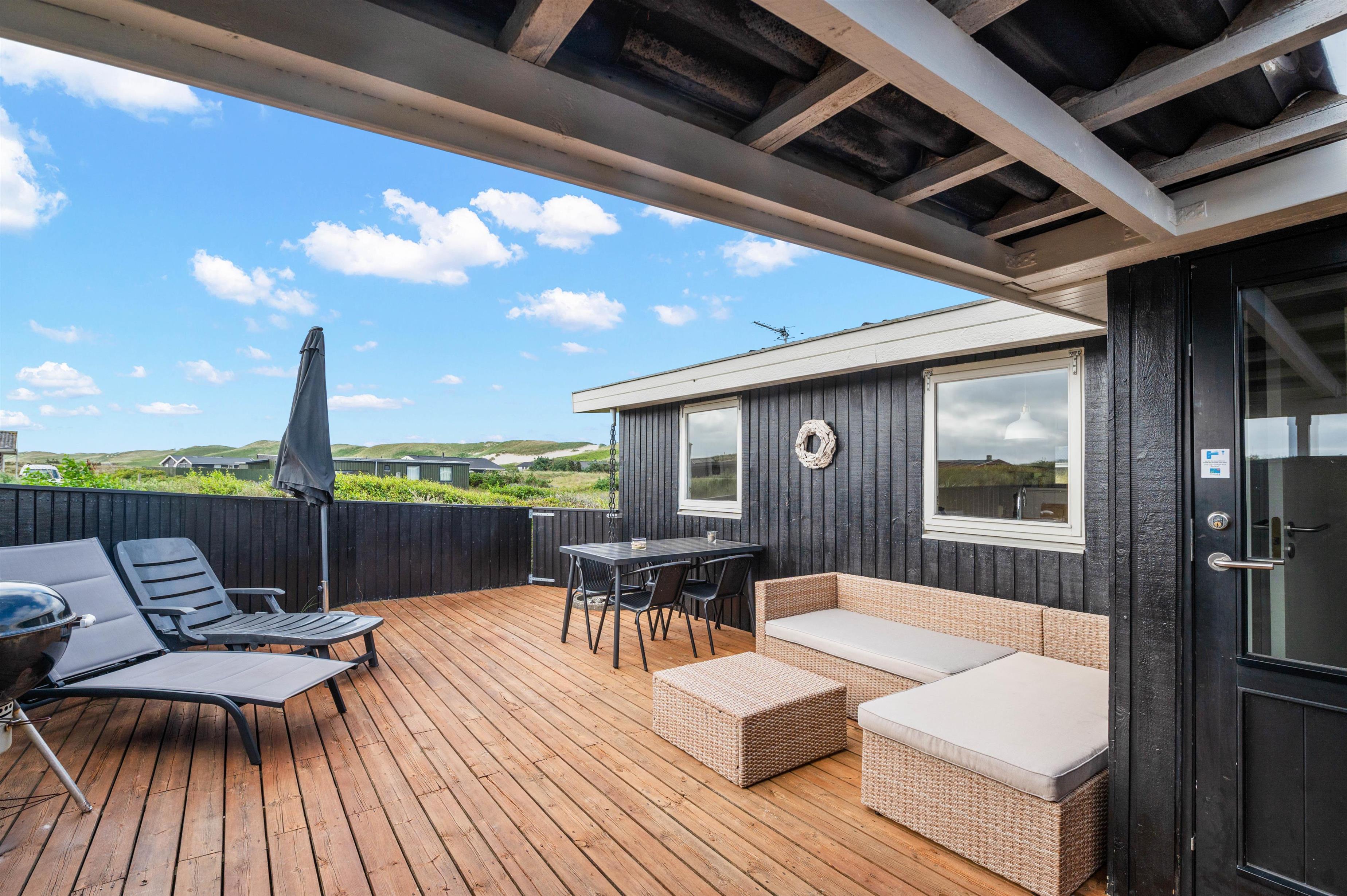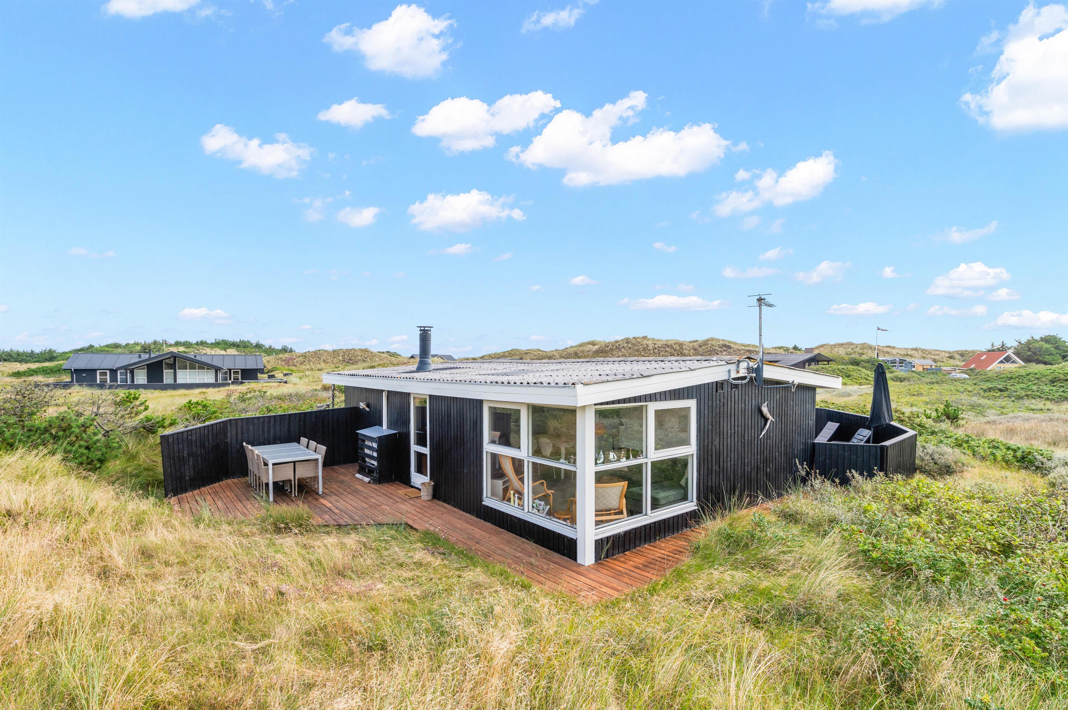 Sommerhuset ligger på en velvoksen naturgrund på 3000 m2. Med kun 250 meter til Vesterhavet vil du her mærke den friske brise og høre havet, når vindretningen er gunstig. Ved sommerhuset er der en stor og afskærmet terrasse med både spiseplads og lækroge. Her kan du finde læ og sol, og endda tørre badetøjet under halvtaget, så det er klar til næste dag.
