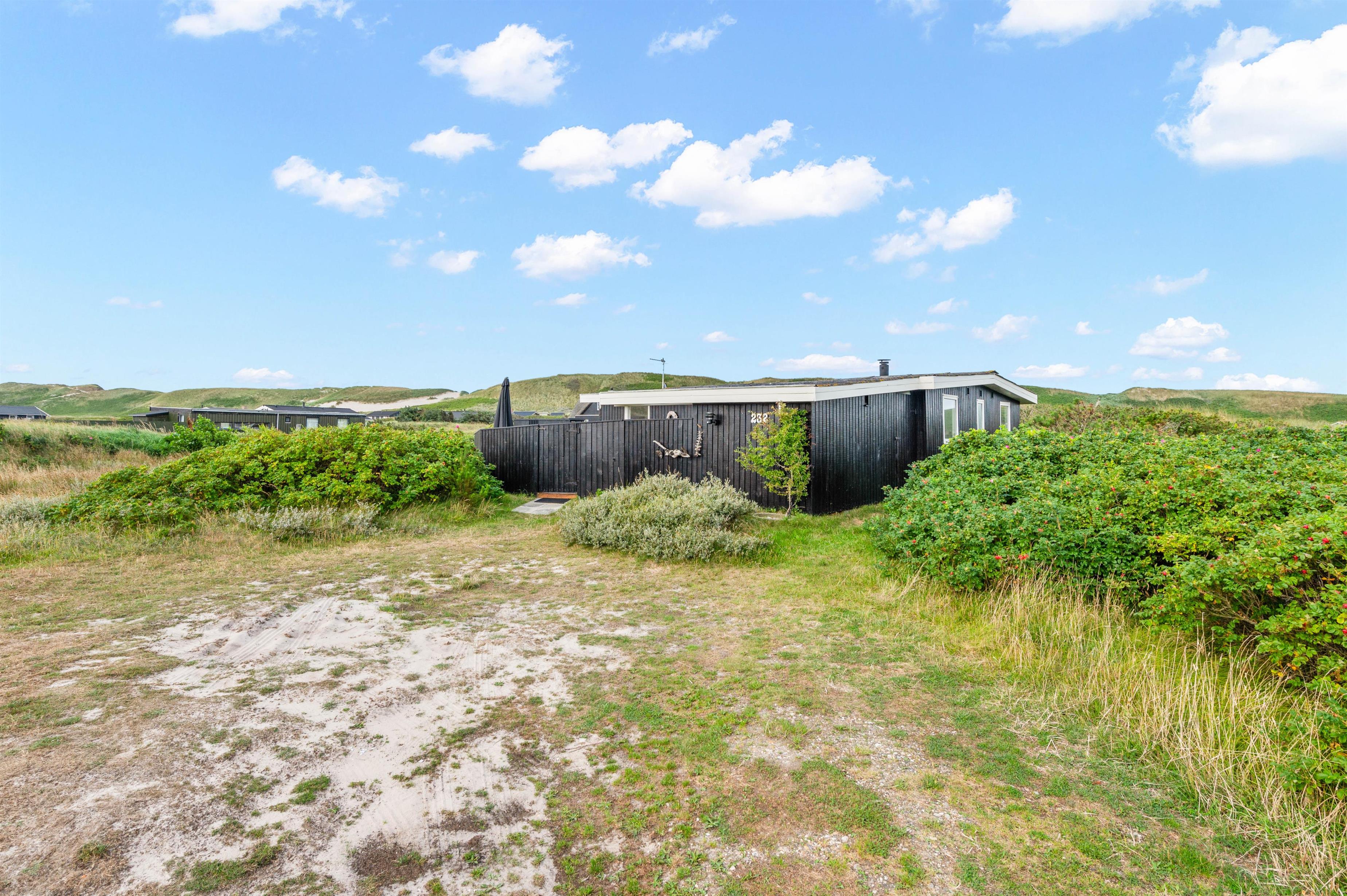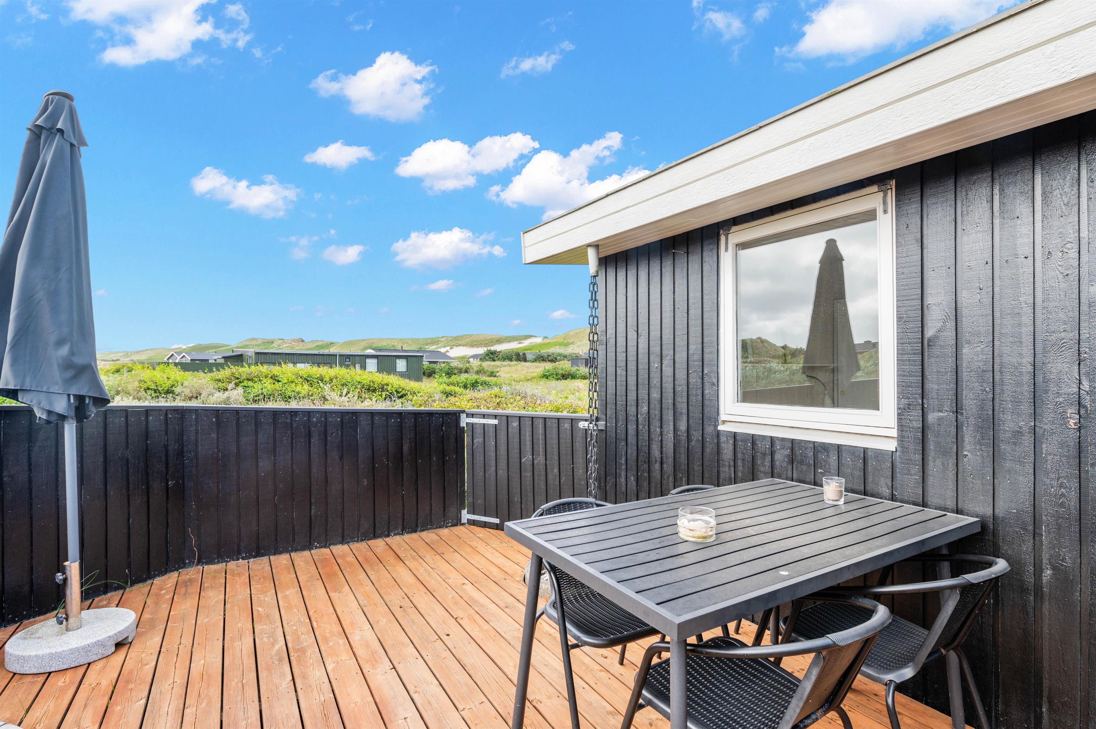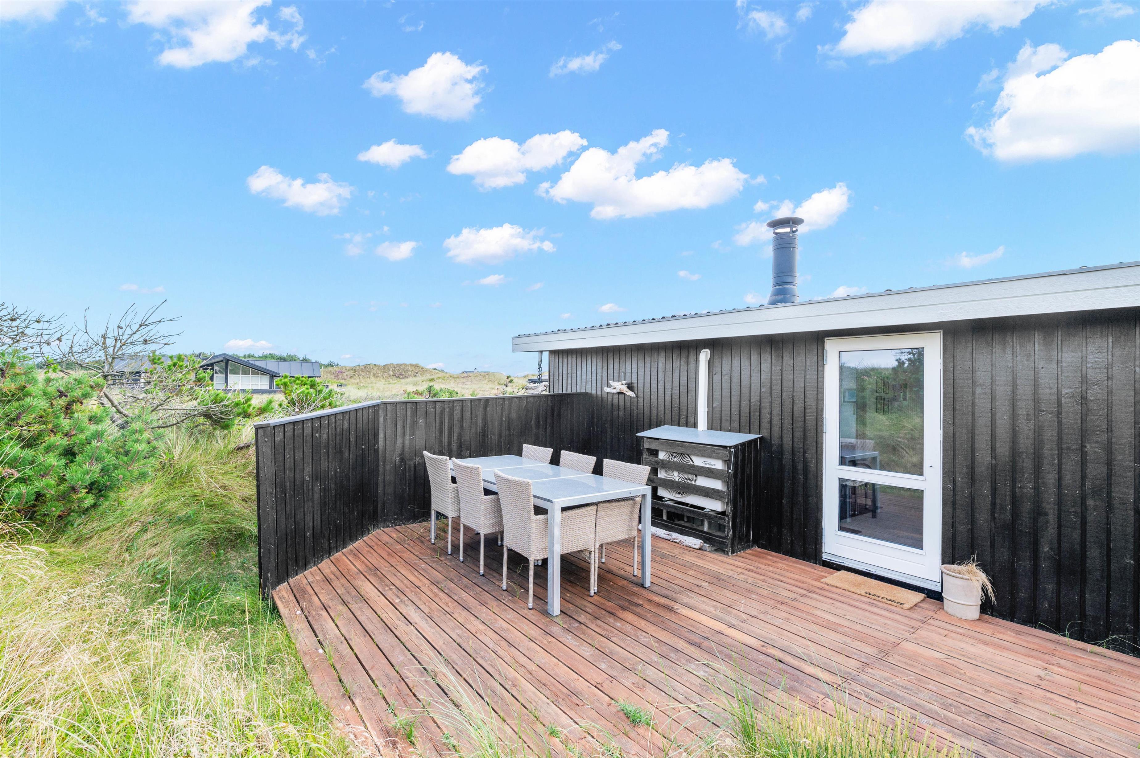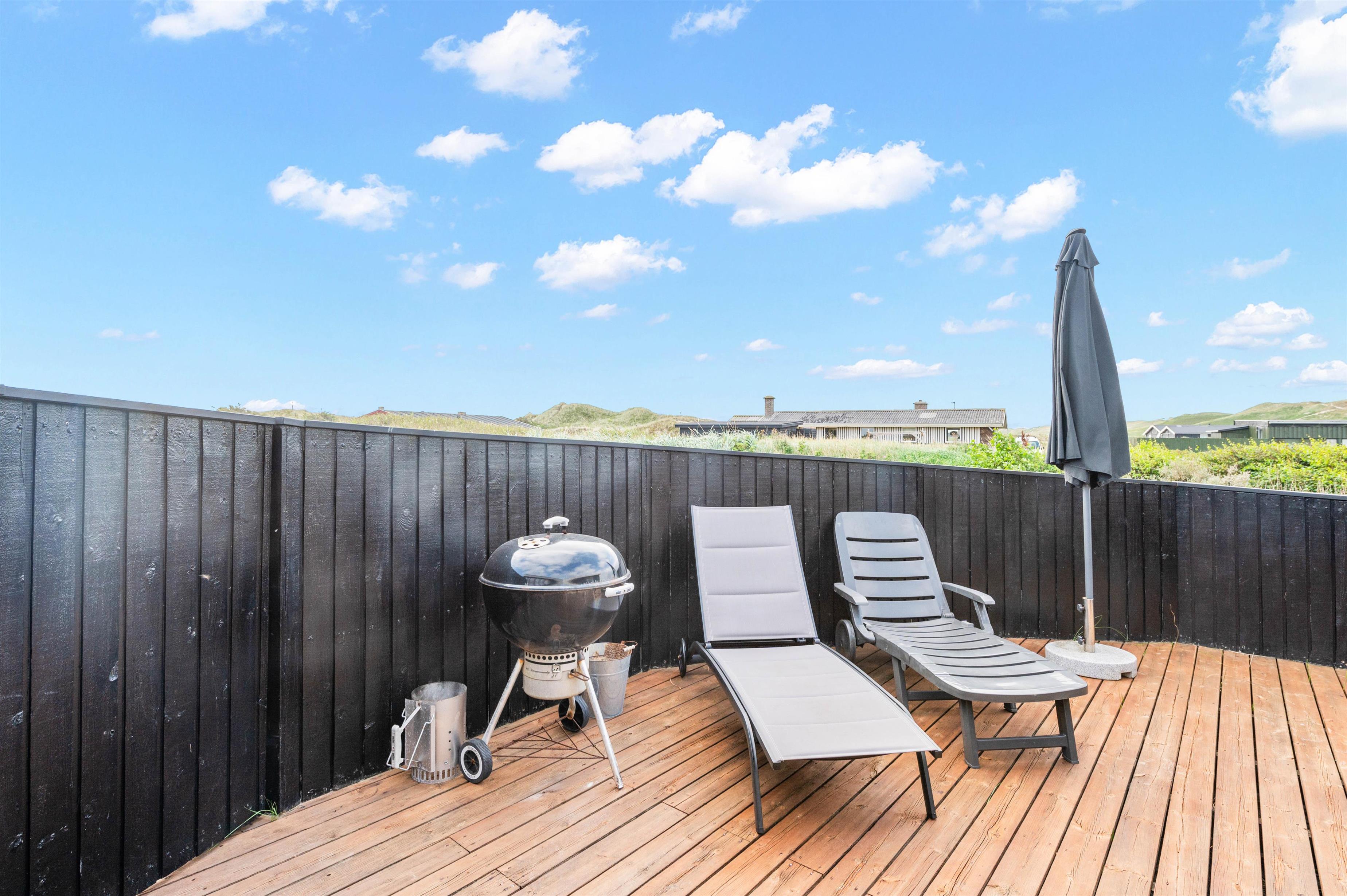 Sommerhuset ligger på en velvoksen naturgrund på 3000 m2. Med kun 250 meter til Vesterhavet vil du her mærke den friske brise og høre havet, når vindretningen er gunstig. Ved sommerhuset er der en stor og afskærmet terrasse med både spiseplads og lækroge. Her kan du finde læ og sol, og endda tørre badetøjet under halvtaget, så det er klar til næste dag.